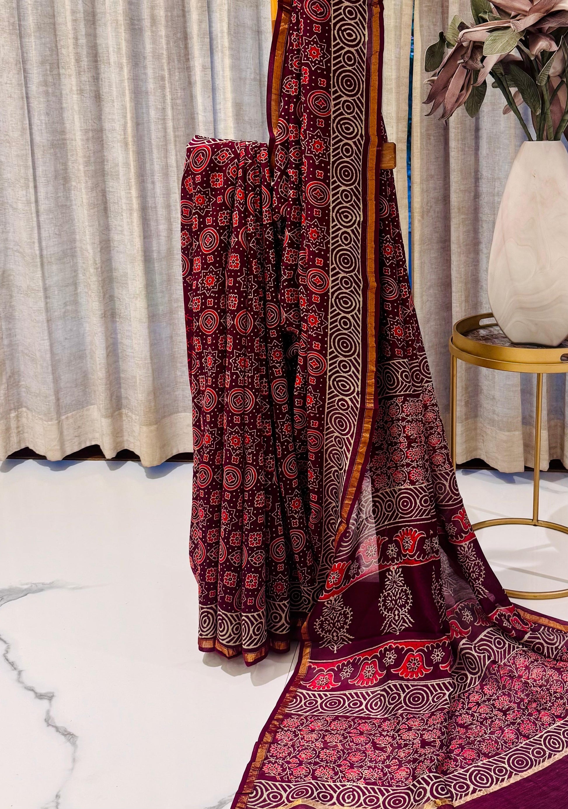 Step into timeless elegance with this exquisite Chanderi Cotton Saree in a deep maroon shade, beautifully adorned with intricate white Ajrak print. A fusion of heritage textile art and contemporary design, this saree showcases the finesse of Chanderi weaving combined with the bold, geometric motifs typical of Ajrak block printing.