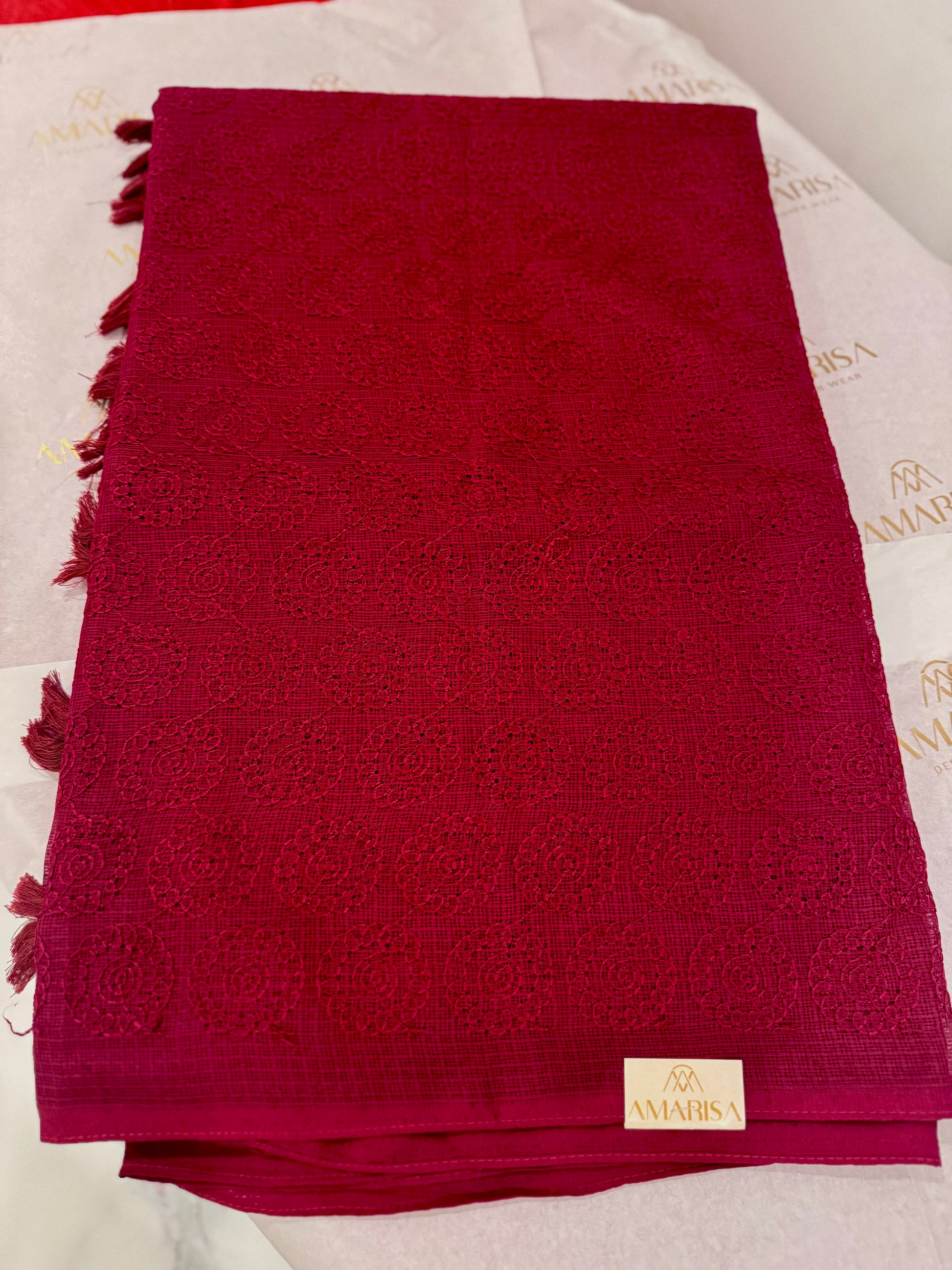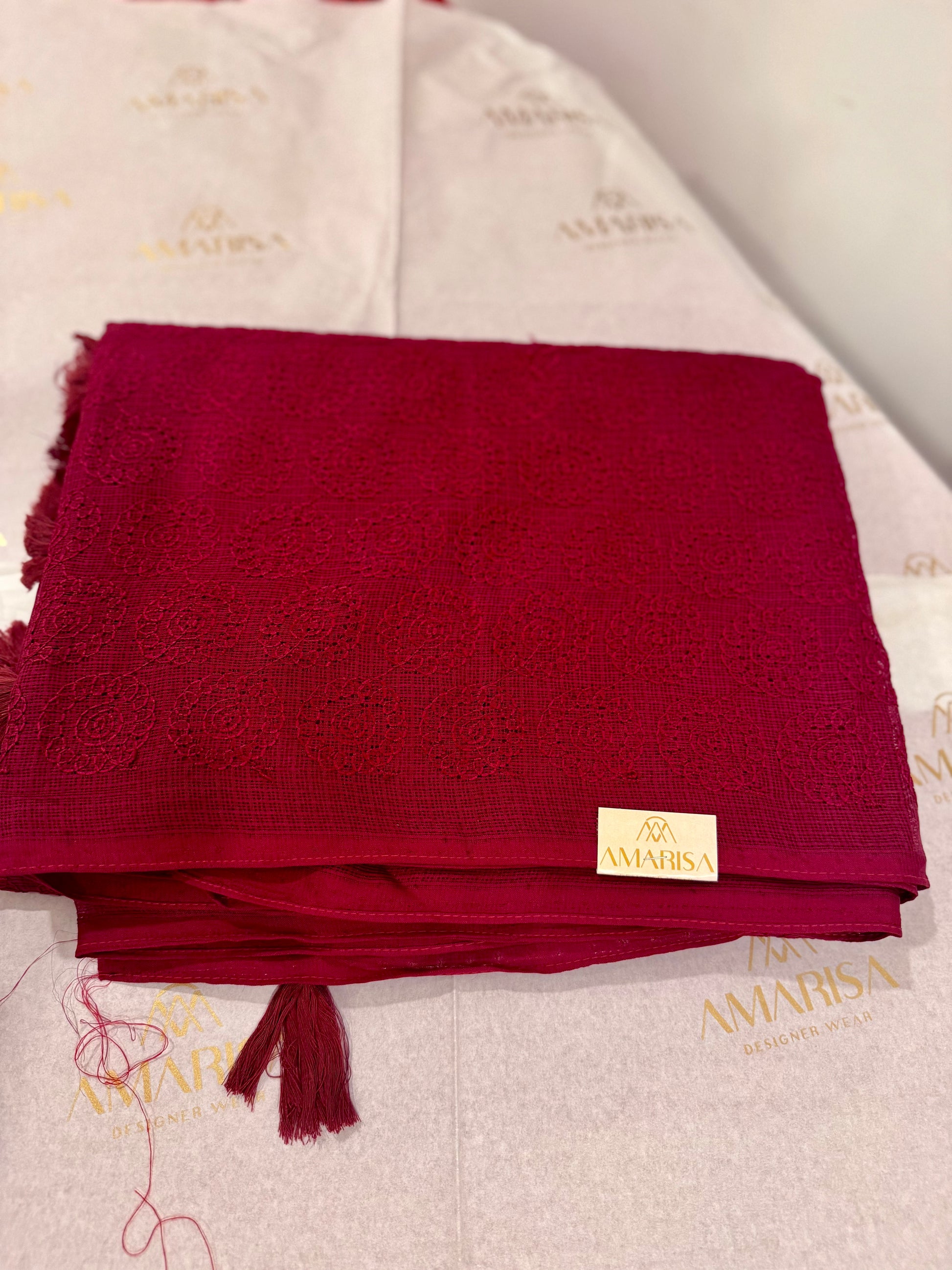 Drape yourself in understated elegance with this maroon Kota saree, adorned with delicate self-thread embroidery that blends seamlessly into the fabric for a refined, textured look. Lightweight and airy, the Kota weave ensures comfort, while the subtle embroidery adds a graceful charm, perfect for festive occasions or sophisticated day wear. Comes with a matching blouse piece to complete your ensemble.