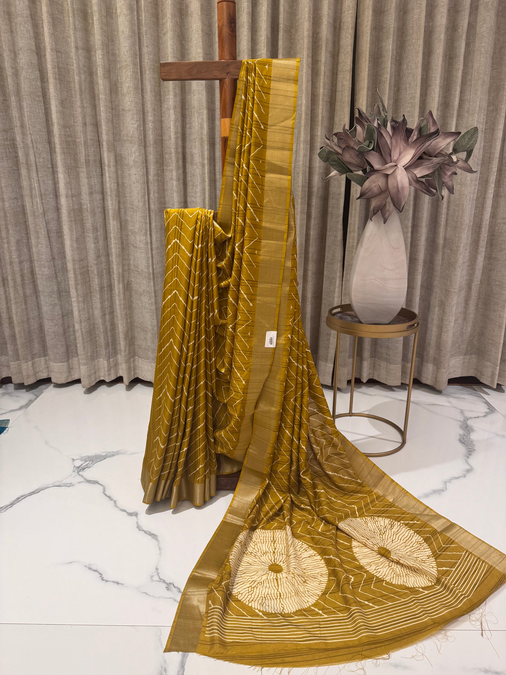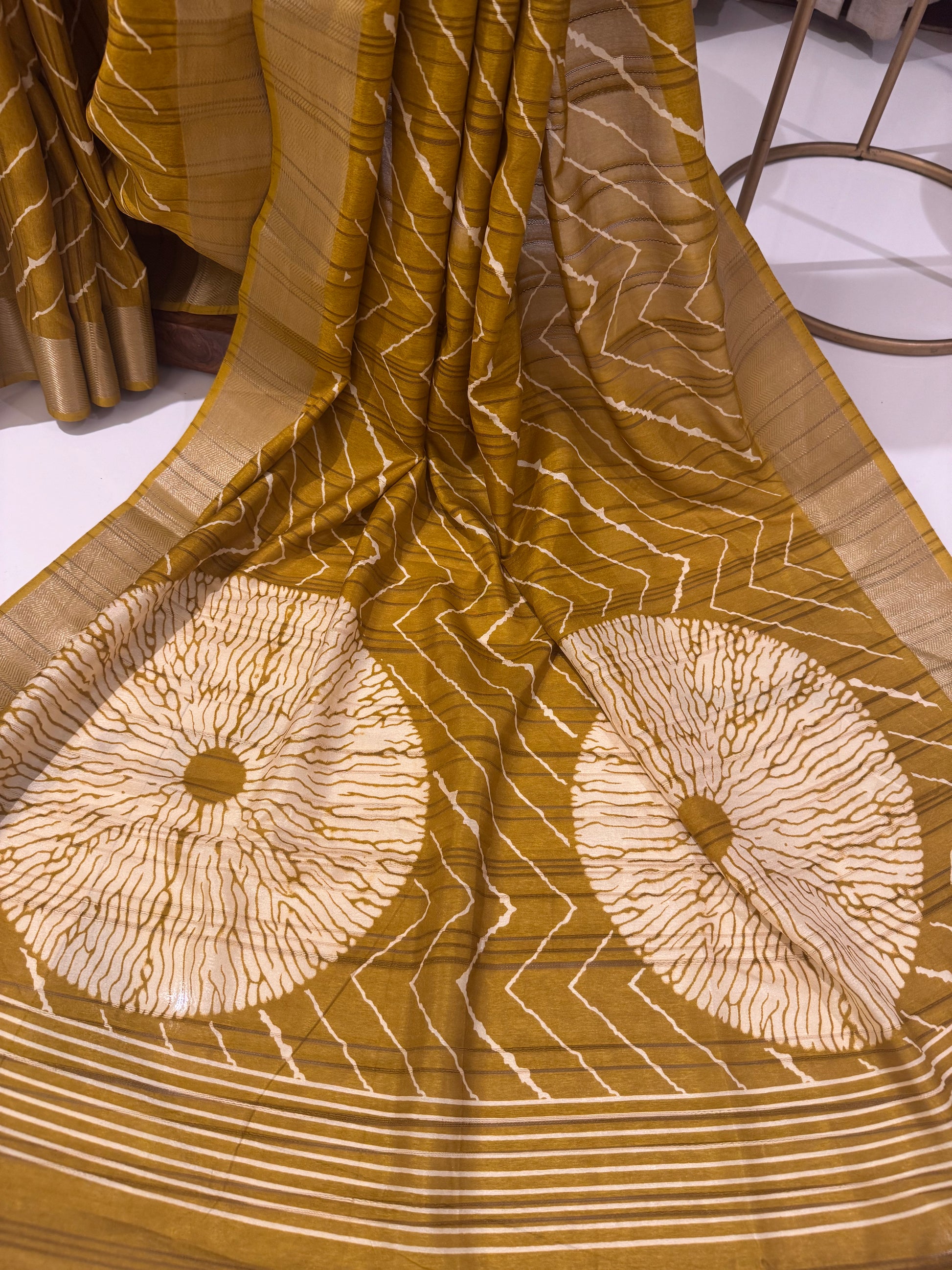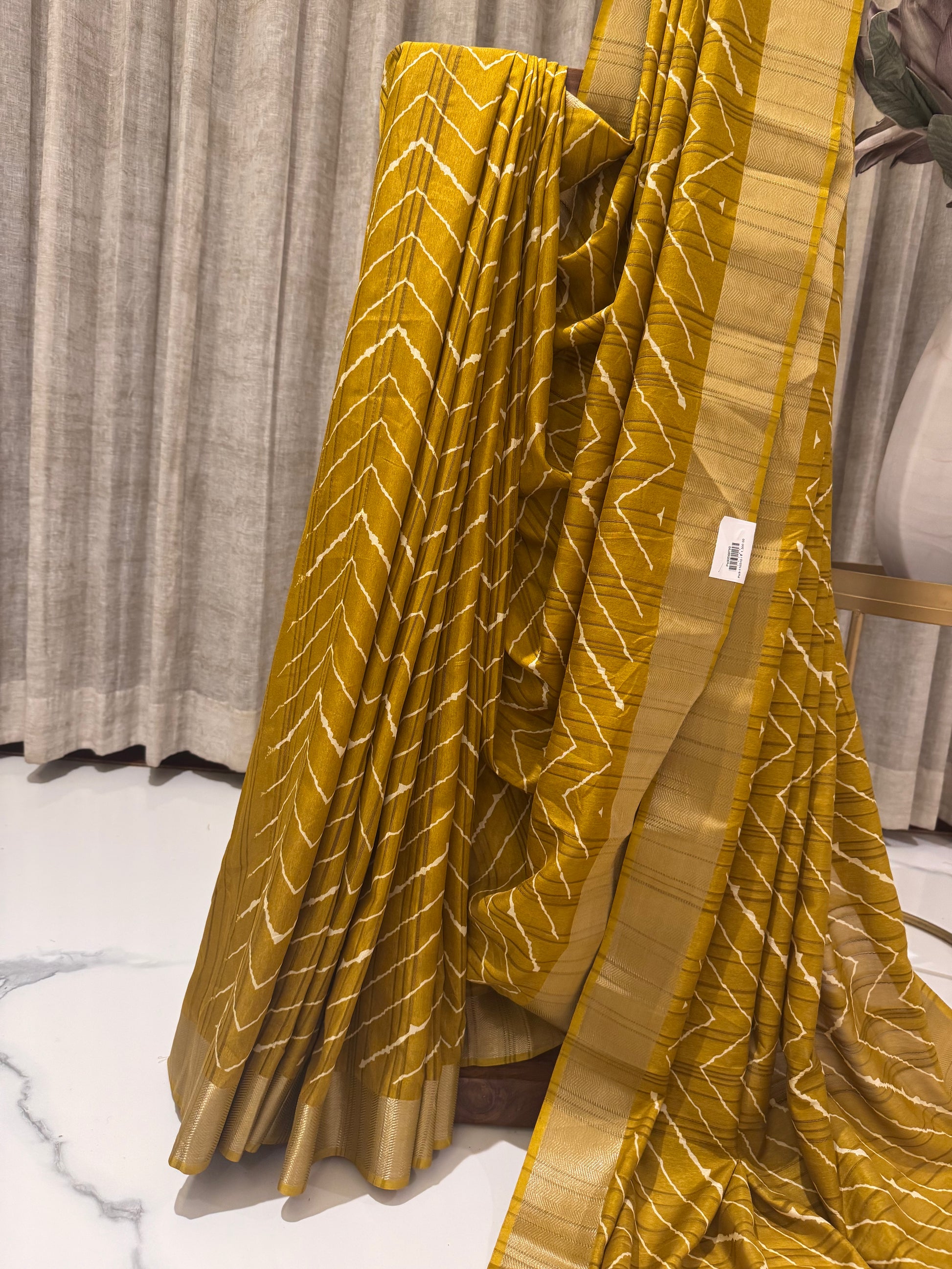 Elevate your ethnic wardrobe with this elegant Mustard Yellow Semi Tussar Saree, designed to blend timeless tradition with modern aesthetics. Crafted from soft, breathable semi tussar fabric, this saree features a contemporary pattern of white asymmetrical stripes that add a subtle visual flair and sophistication to its classic mustard yellow base.