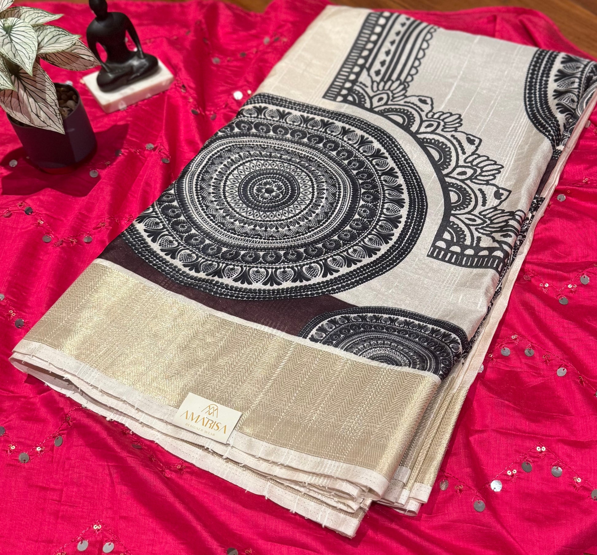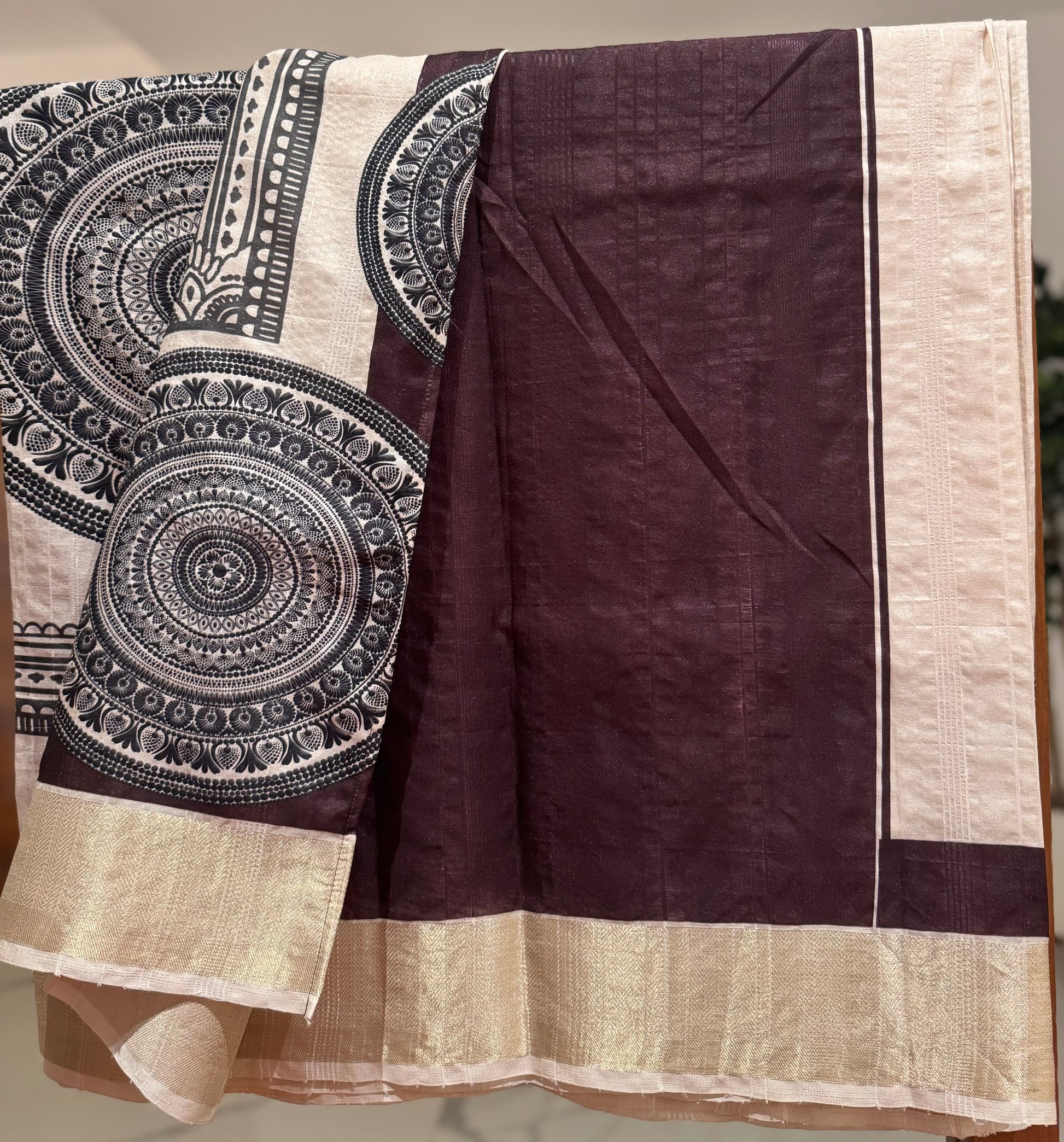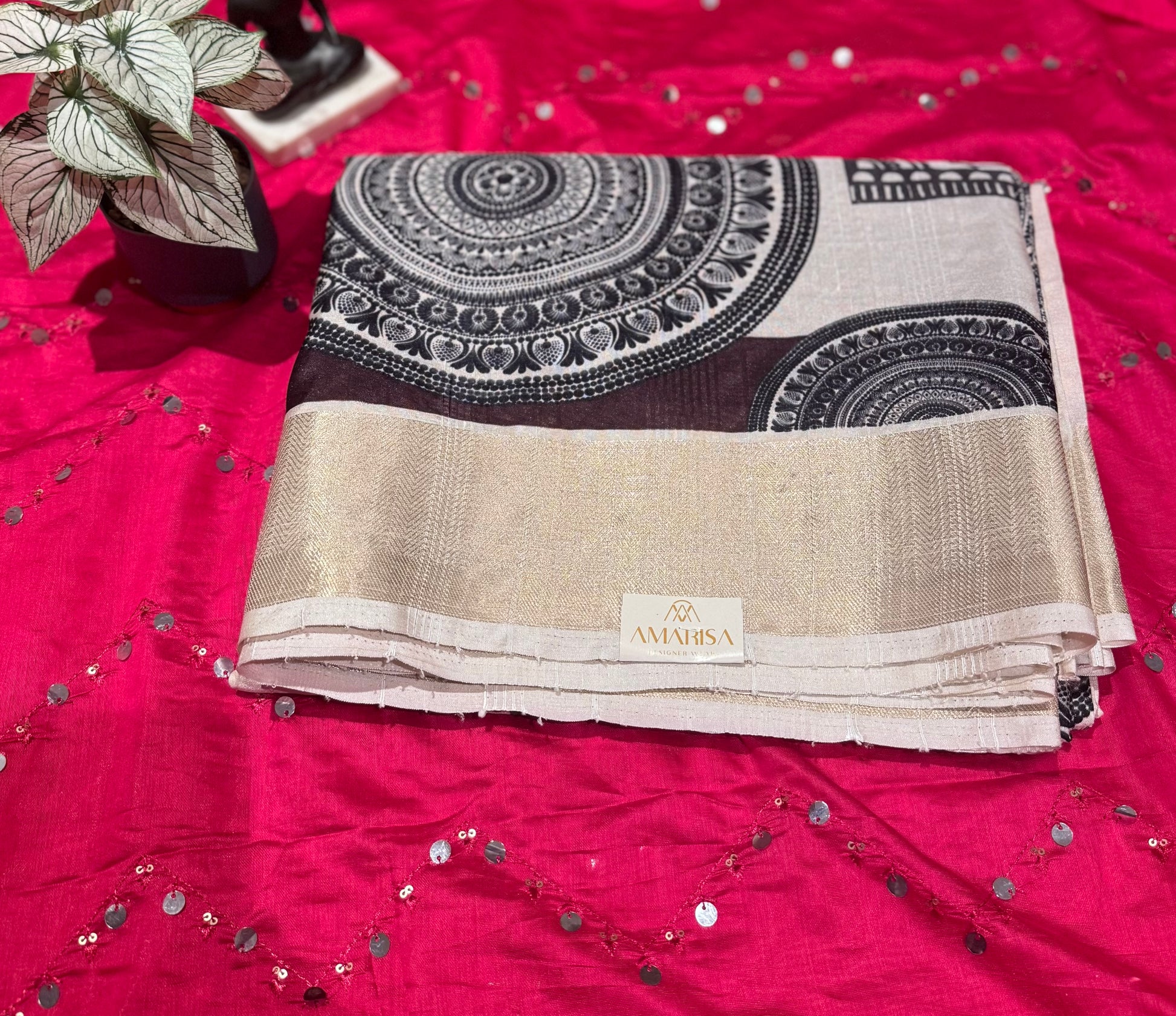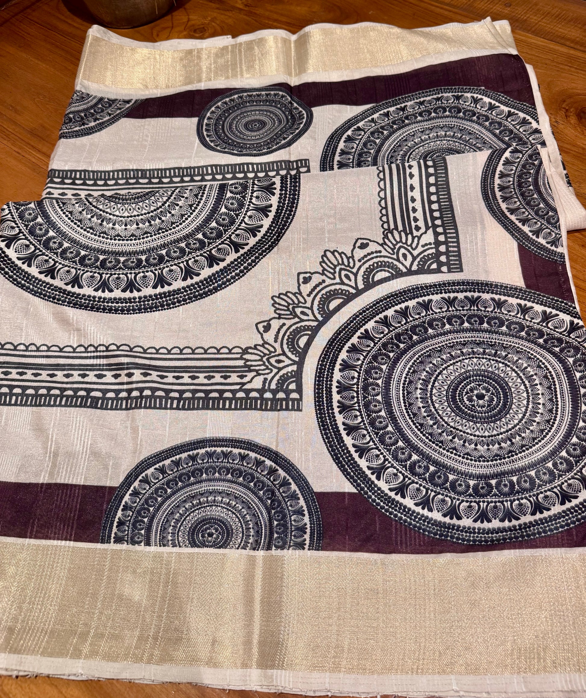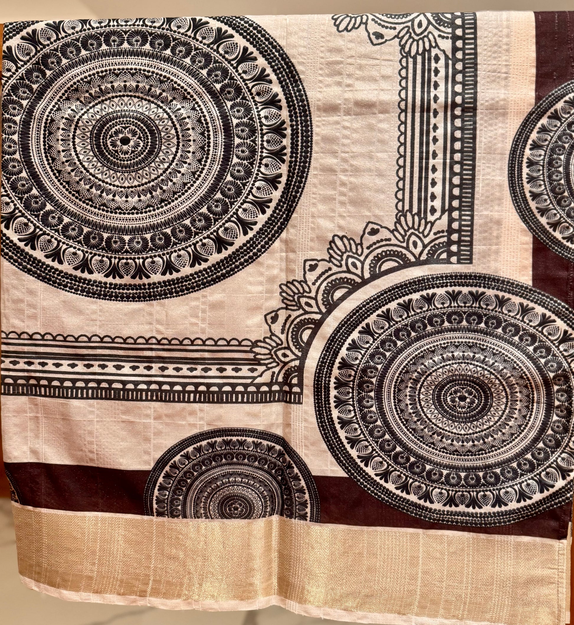 Off-White Semi Tussar Saree with Mandala Art & Coffee Brown Blouse