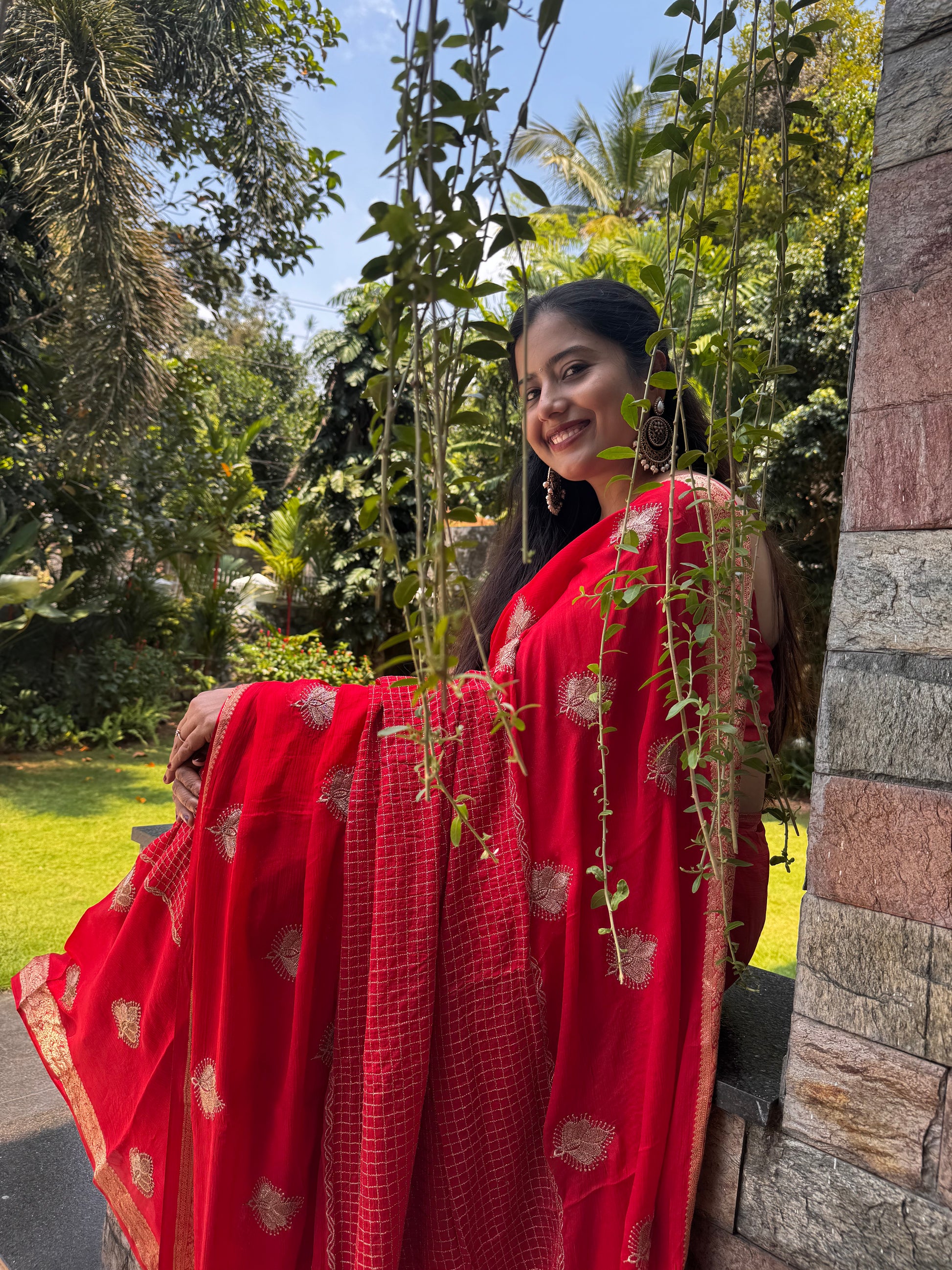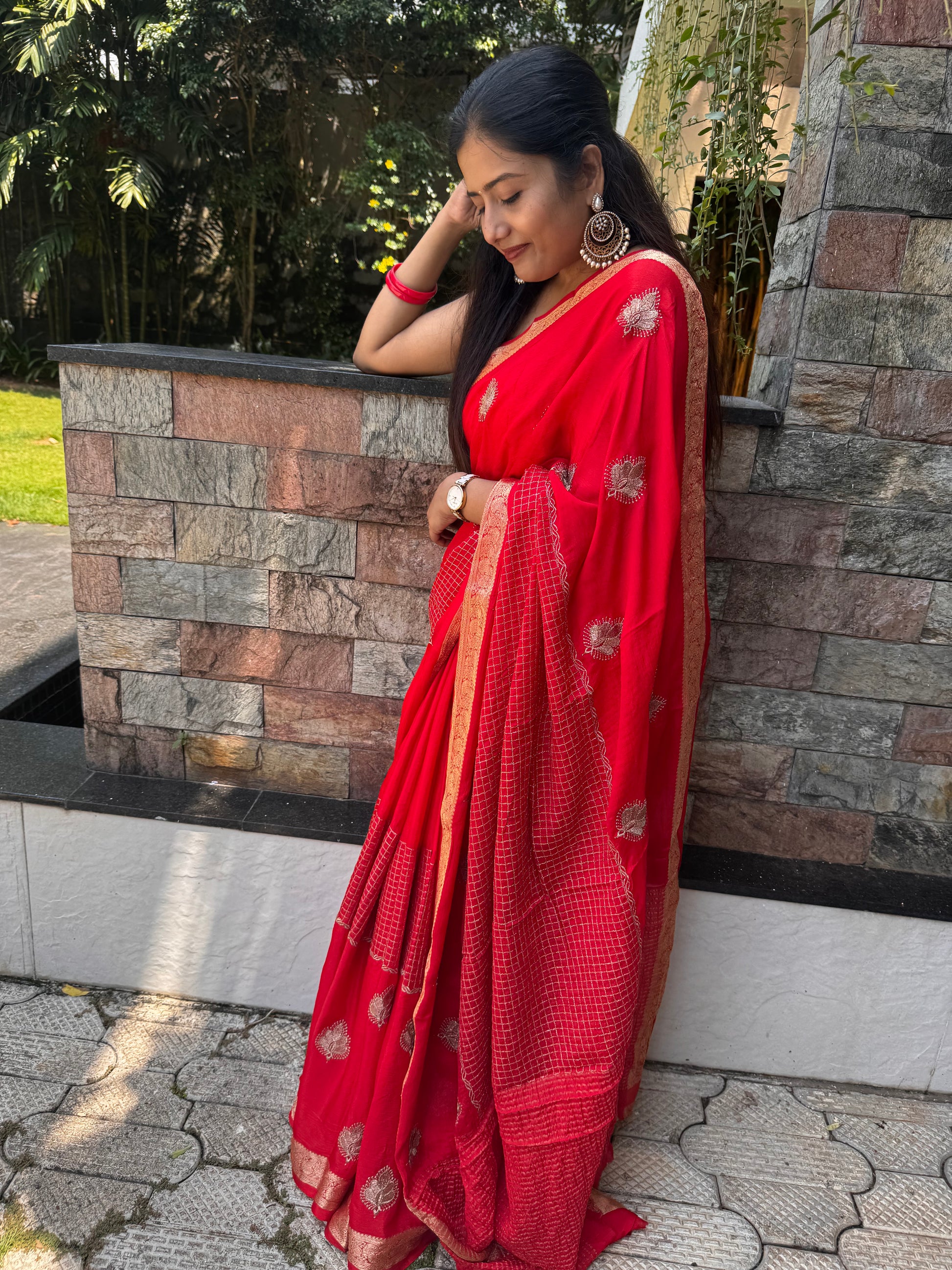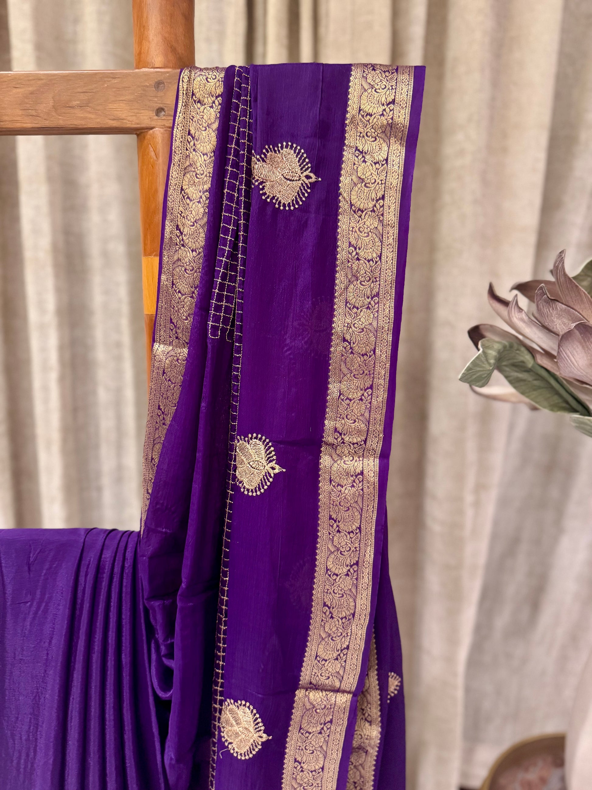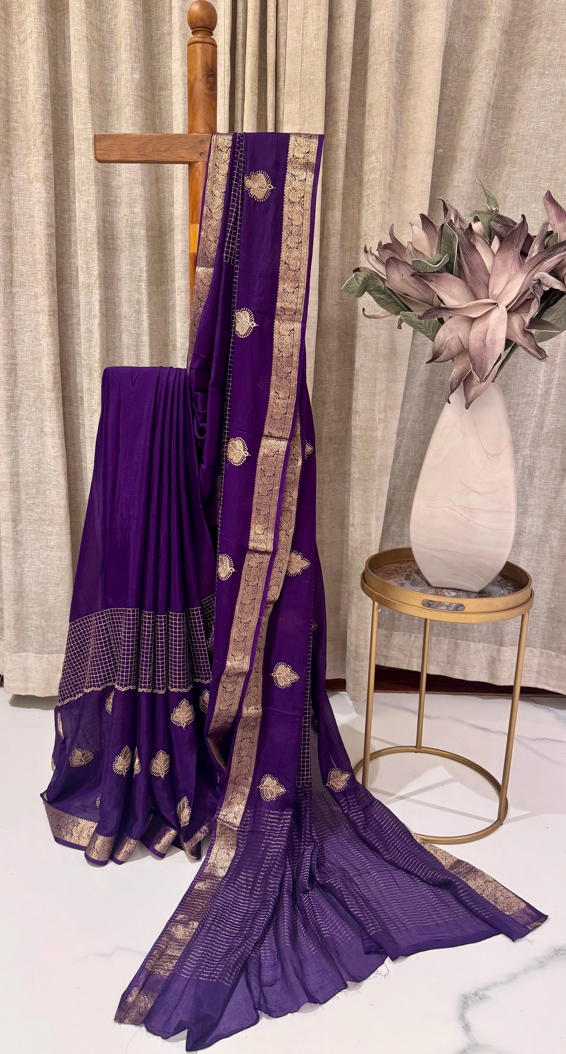 Chinon chiffon sarees having beautiful embroidery design and a concept of zari embroidery which looks like weaving all over with jacquard border.