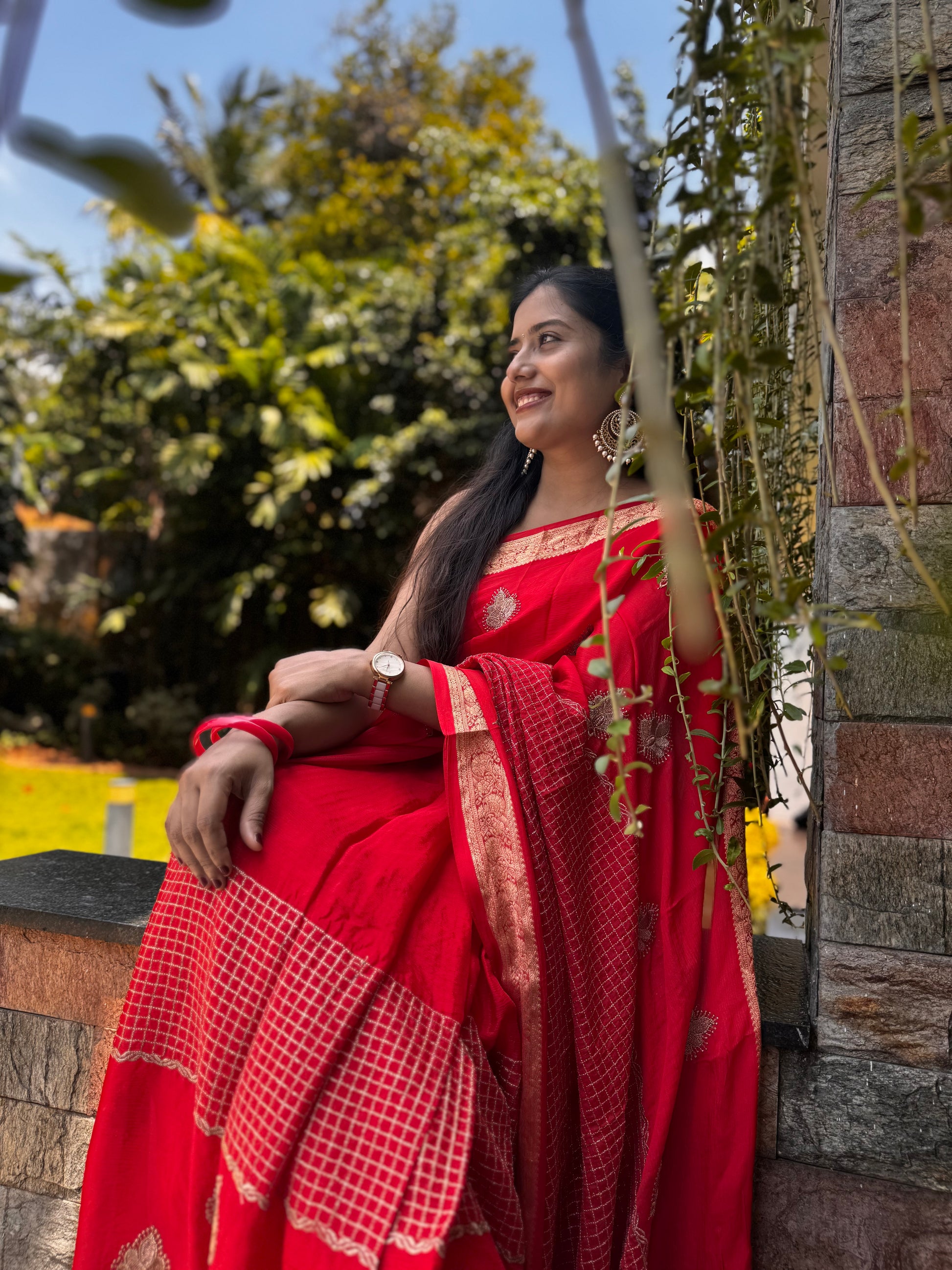With a contrast bright yellowish green contrast butti blouse for violet saree and bottle green blouse for red saree
