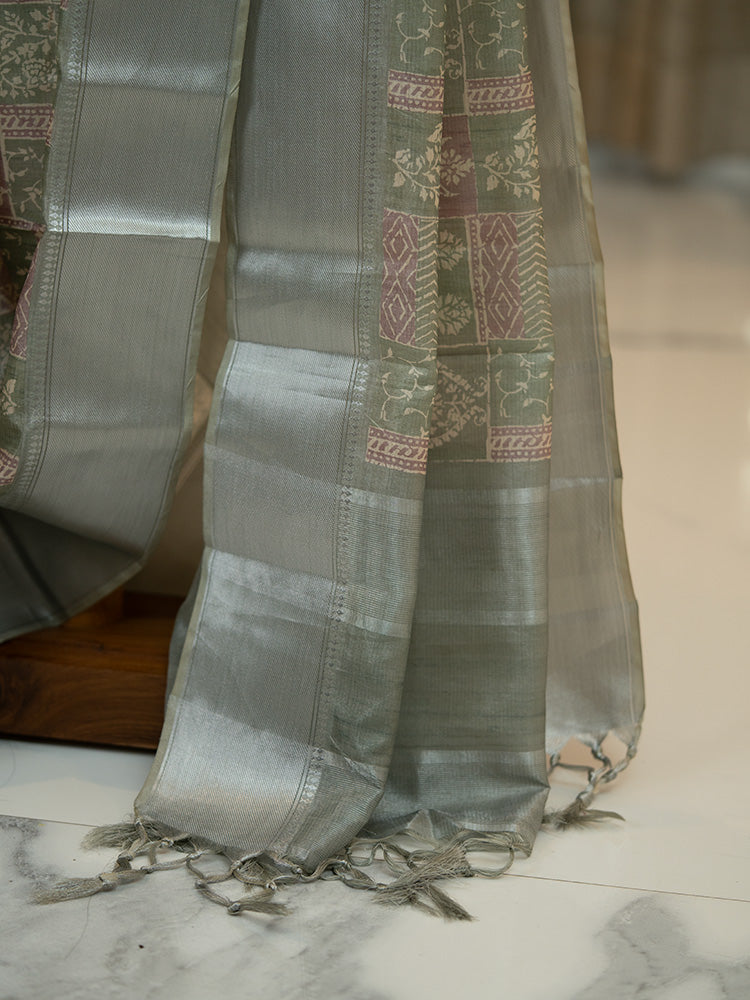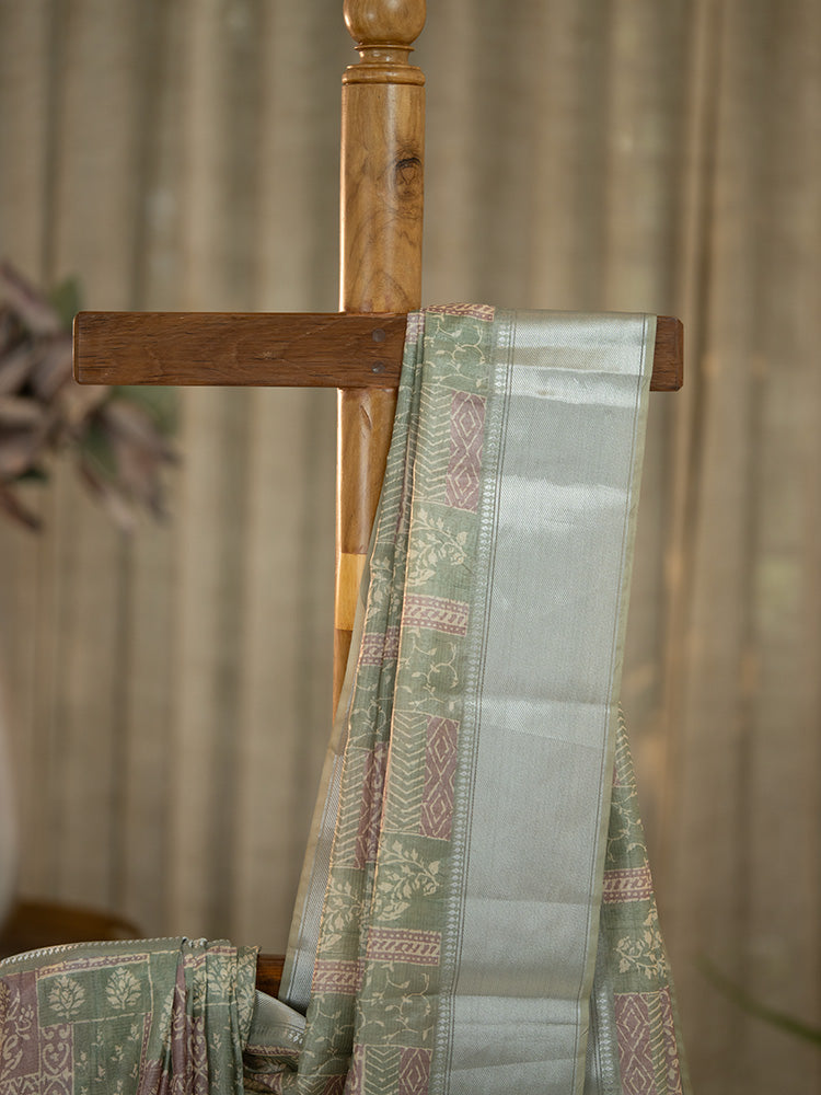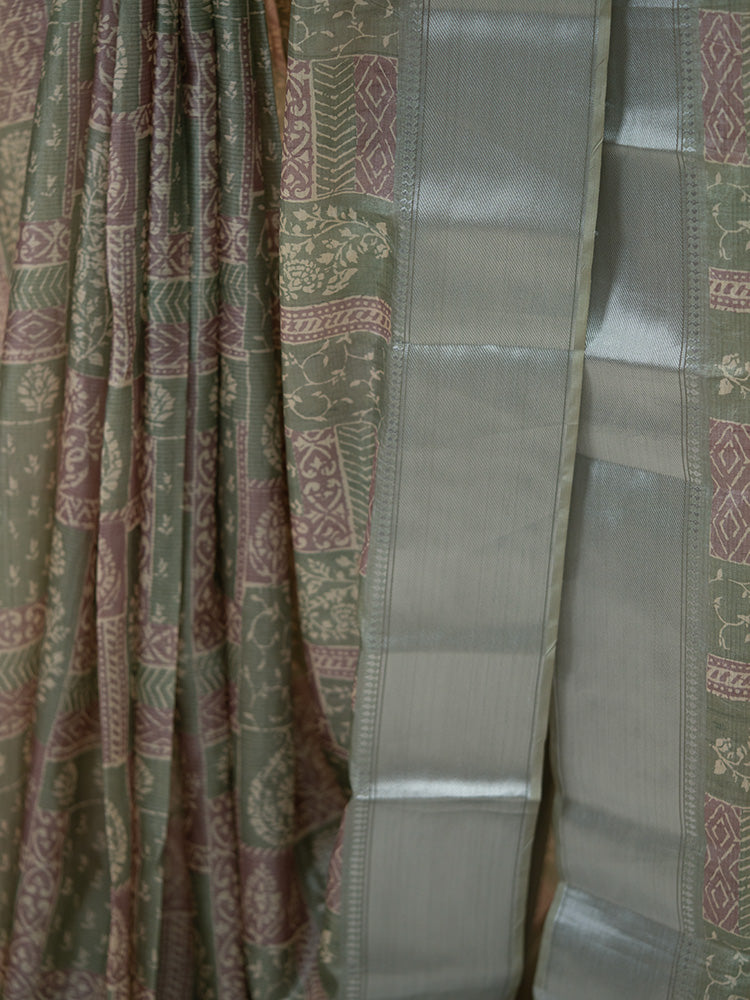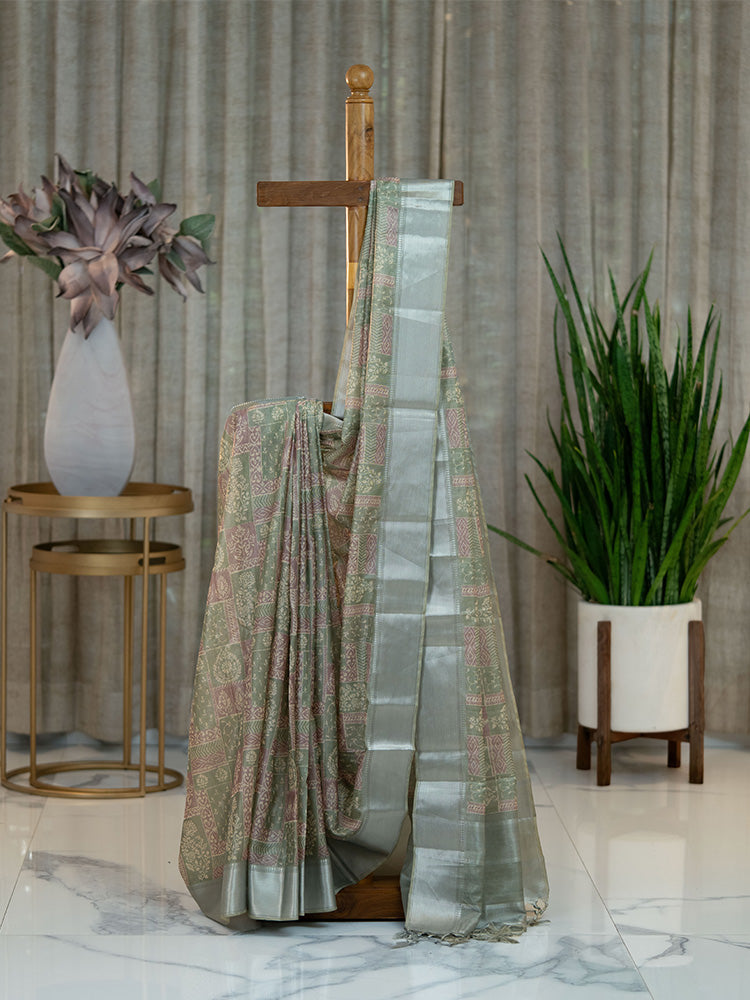 Printed Tissue Silk Saree in Sage Green with Silver Zari Border