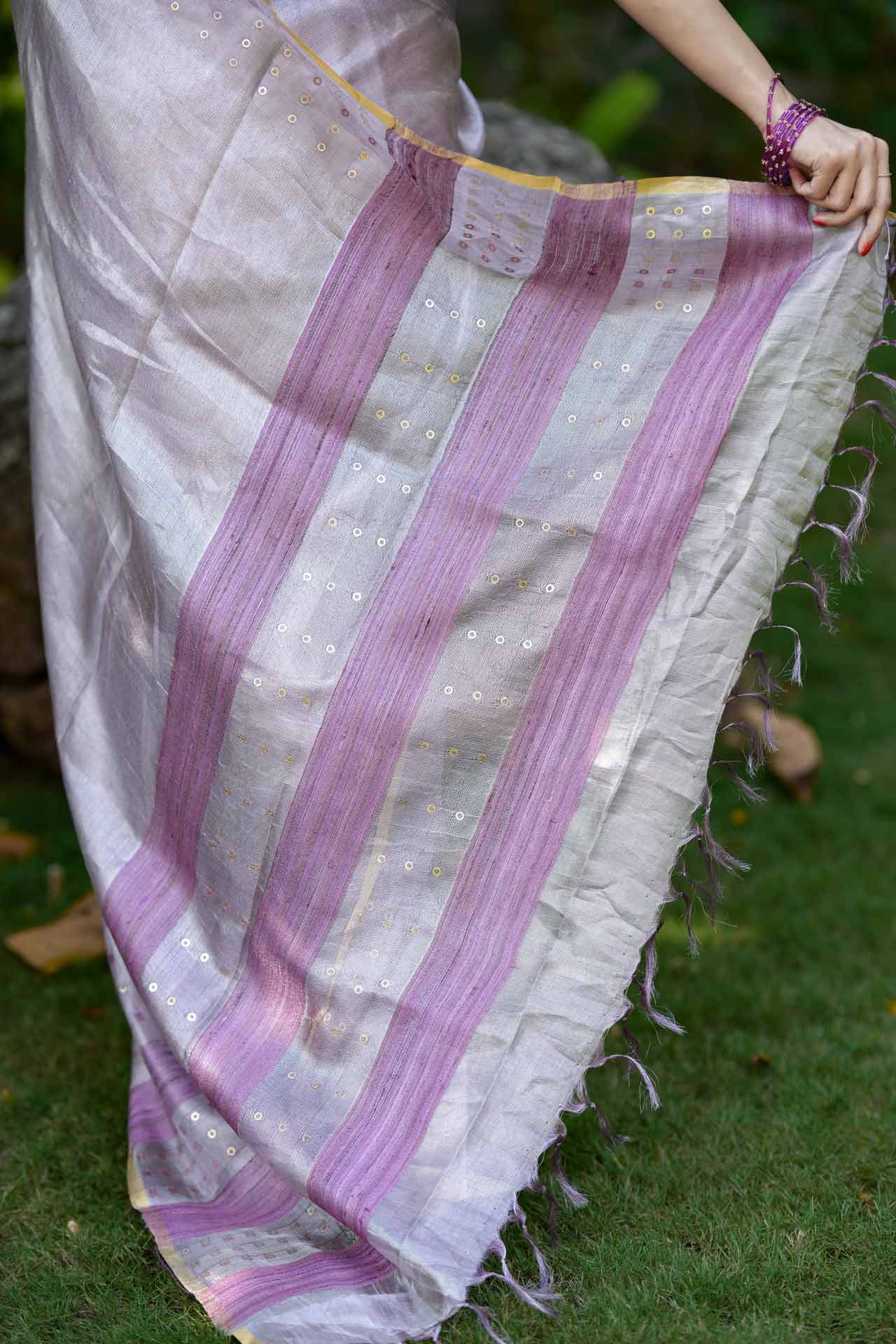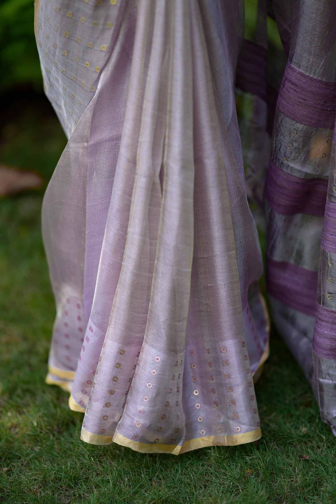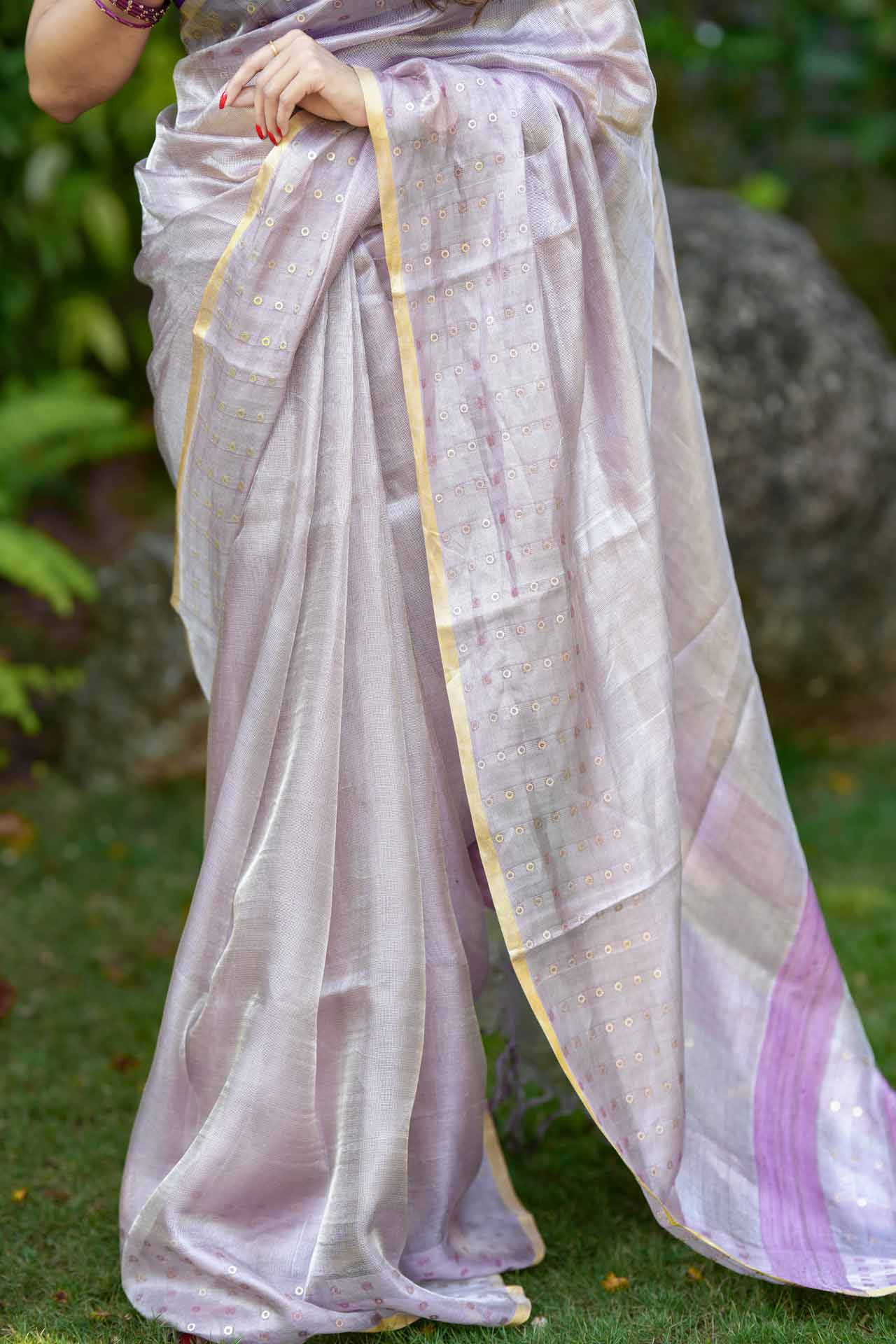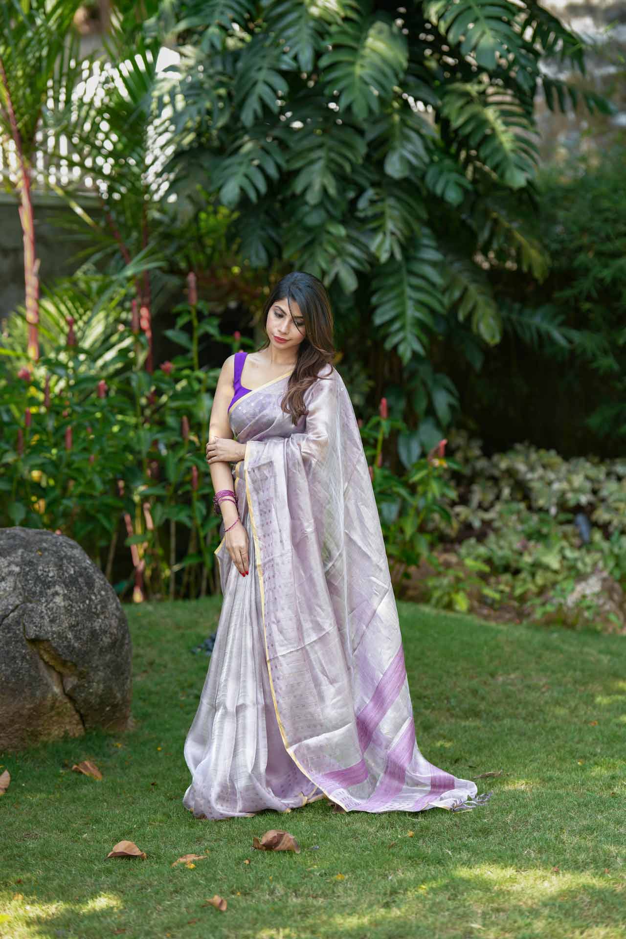 Pure Tissue Silk Saree in Lavender Shade with Golden Zari & Metallic Work – A Regal Blend of Sheen & Elegance
