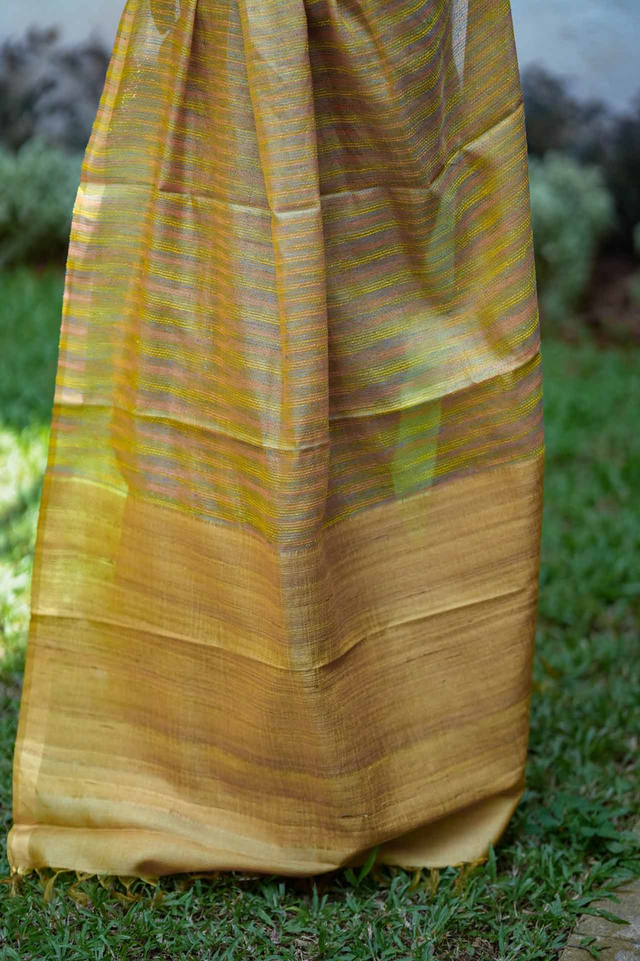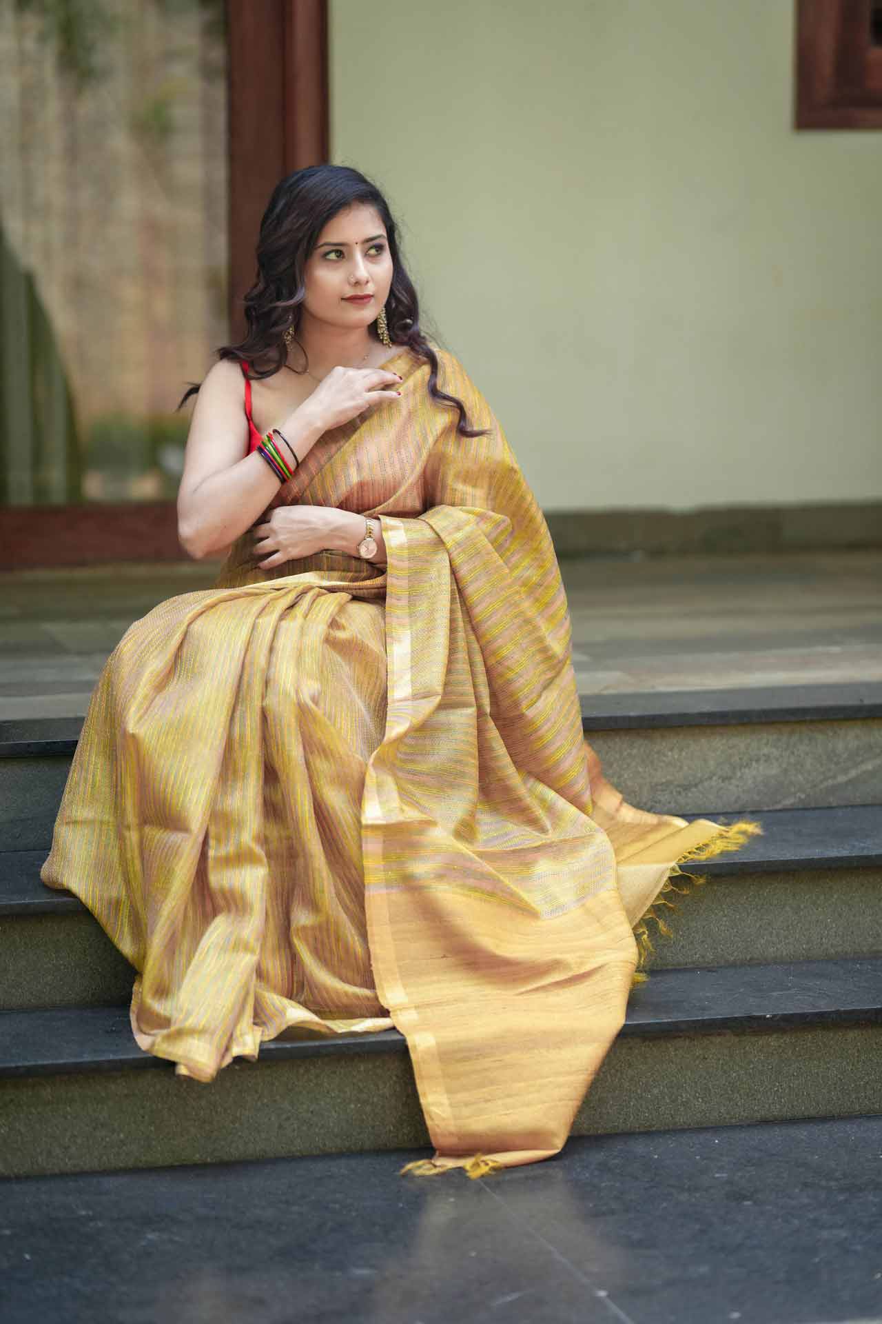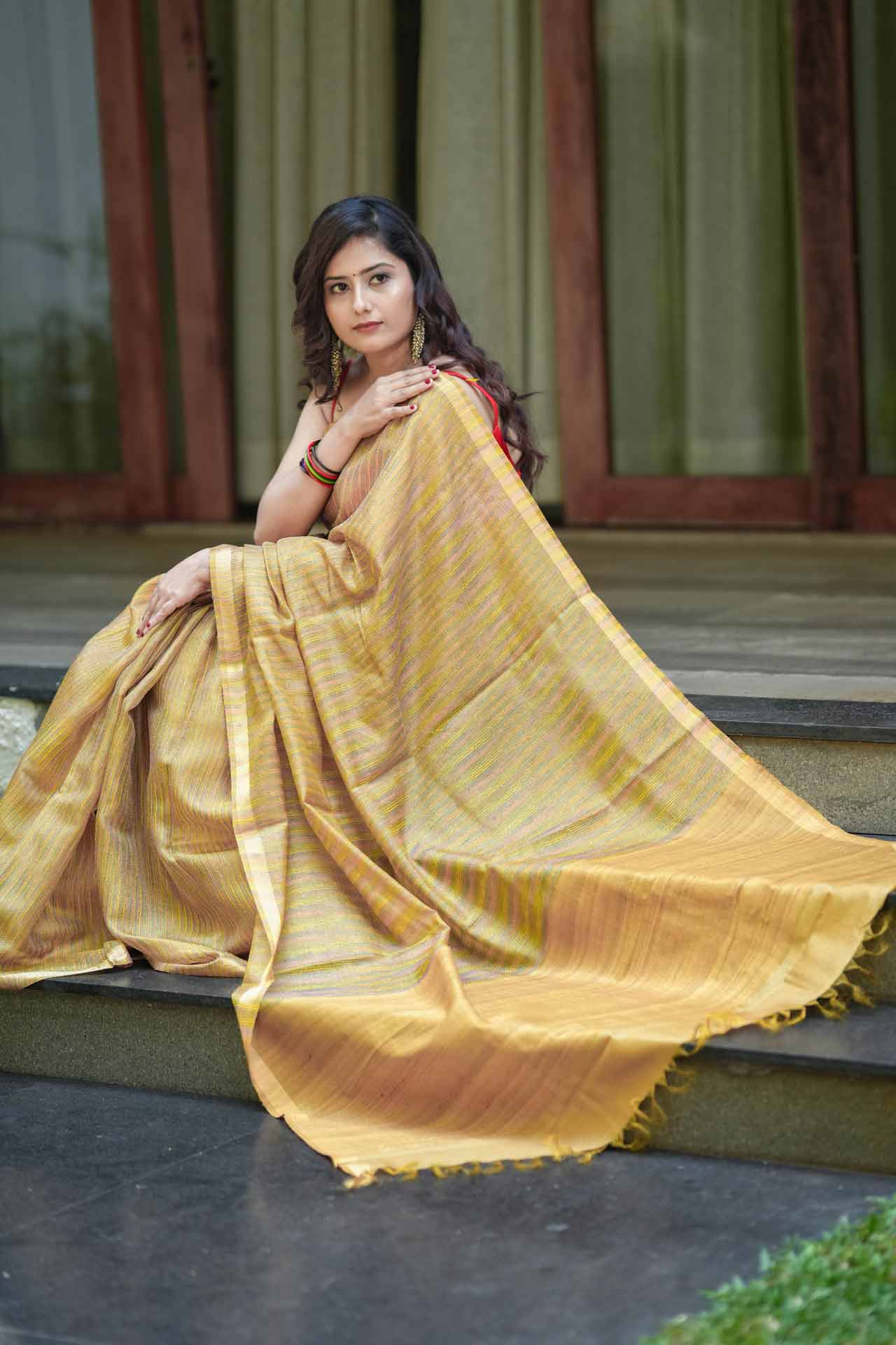 Drape yourself in the richness of tradition with this Pure Tussar Silk Saree in a stunning mustard yellow shade, adorned with intricate and vibrant thread work across the body. The natural texture of tussar silk, combined with elaborate embroidery, makes this saree a unique statement piece—perfect for festive occasions, weddings, and cultural events.