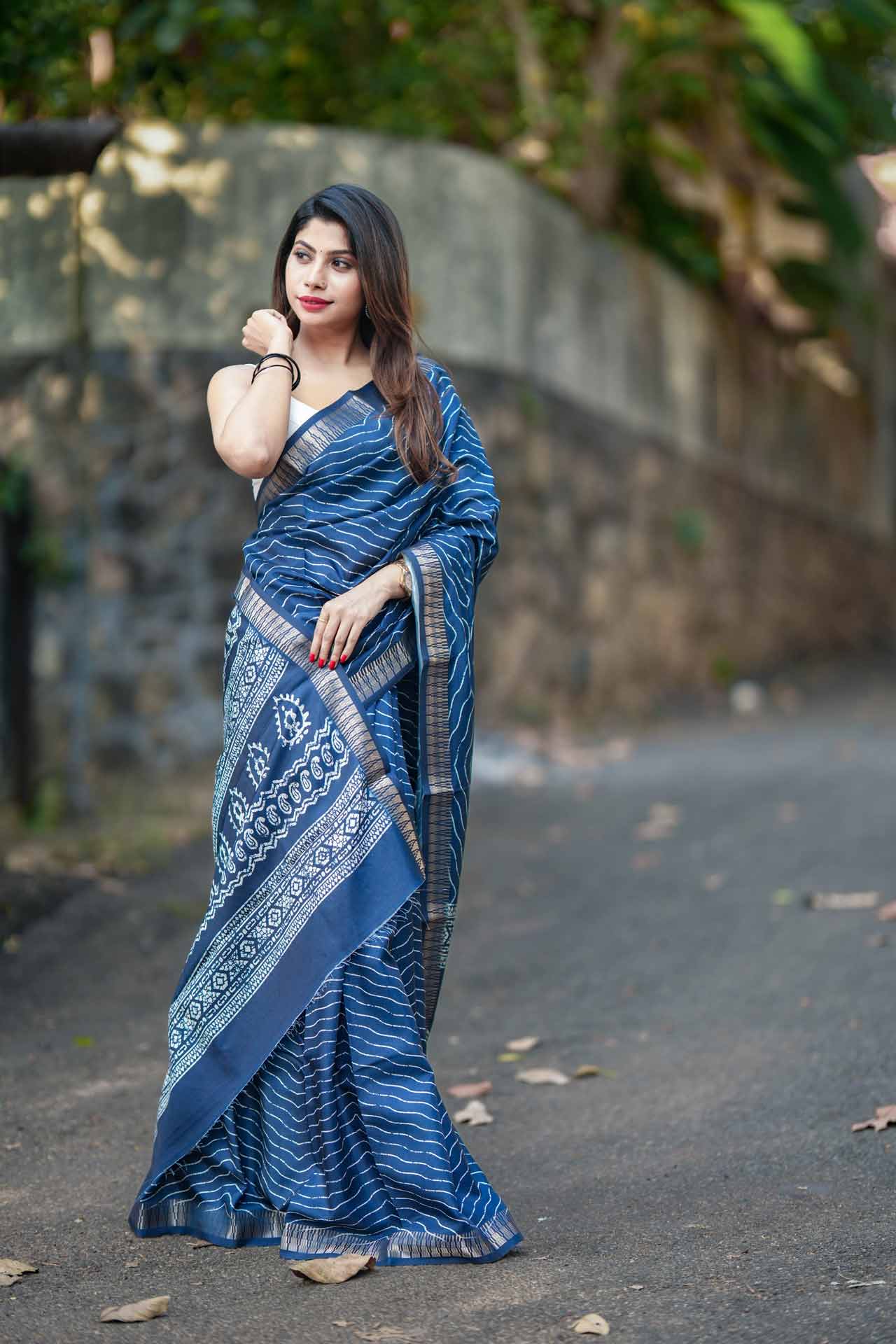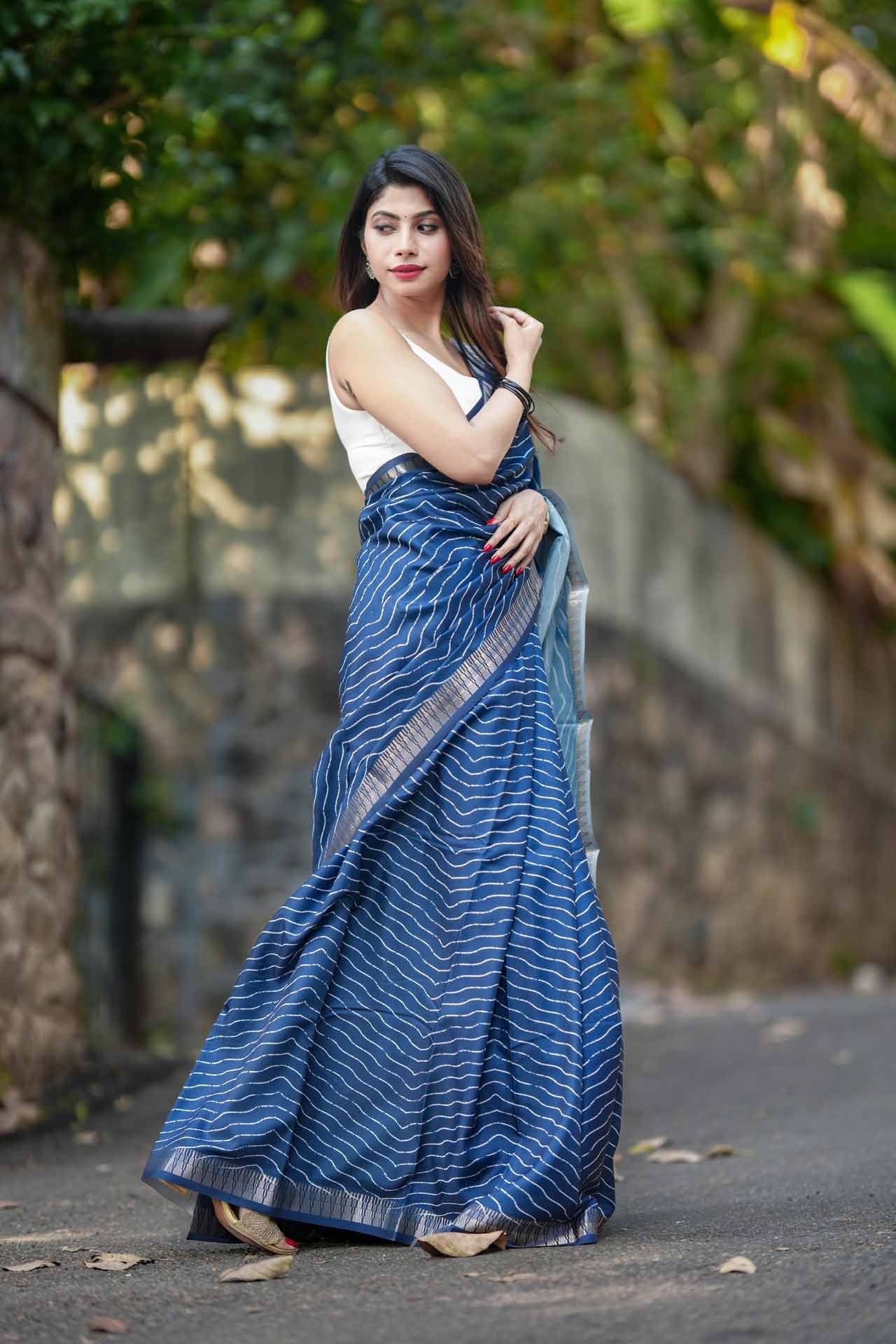 Make a bold yet elegant statement with this Semi Tussar Silk Saree in classic navy blue, beautifully designed with white diagonal stripes across the body and a rich golden zari border. This saree effortlessly blends contemporary design with traditional craftsmanship, making it perfect for festive occasions, office wear, and evening gatherings.