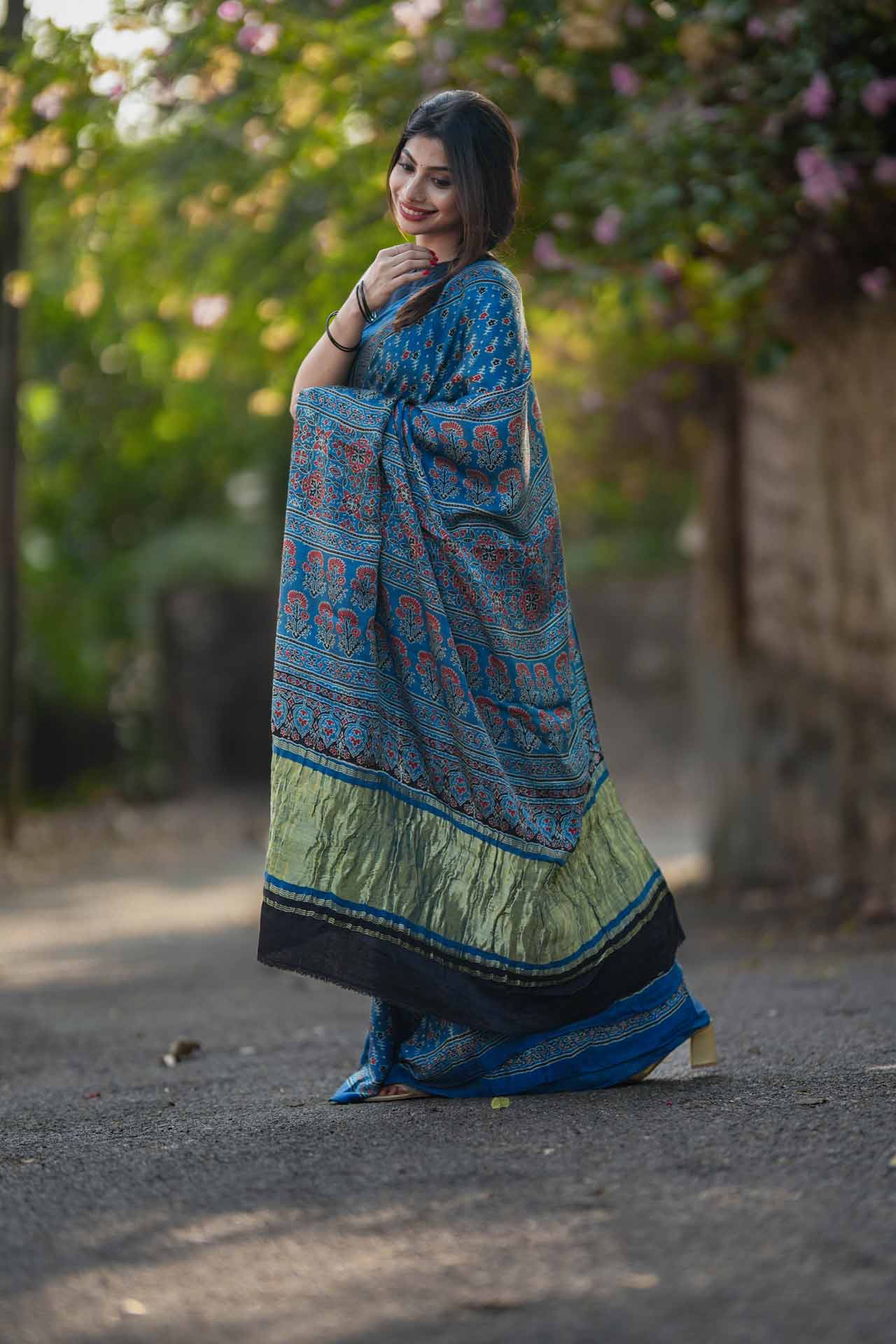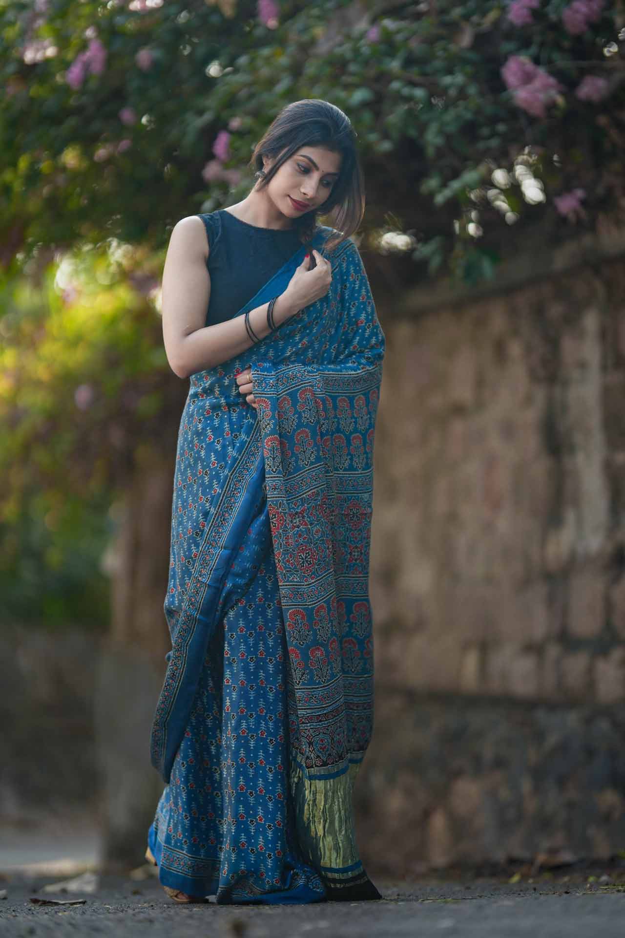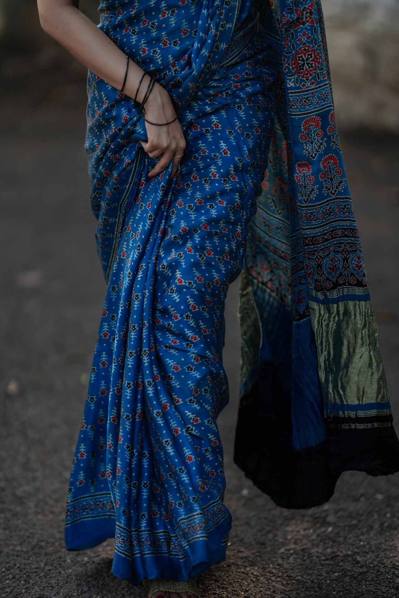 Pure Modal Silk Saree in Denim Blue with Ajrak Print – A Blend of Tradition & Modern Elegance