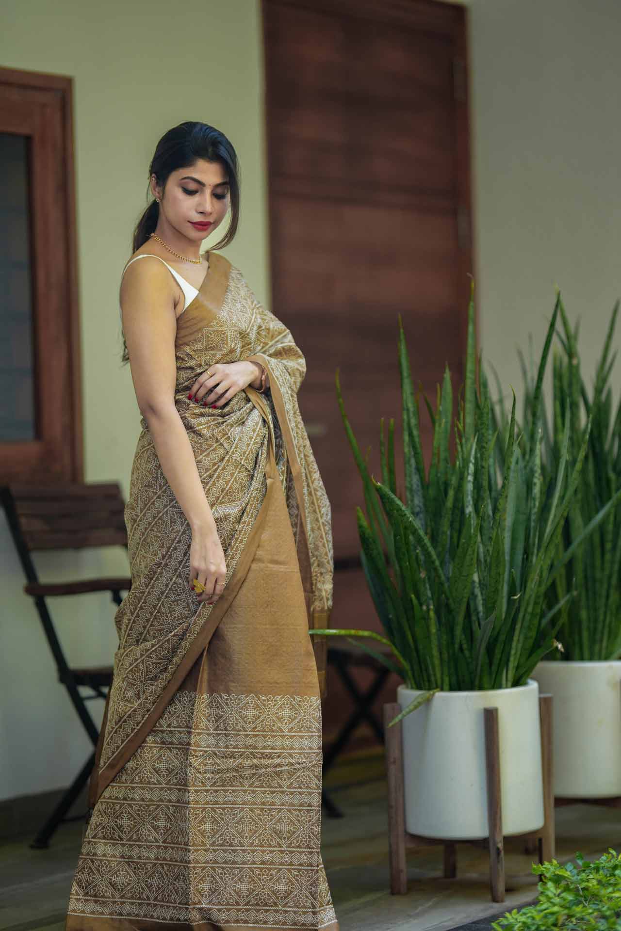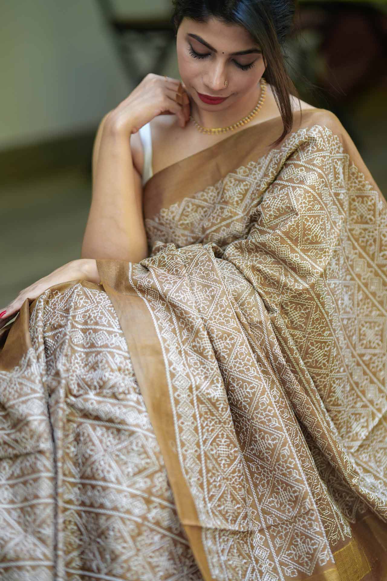 Tussar Silk Saree in Sepia Shade with White Embroidered Work – A Timeless Handcrafted Masterpiece