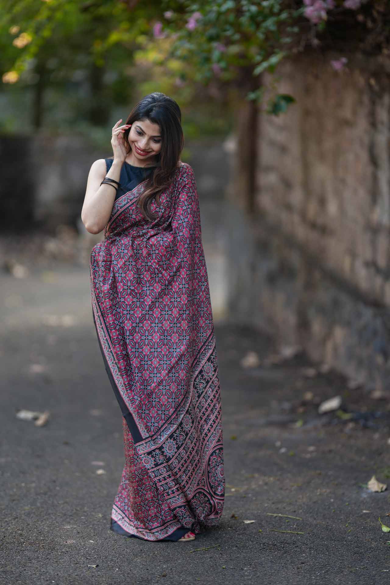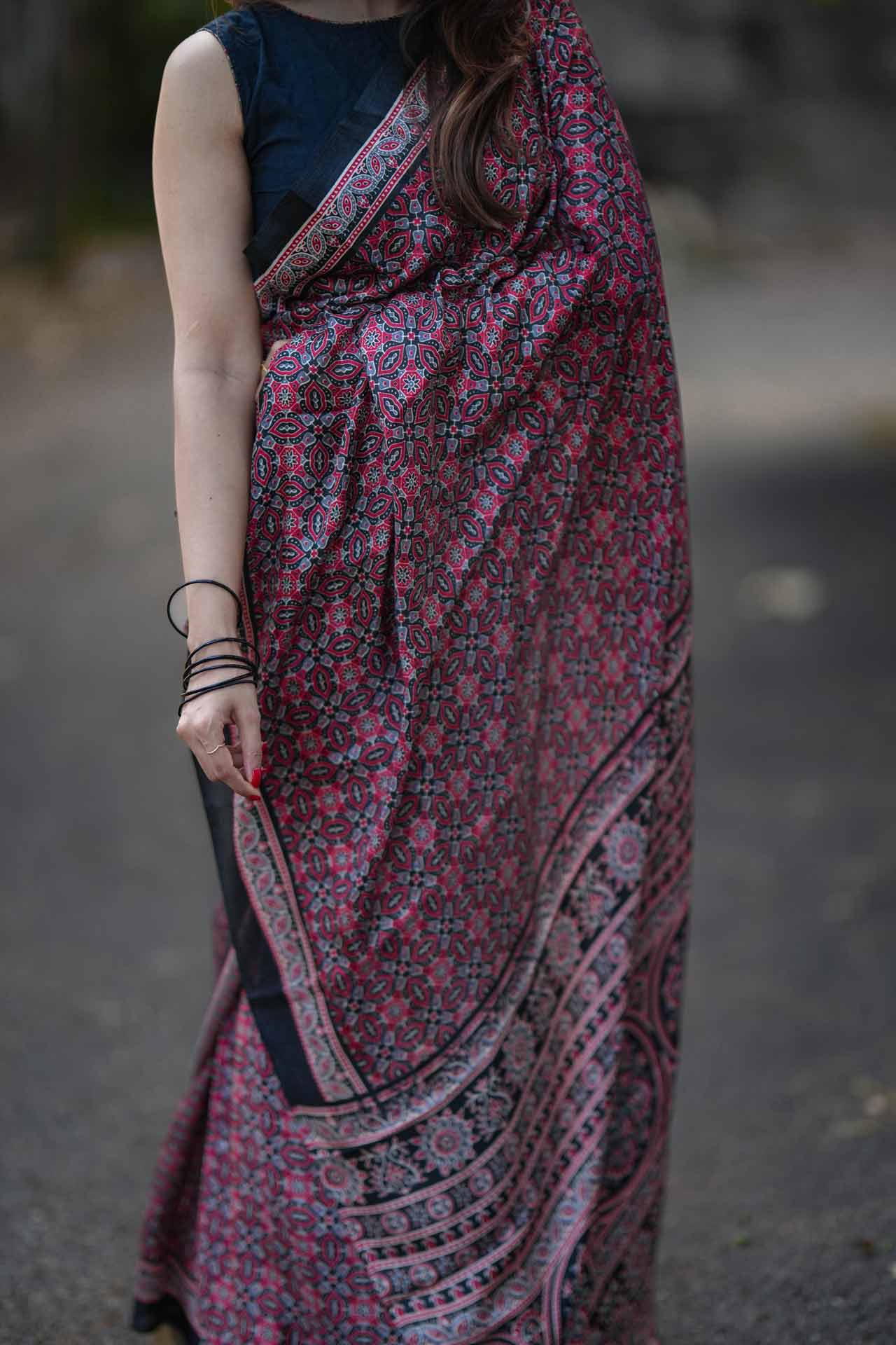 Matka Silk Saree with Red & Black Ajrak Print – A Perfect Blend of Tradition & Elegance