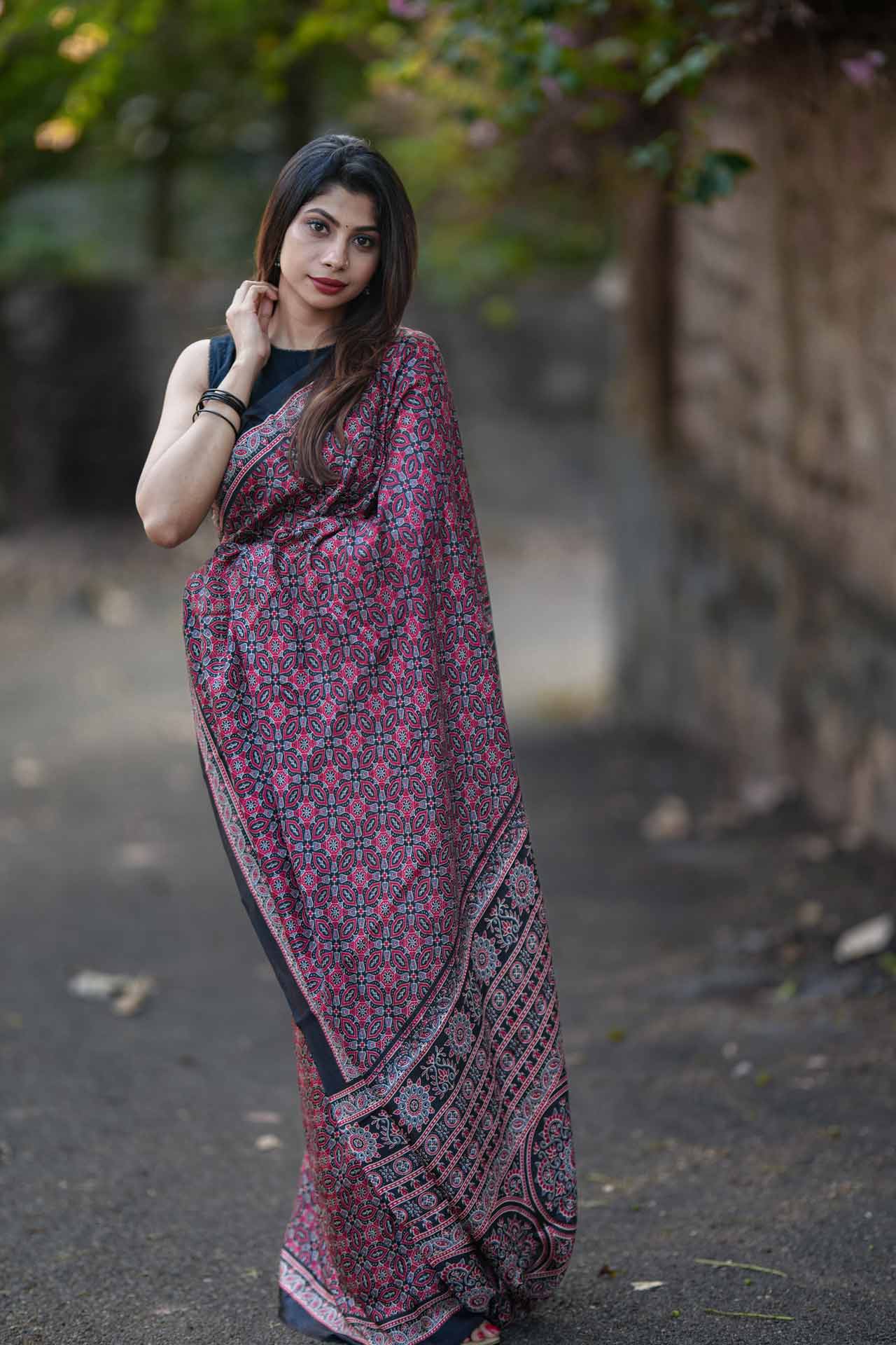 This Matka Silk Saree with Red & Black Ajrak Print is a perfect fusion of heritage and contemporary elegance. Whether paired with oxidized silver jewelry for a bohemian touch or classic gold accessories for a regal look, this saree is a must-have for saree connoisseurs.