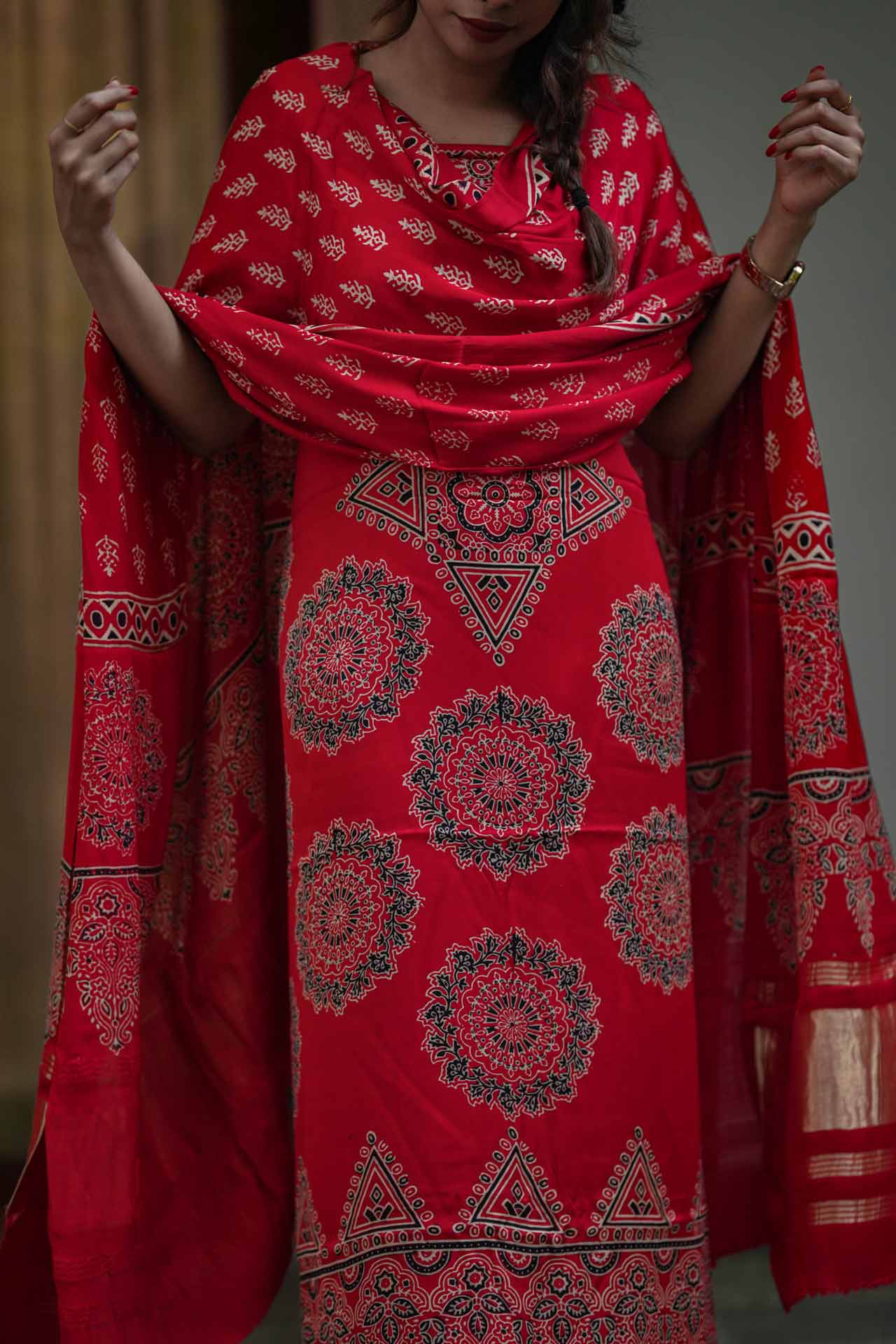 Graceful Pure Modal Silk Churidhar Set in Red with Ajrak Print