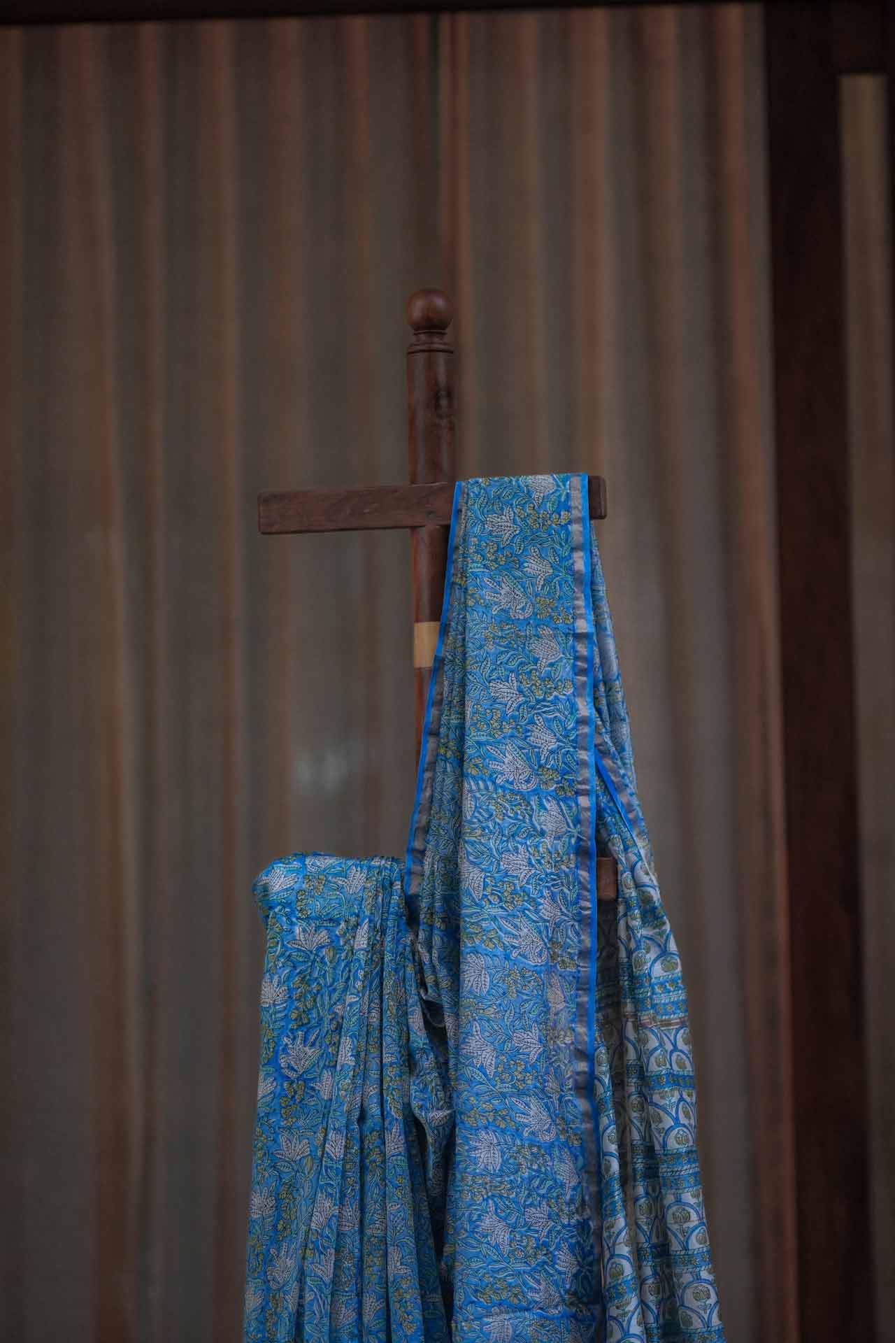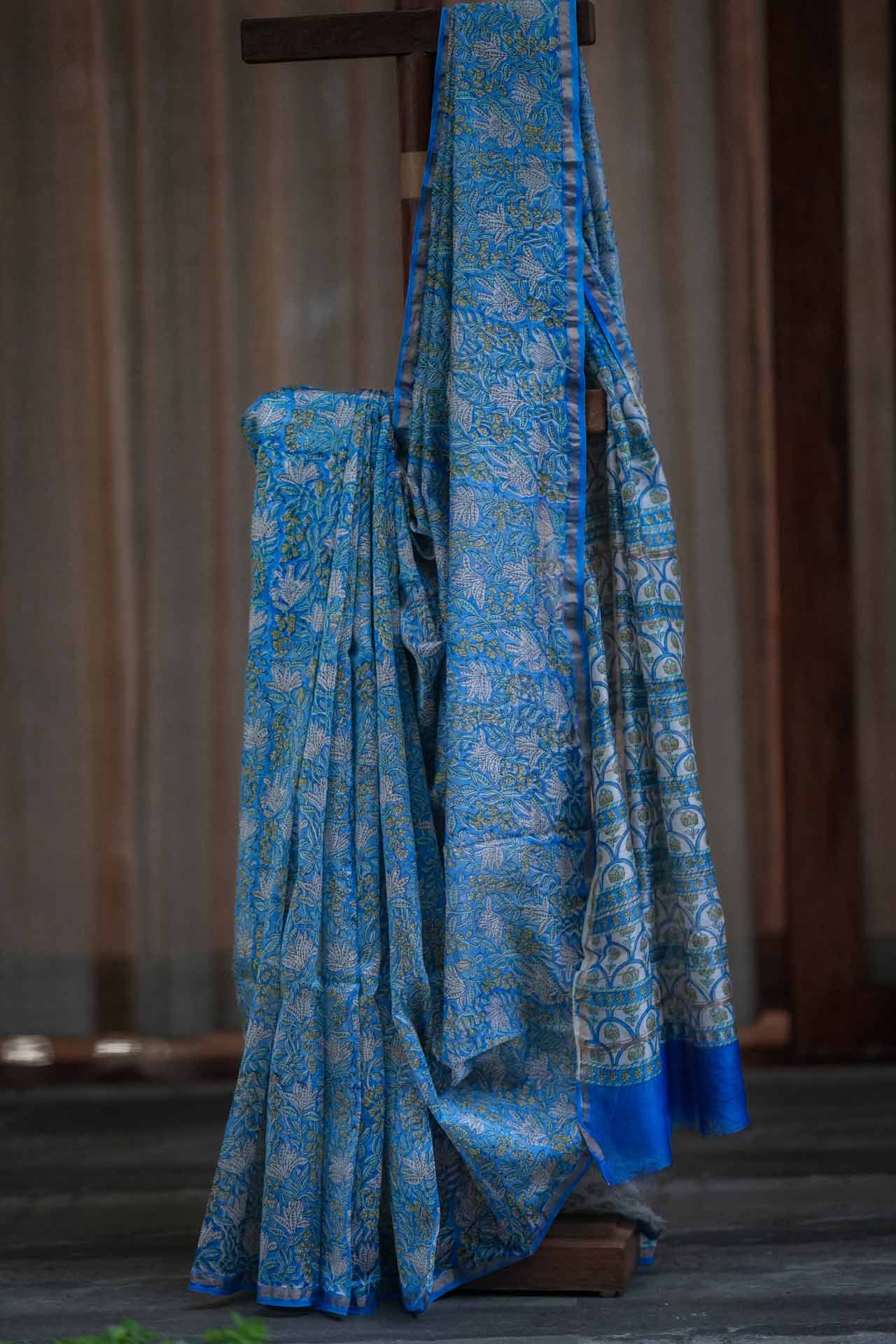 Elegant Blue Chanderi Silk Saree with White Floral Print