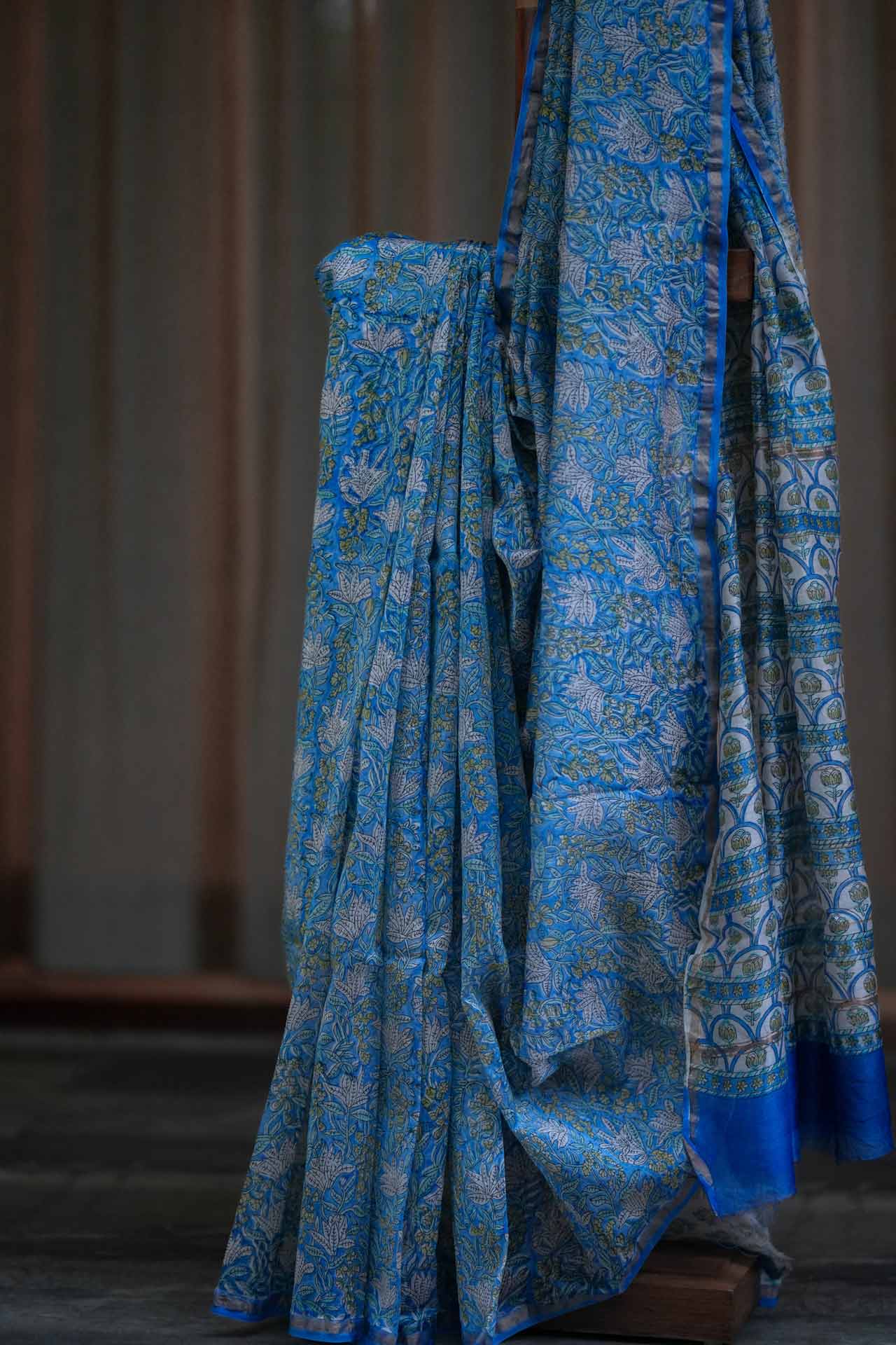This blue Chanderi silk saree with white floral print is a perfect blend of tradition and modern grace. Whether paired with delicate jewelry for a minimalistic look or statement pieces for a bold ensemble, this saree is sure to enhance your style effortlessly.