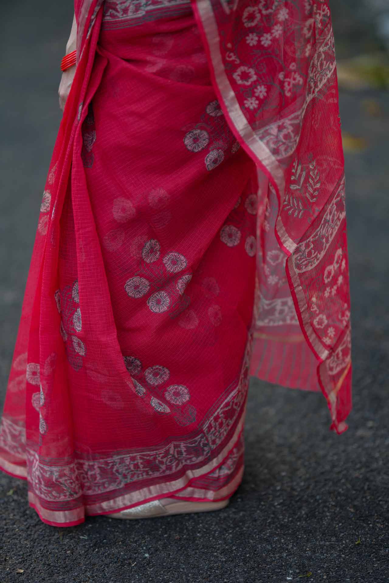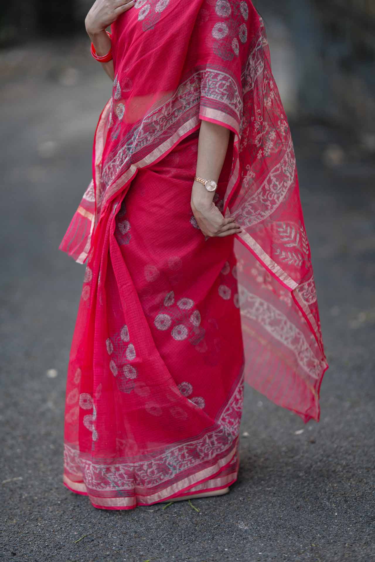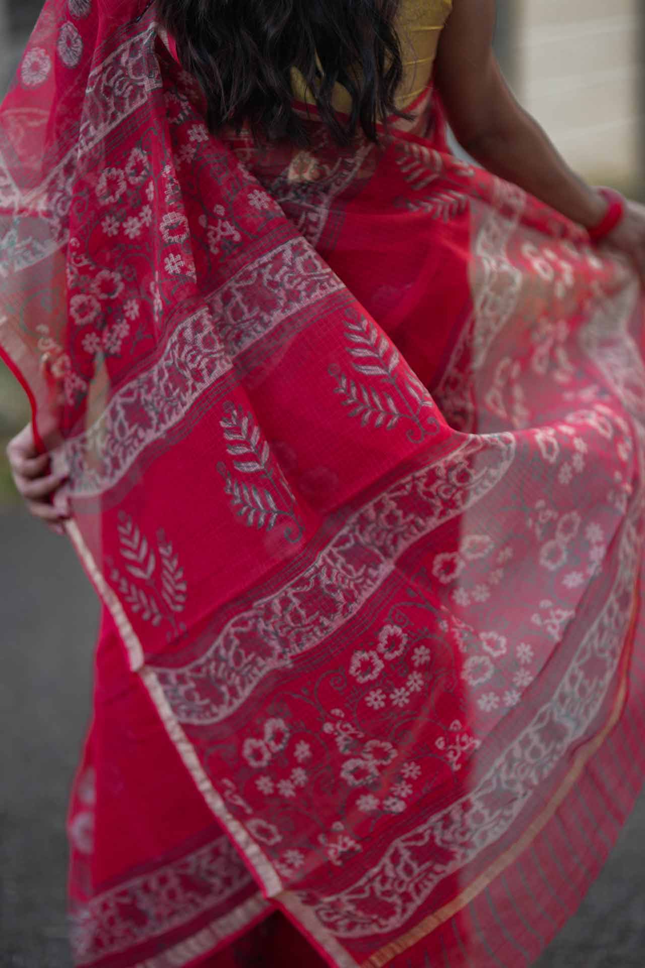 Red Kota Doriya Saree with Golden Zari Border & Floral Prints – A Timeless Classic