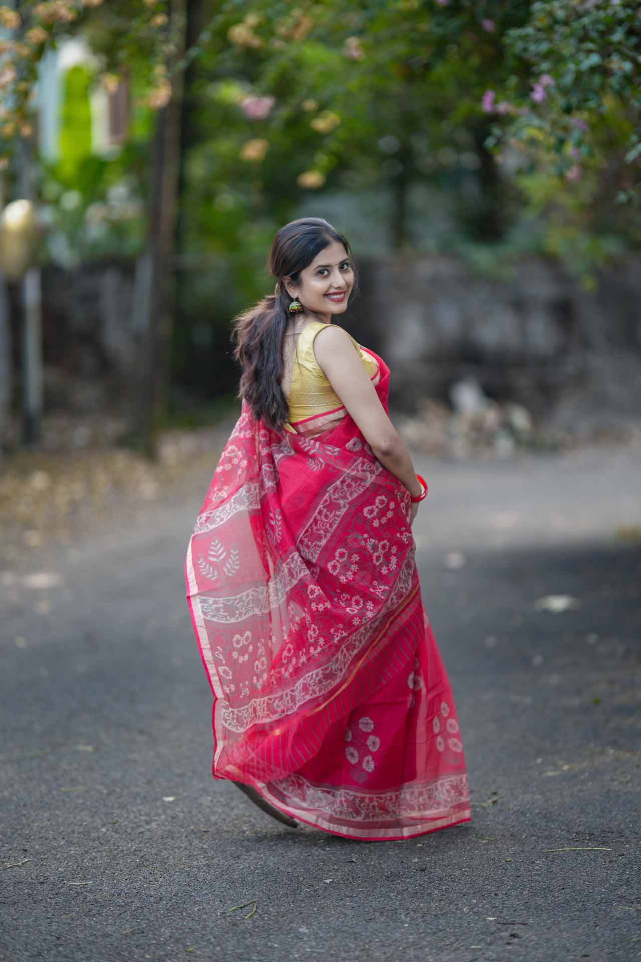 This Red Kota Doriya Saree with Golden Zari Border & Floral Prints is an epitome of grace, culture, and modern femininity. Whether paired with golden jhumkas for a festive look or minimal jewelry for a contemporary touch, this saree is an elegant addition to any wardrobe.