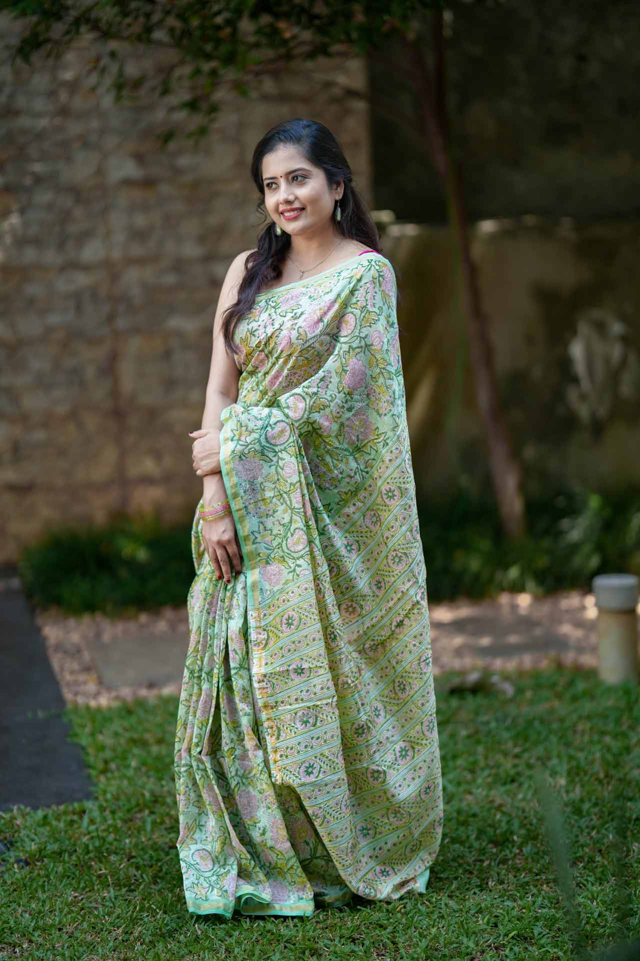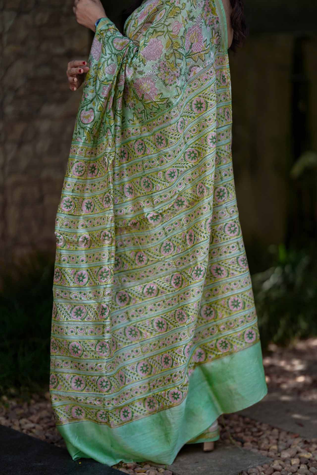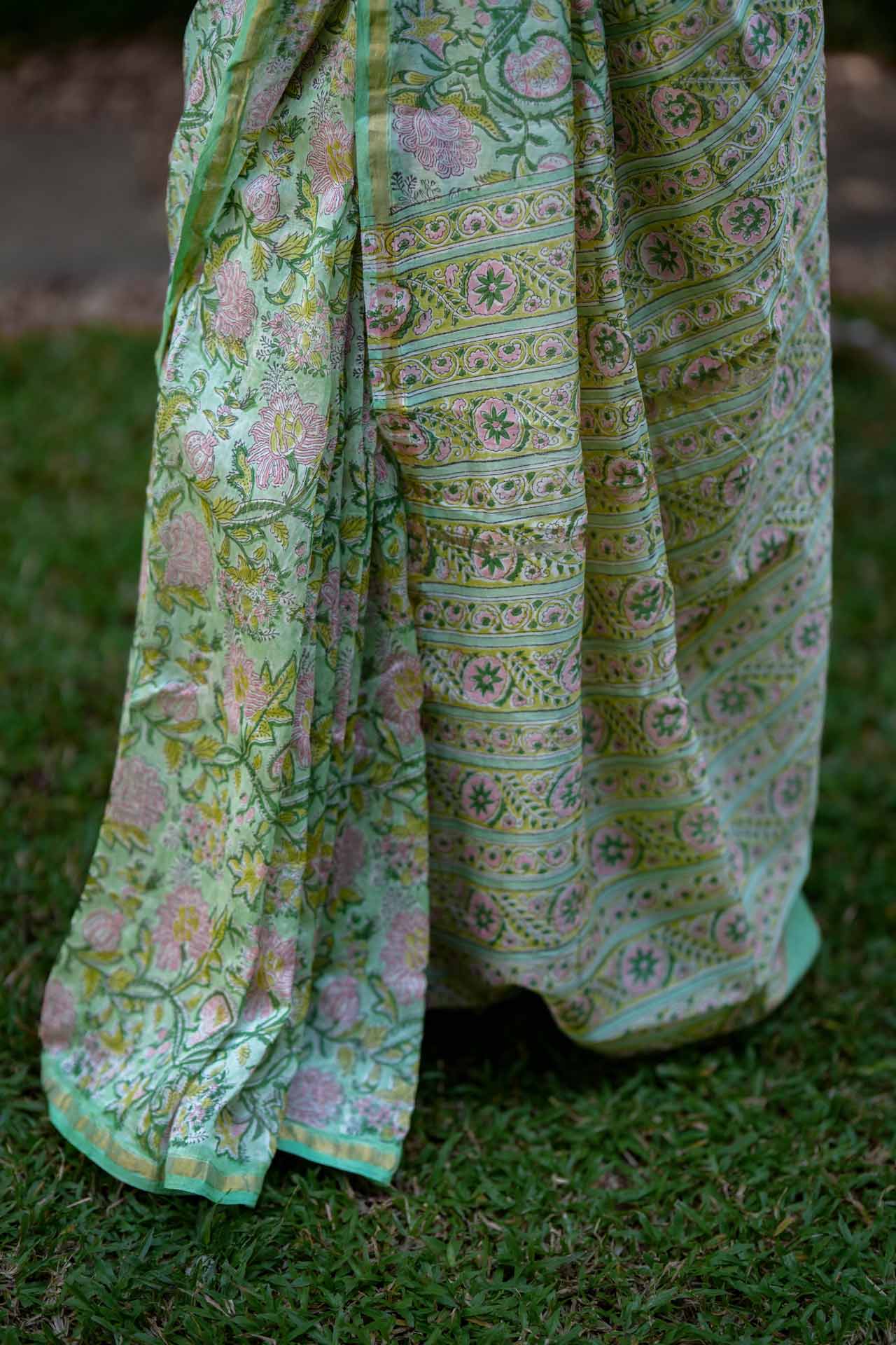 Pastel Green Chanderi Silk Saree with Pink & Dark Green Floral Print and Golden Zari Border