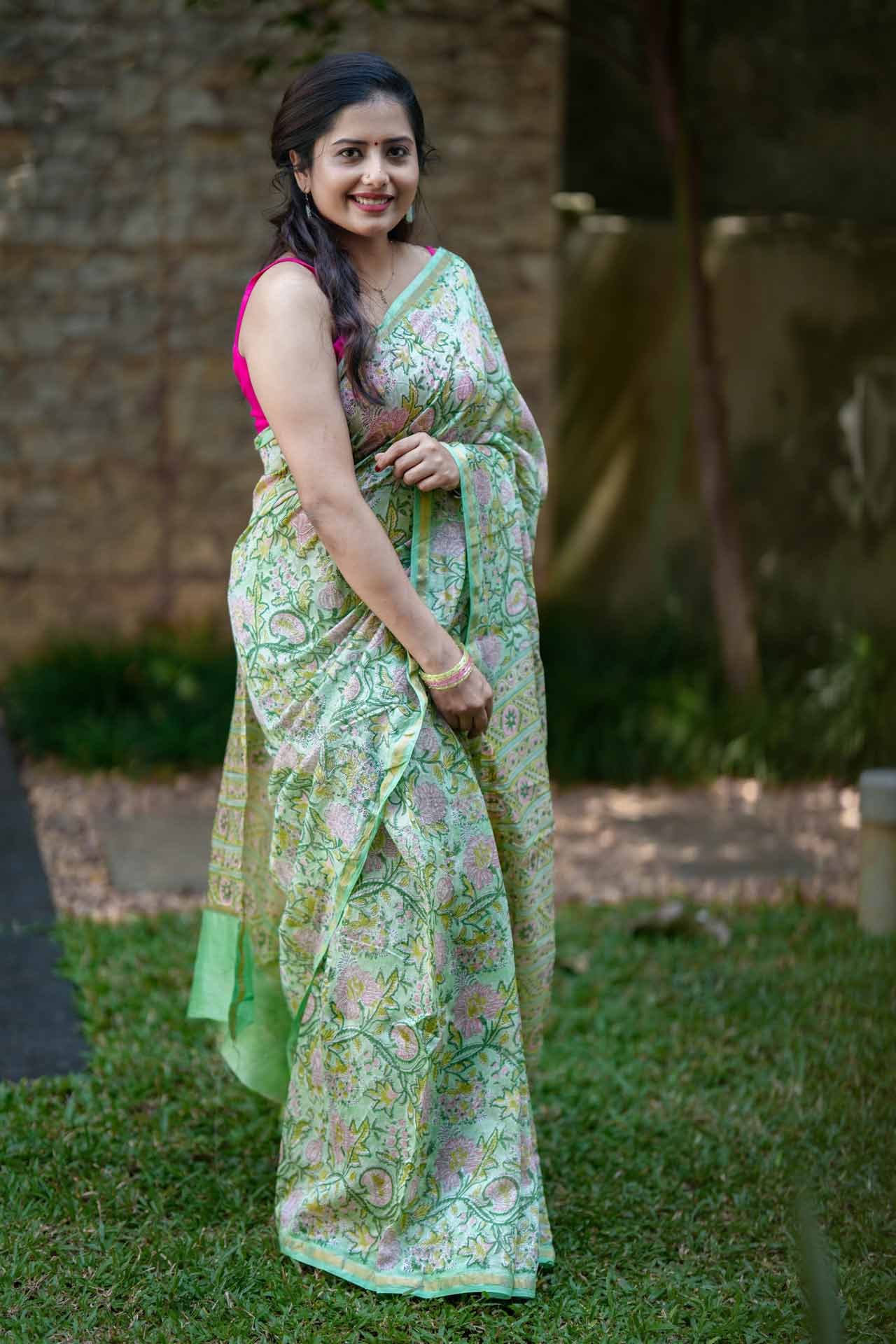 This pastel green Chanderi silk saree with pink and dark green floral print and a golden zari border is an ideal choice for those who love a blend of sophistication and tradition. Pair it with minimal jewelry and soft makeup for an effortlessly graceful look!