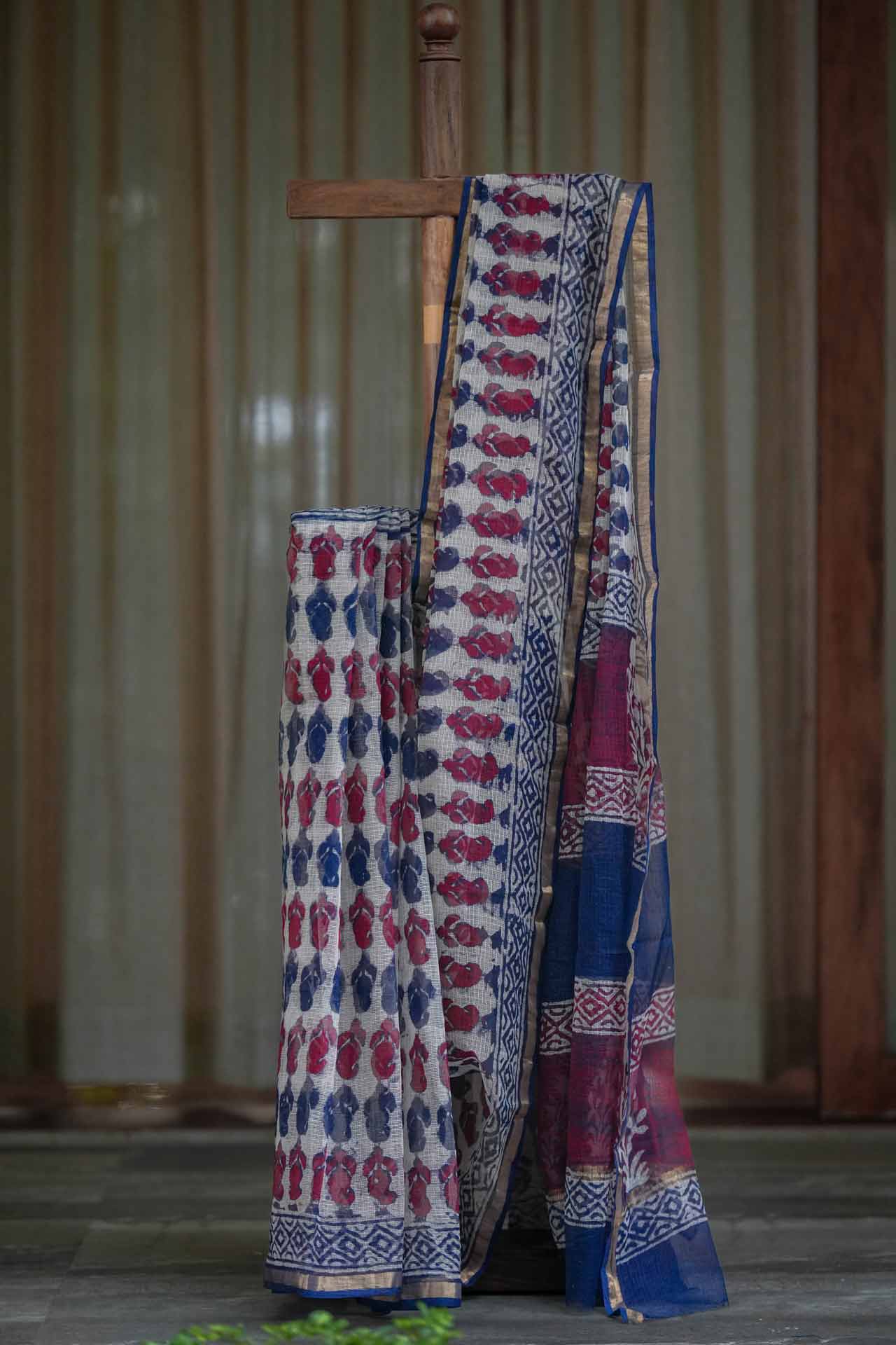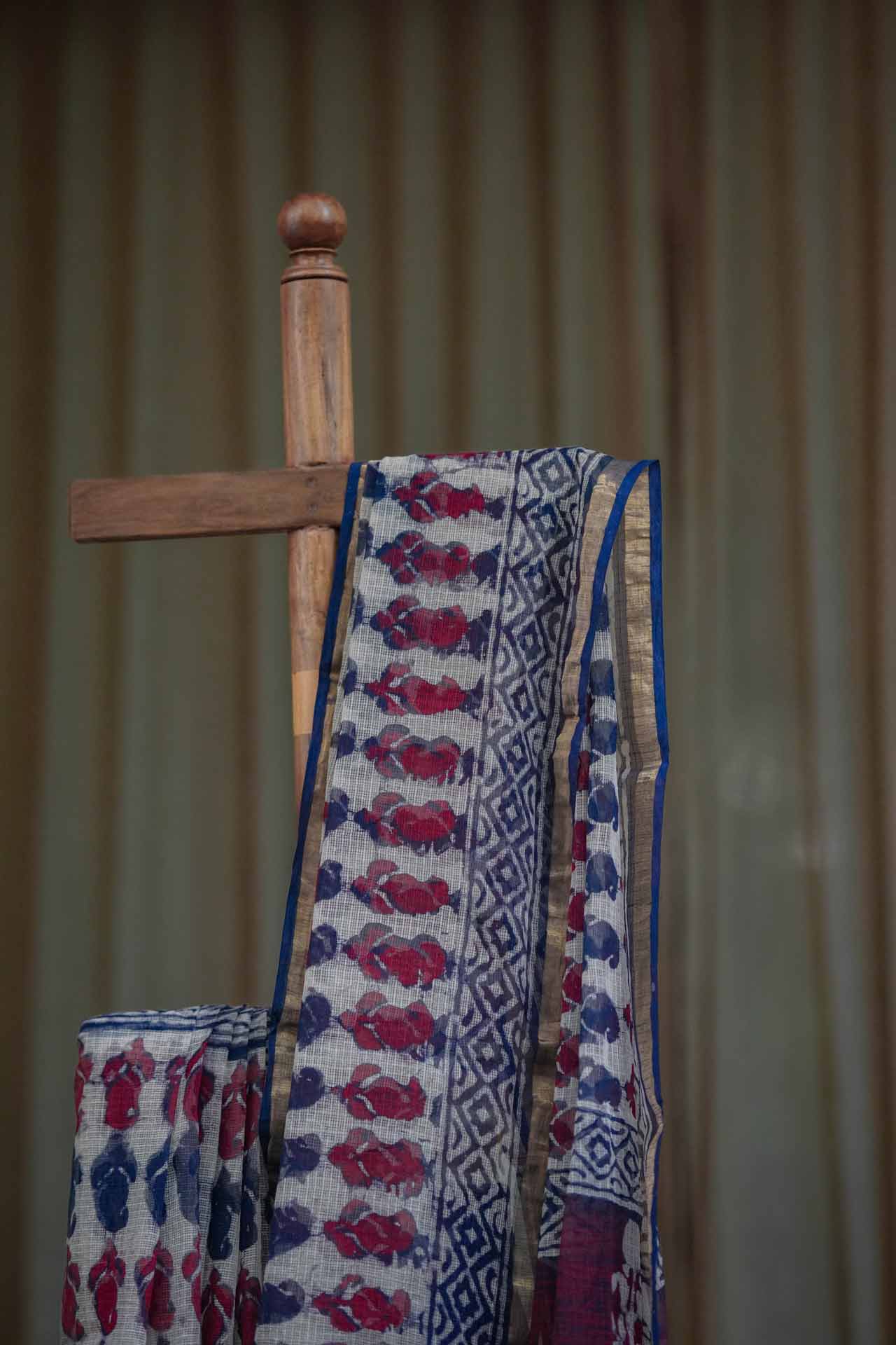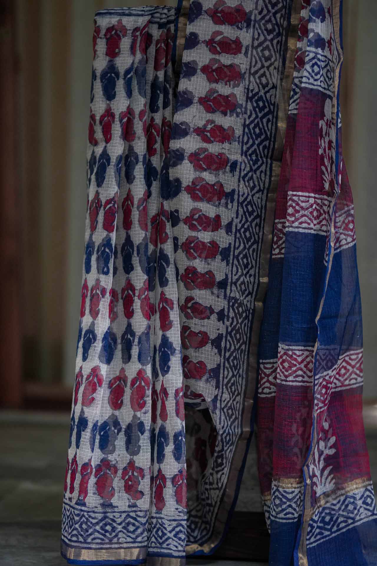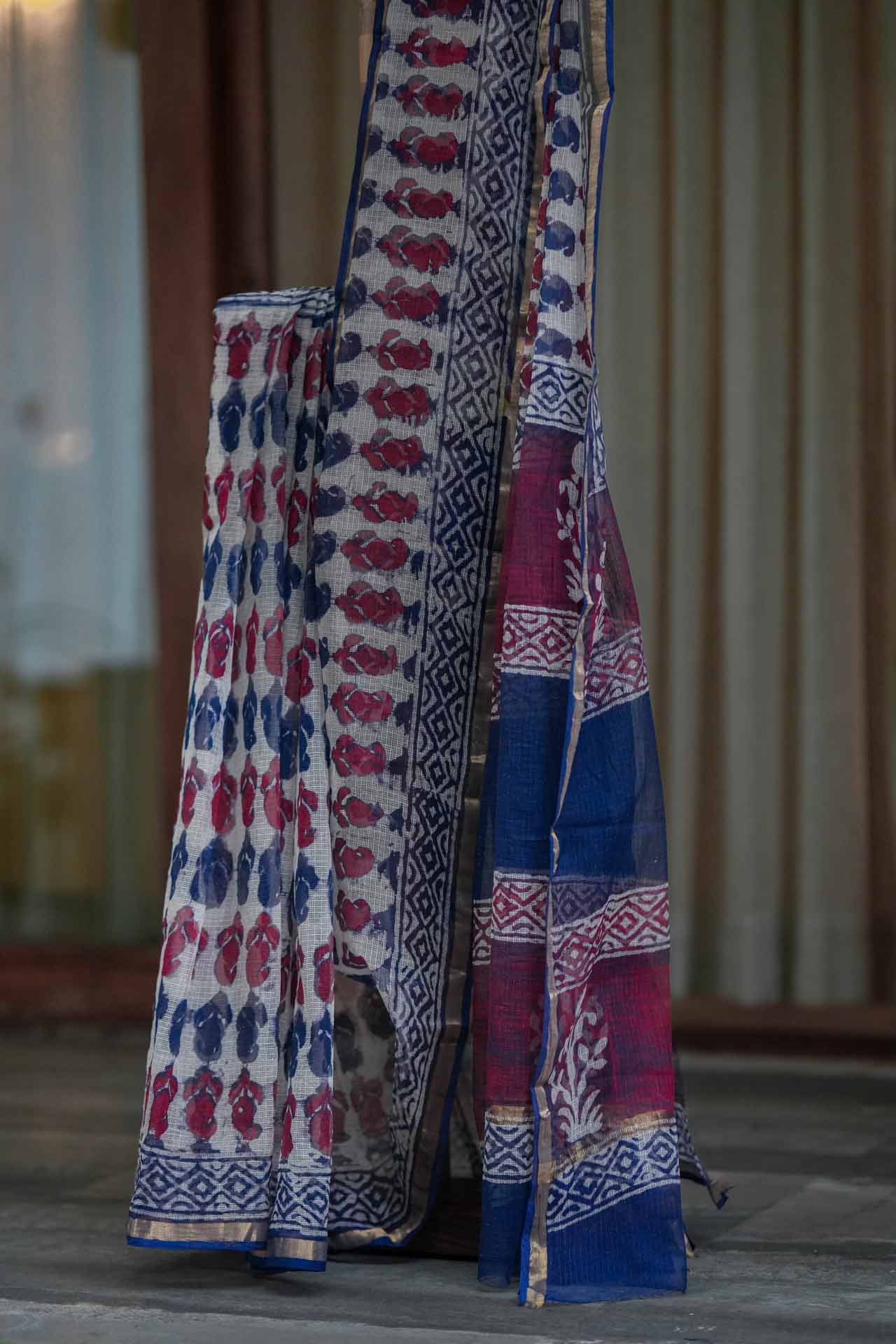 Graceful Cream Kota Doriya Saree with Maroon & Navy Blue Print and Golden Zari Border