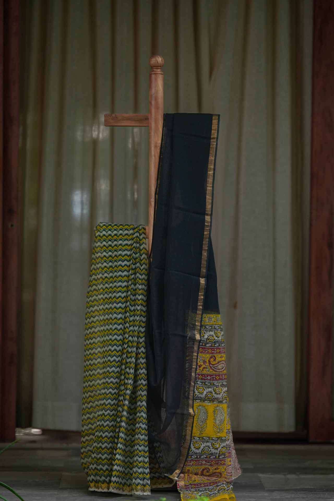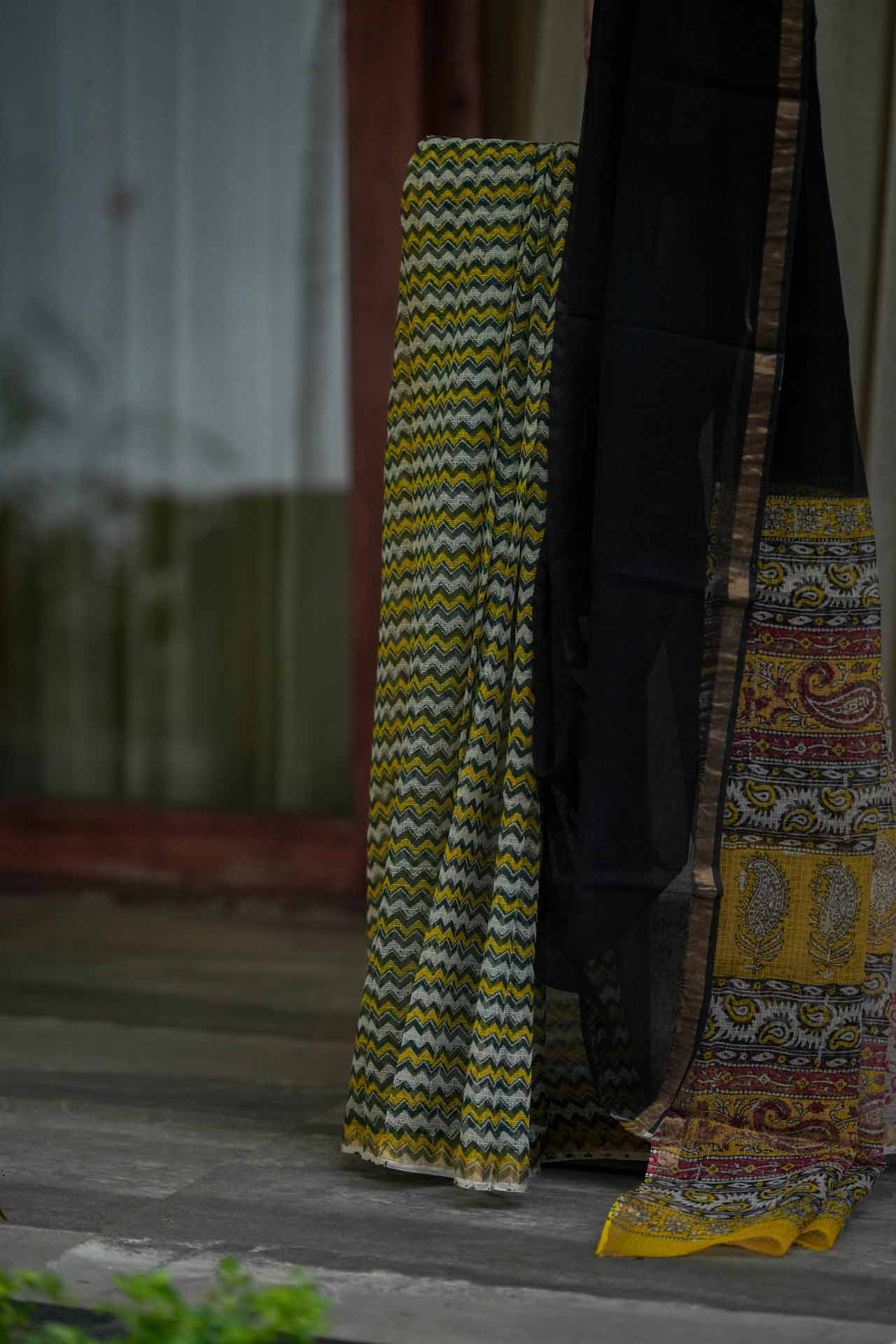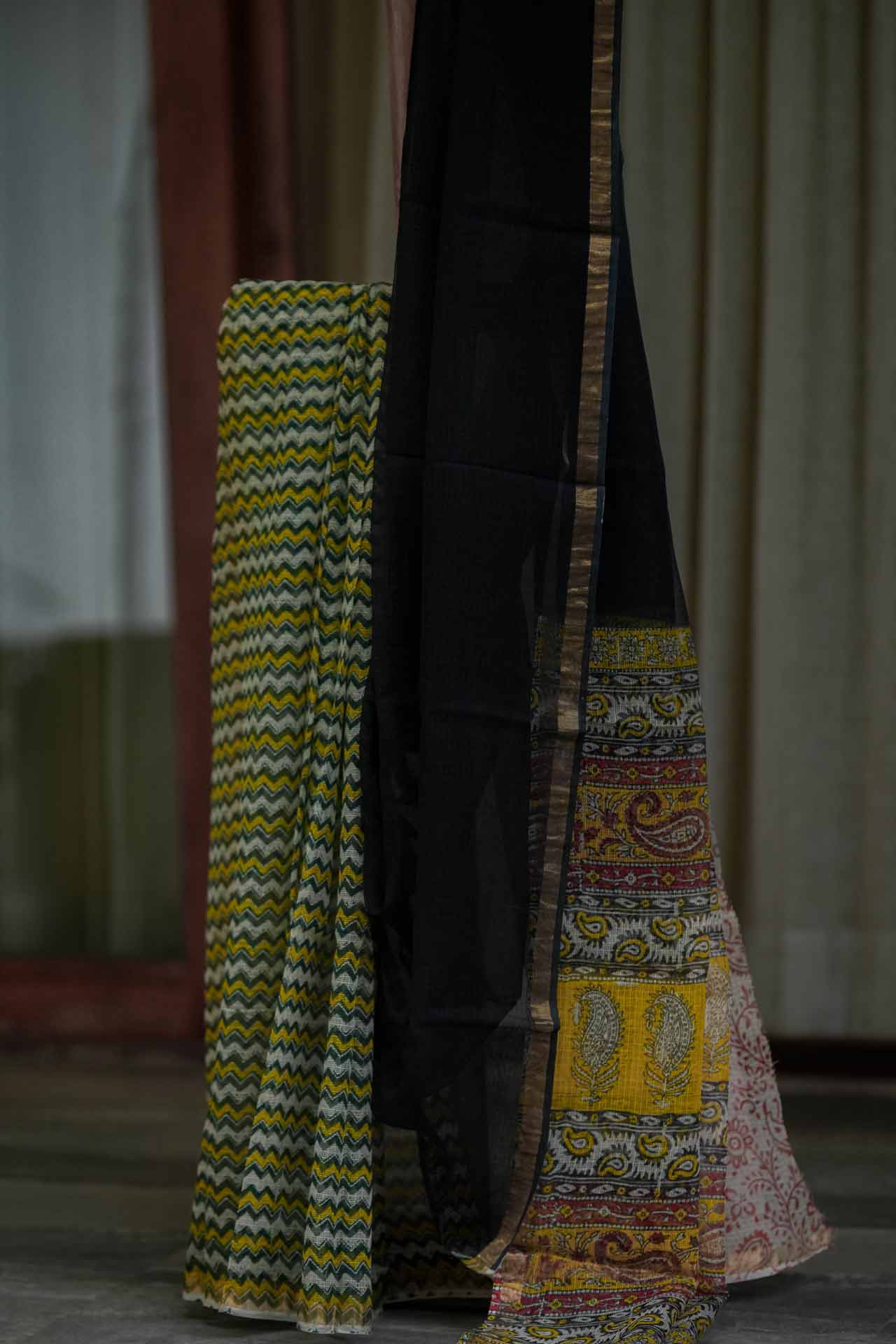 Elevate your ethnic wardrobe with this stunning Kota Doriya saree, featuring a unique blend of green, yellow, and white asymmetrical stripes on the body and a contrasting black pallu adorned with golden zari work. This saree is a perfect combination of lightweight comfort, artistic patterns, and traditional craftsmanship.