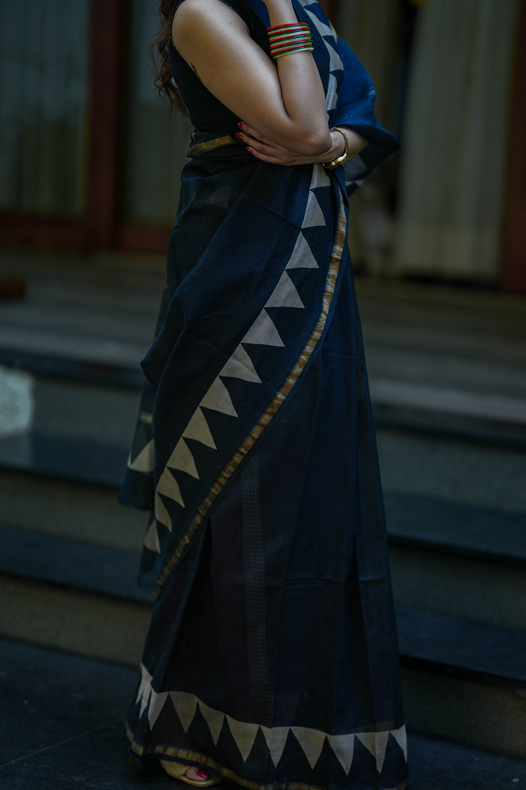 Black Chanderi Silk Saree with Thin Golden Zari Border & Geometrical Design – A Timeless Statement of Elegance