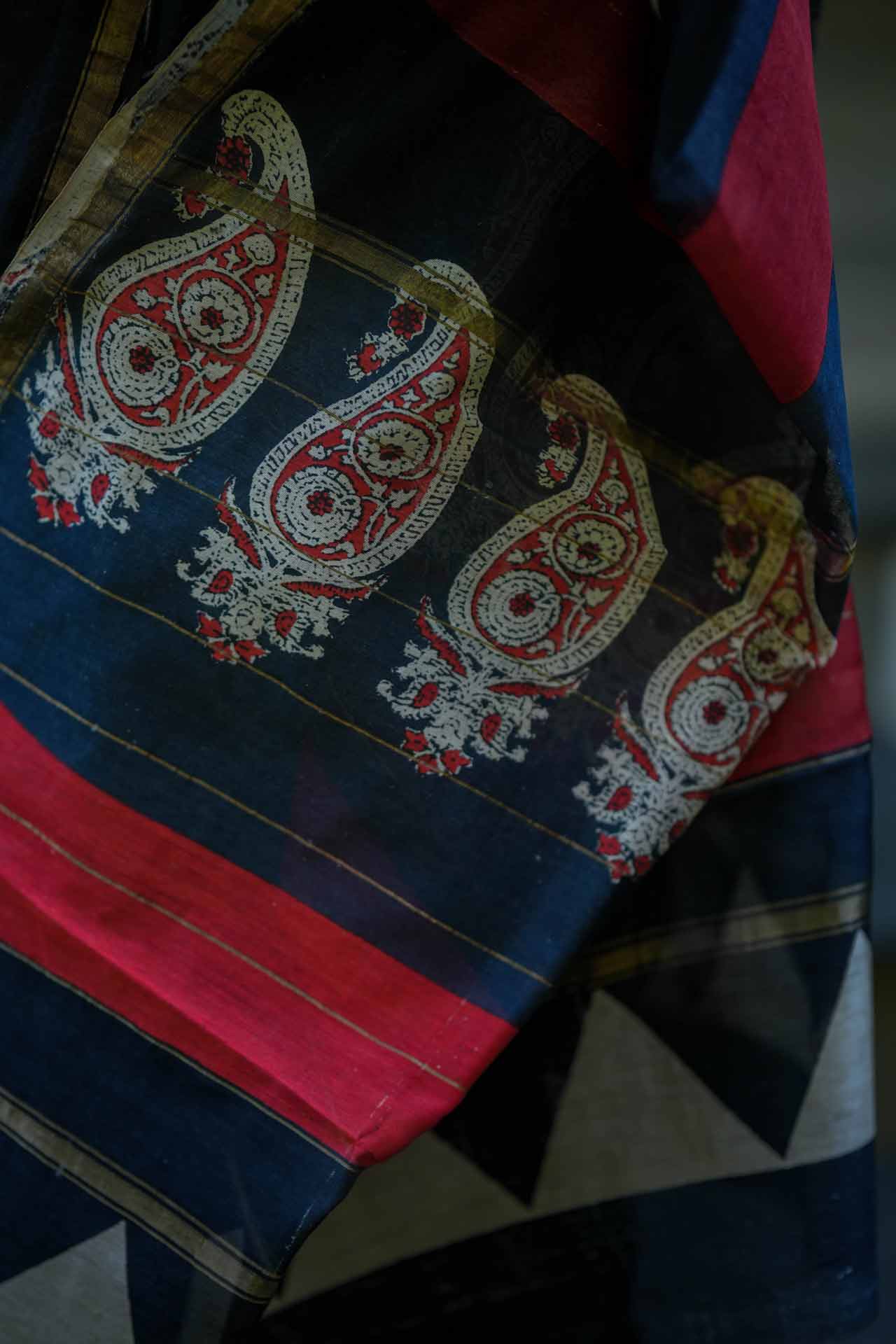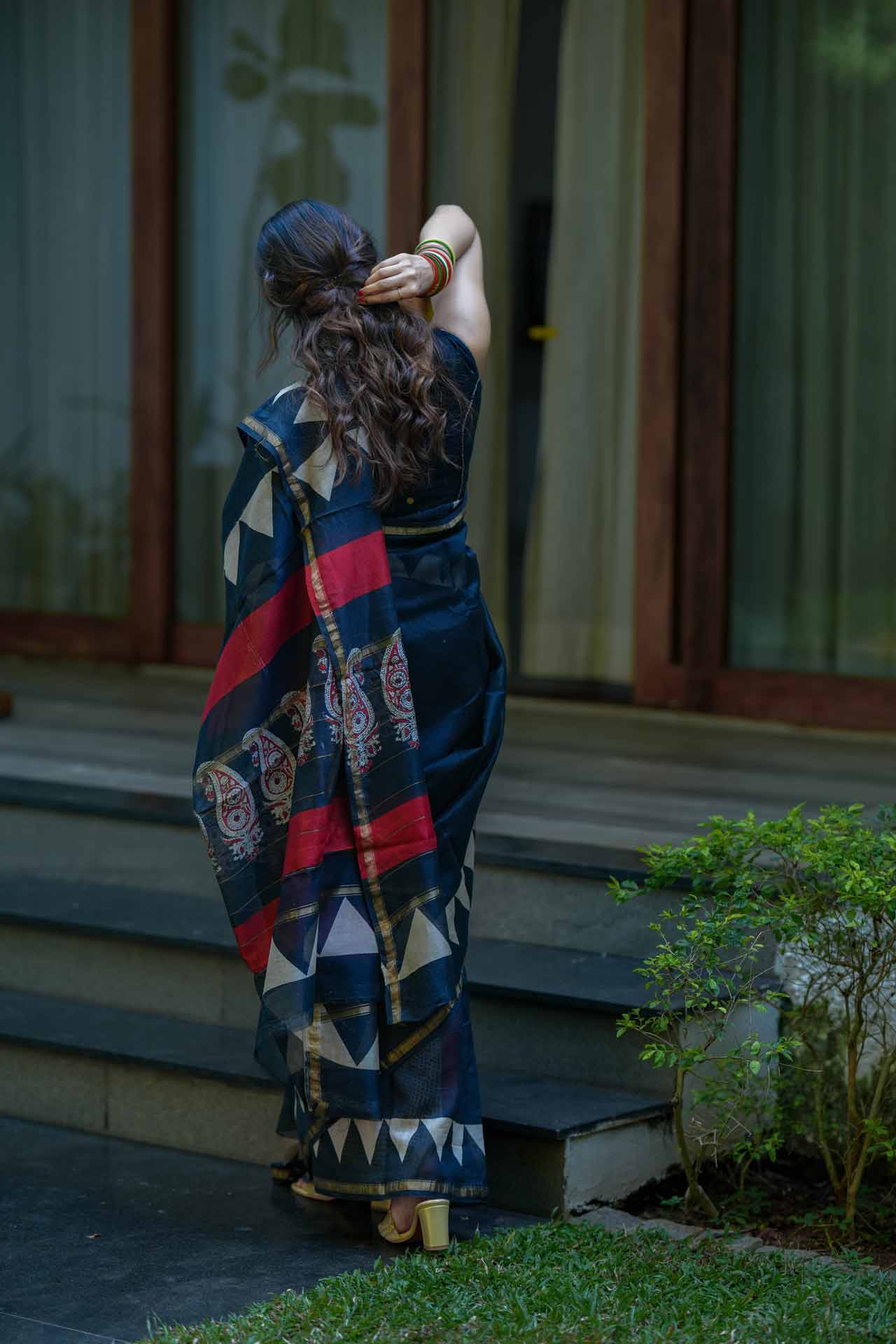 This Black Chanderi Silk Saree with Thin Golden Zari Border & Geometric Pattern, Enhanced with Heavy Red & White Work in Pallu, is an ode to elegance, tradition, and artistic craftsmanship. Whether paired with golden jewelry for a regal look or minimal accessories for a modern appeal, this saree is a must-have for every fashion-conscious woman.
