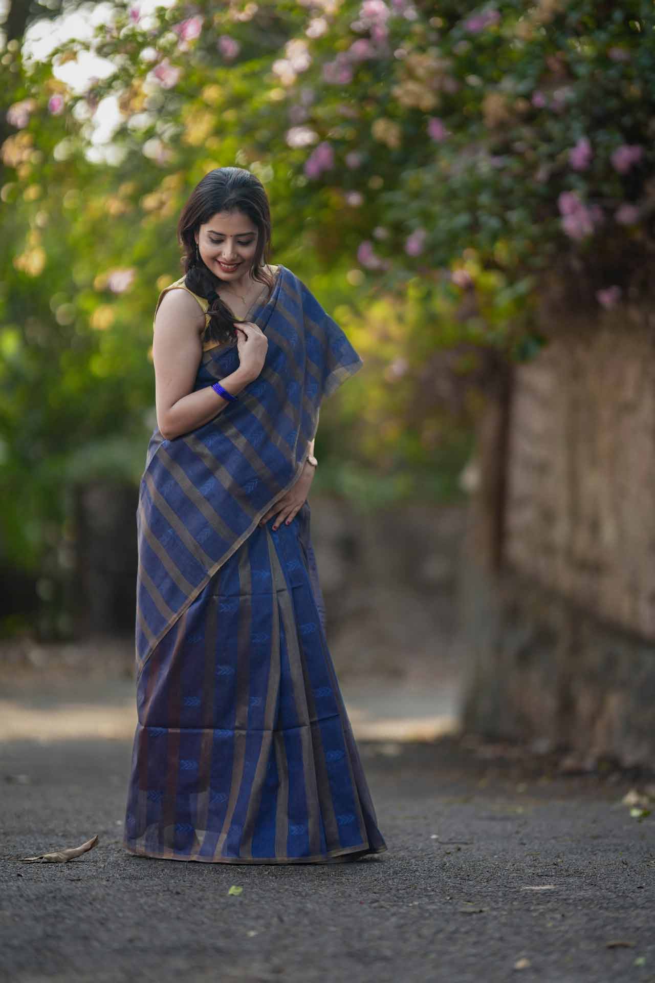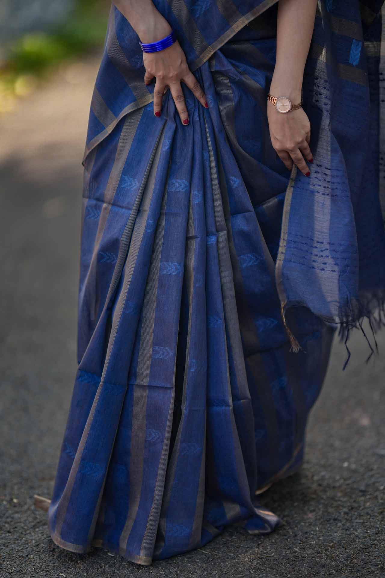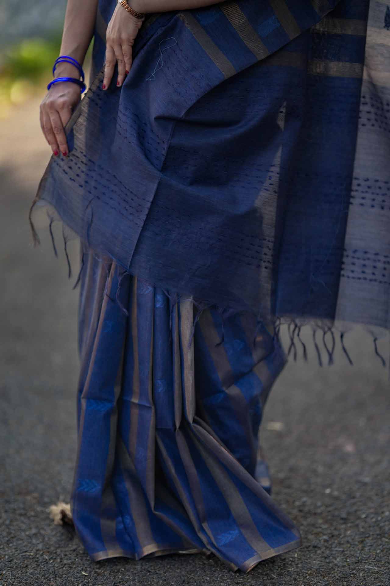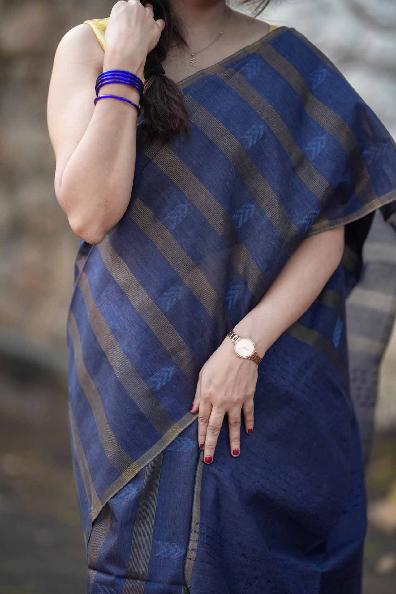 Semi Tussar Silk Saree in Navy Blue with Golden Stripes – A Blend of Elegance & Tradition
