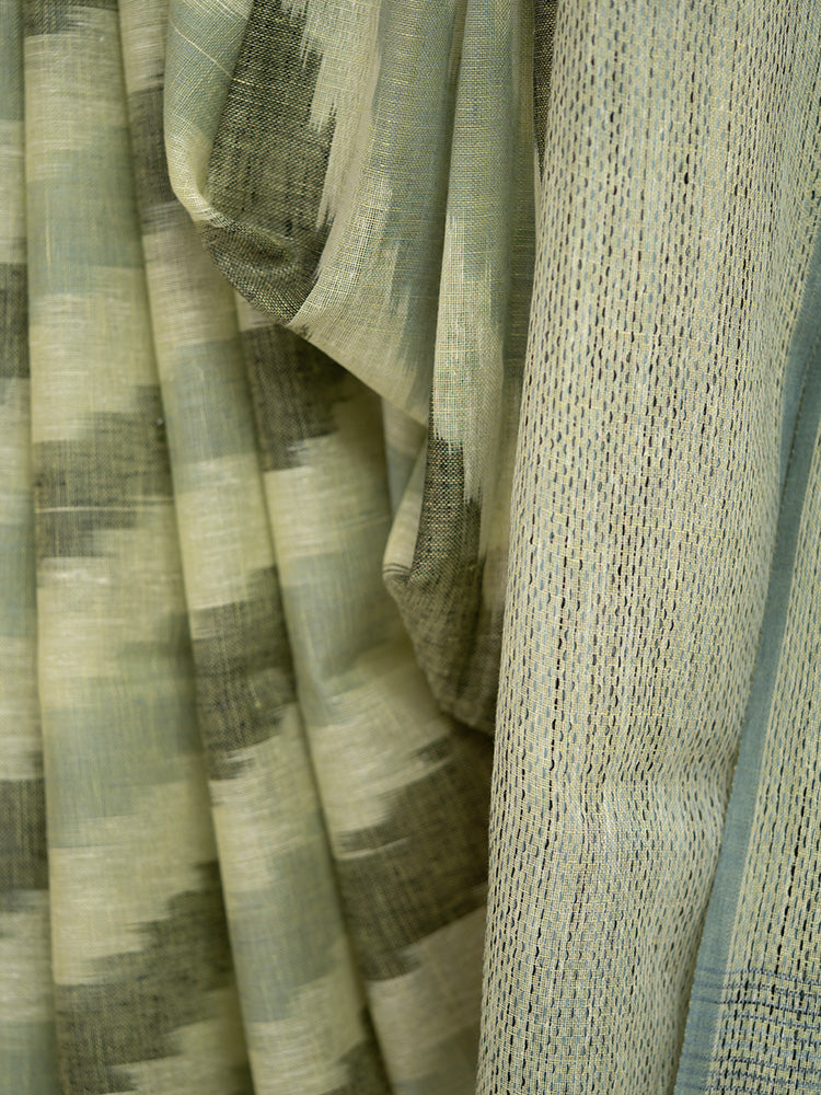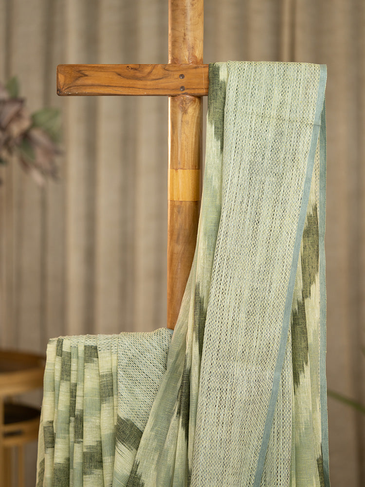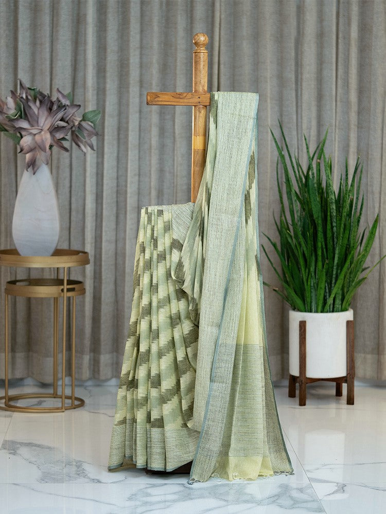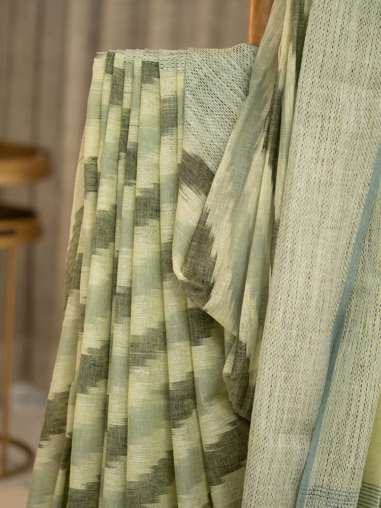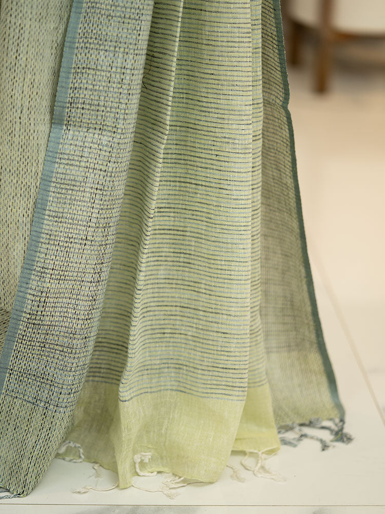 Pure Linen Cotton Saree with Diagonal Dark and Light Green Stripes