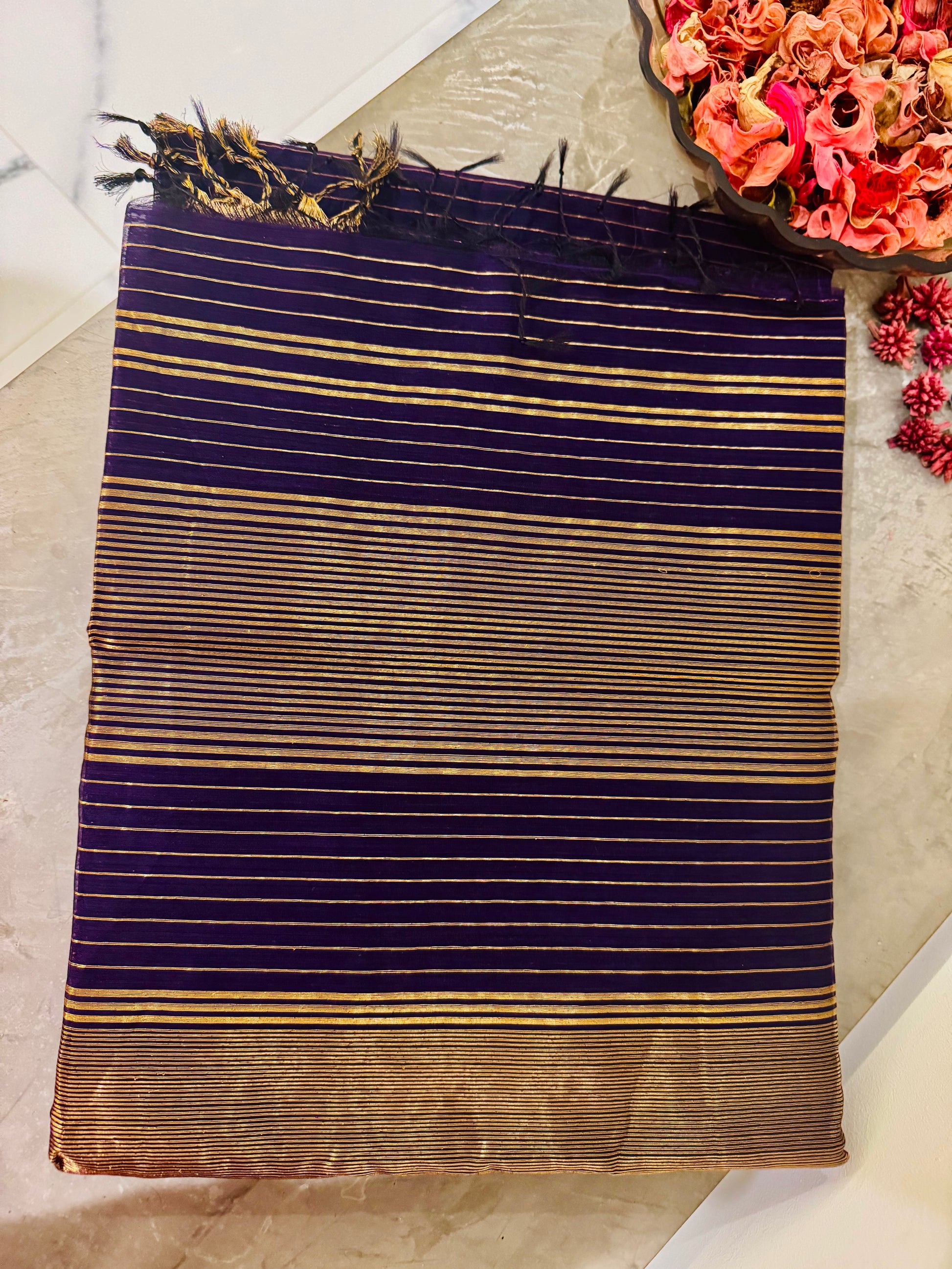 Elevate your ethnic wardrobe with this exquisite Pure Maheshwari Silk Saree in a regal dark purple shade, a timeless color that exudes elegance and sophistication. Handwoven with precision, the saree features delicate golden zari stripes running through the body, adding a subtle shimmer and a refined charm.