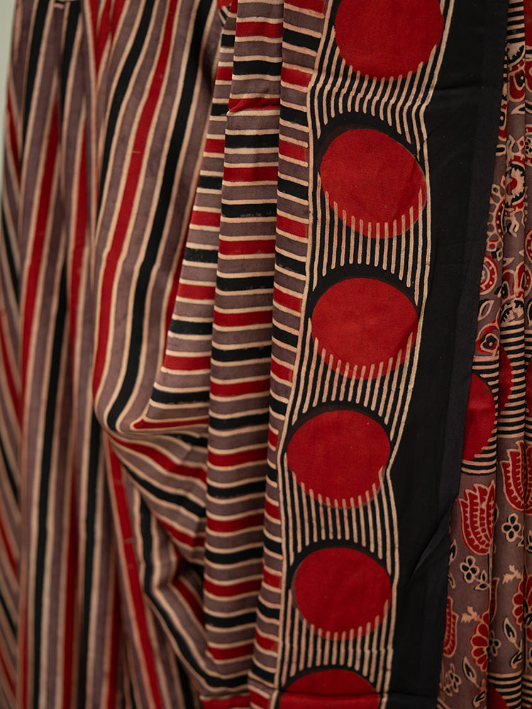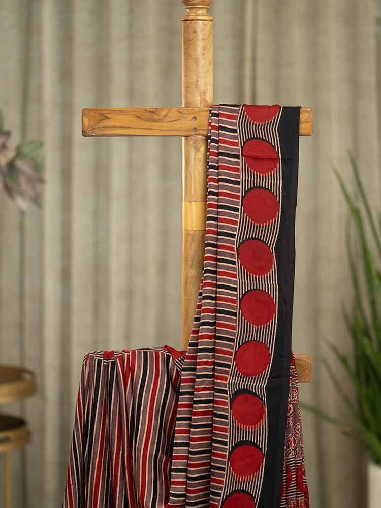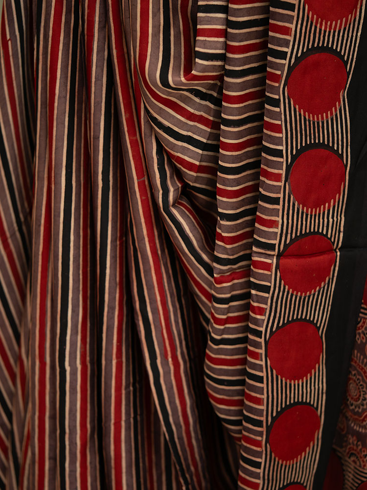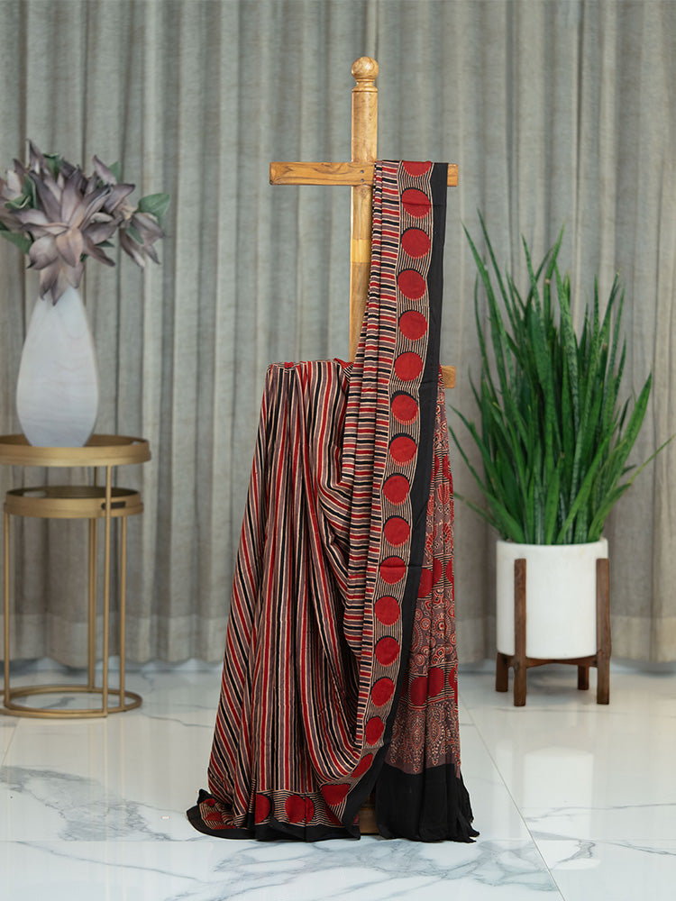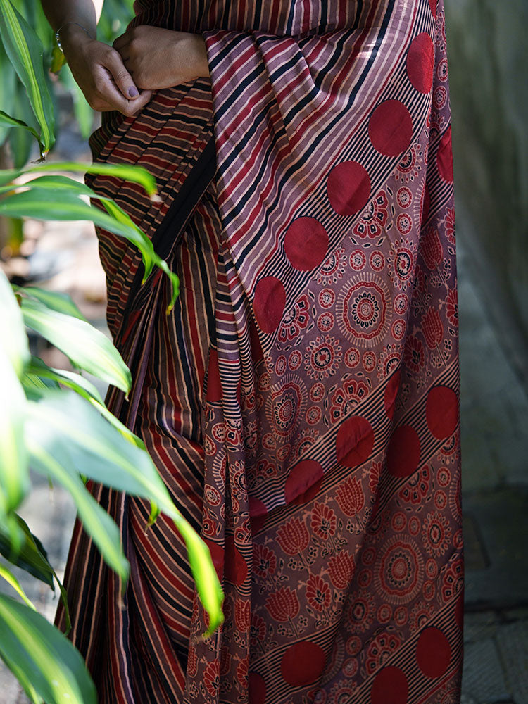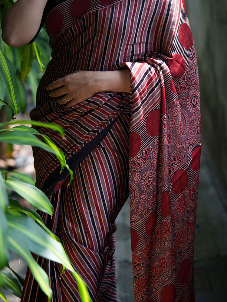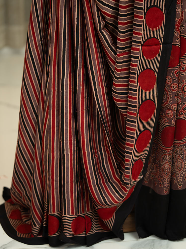 Pure Modal Silk Saree in Red, Brown, and Black Symmetrical Stripes