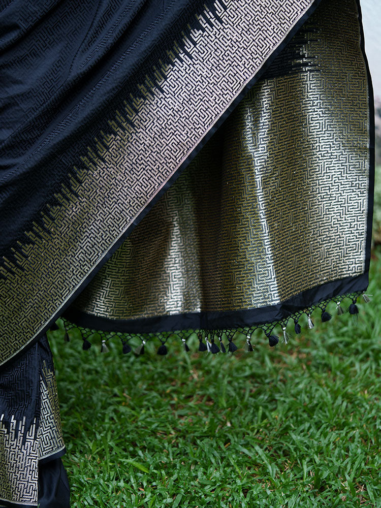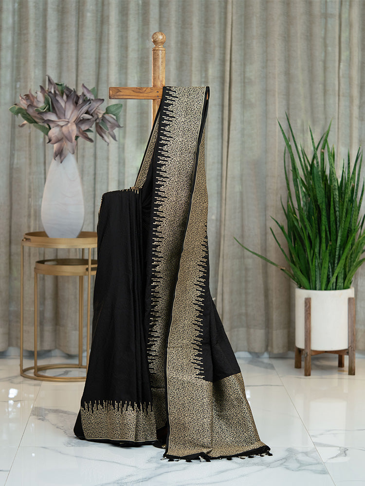Color: Black with abstract gold diagonal zari work and rich pallu.