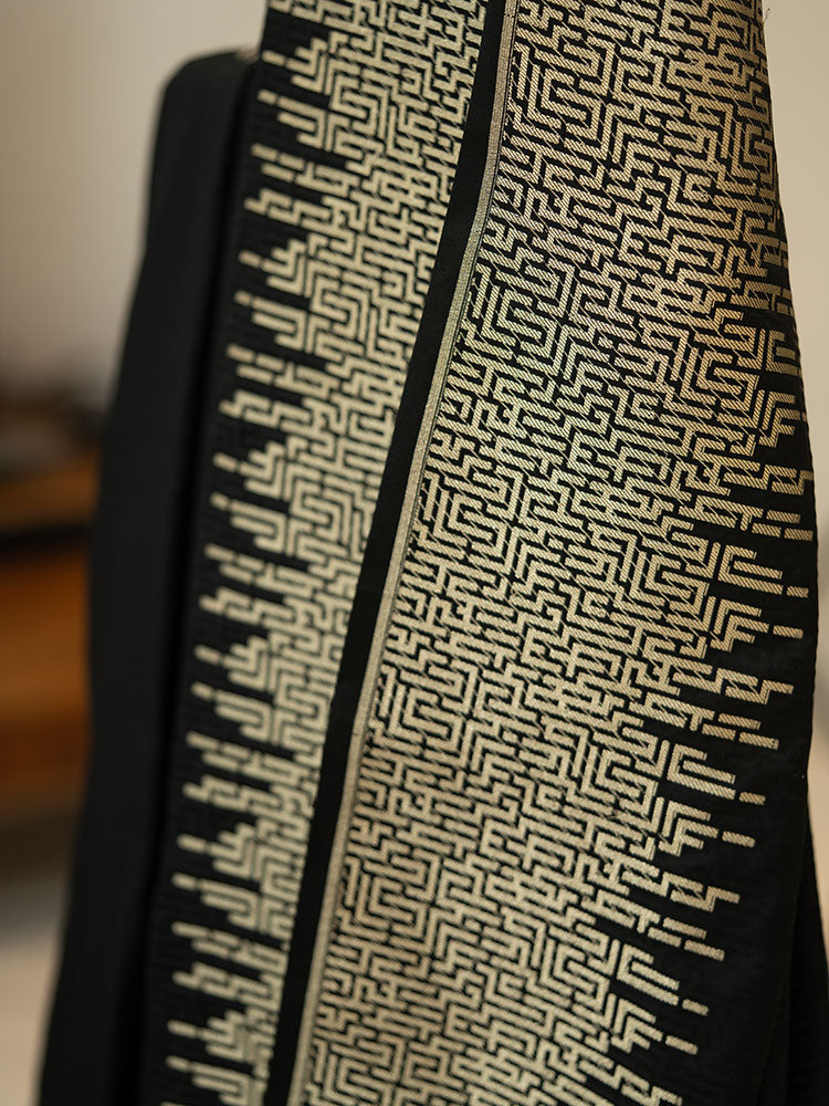 Pure Mushroom Silk Saree in Black with Abstract Gold Diagonal Zari Work and Elegant Pallu