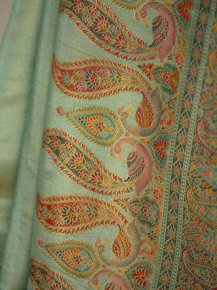 Enhance your wardrobe with our Pure Tissue Silk Saree, crafted in a stunning blue color and adorned with pashmina work on the border and pallu. This saree is a perfect blend of luxury and elegance, ideal for weddings, festive celebrations, and formal gatherings.