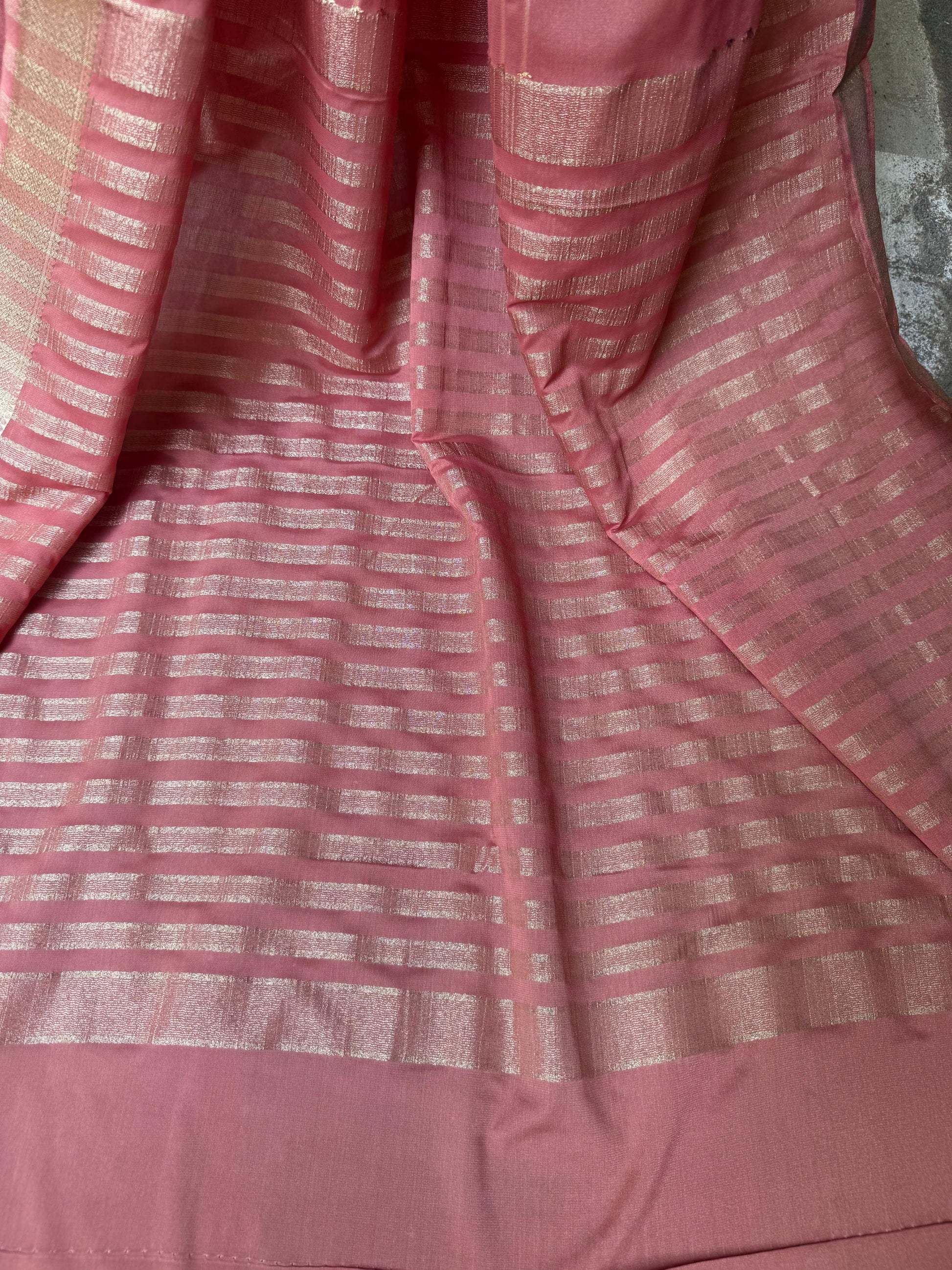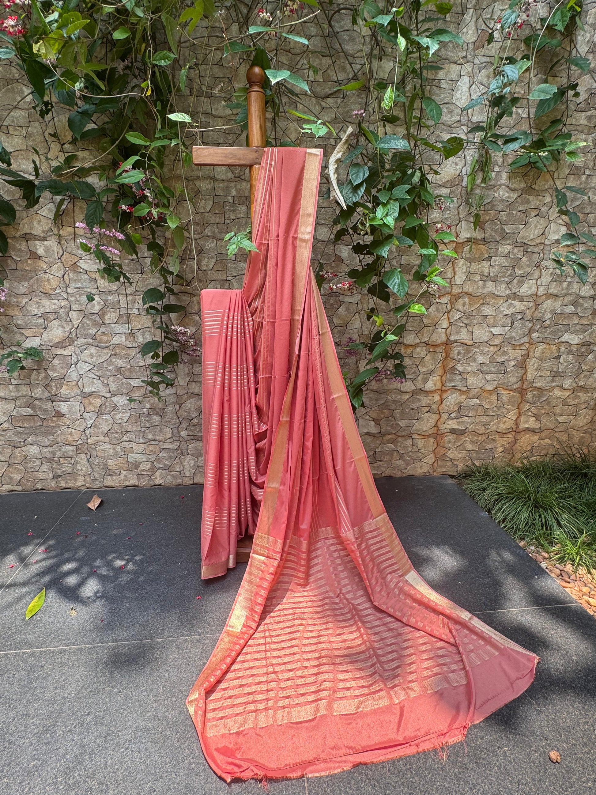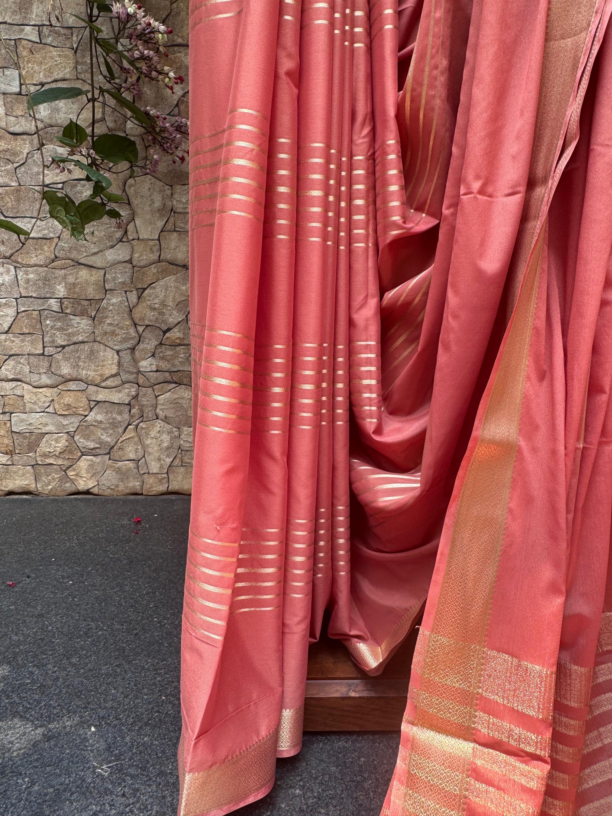 The saree features symmetrical golden stripes running across the body, adding a subtle shimmer and structured sophistication to the delicate peach base. The design is tastefully balanced with a classic golden zari border, enhancing the saree with a touch of traditional opulence without overpowering its minimalistic charm.
