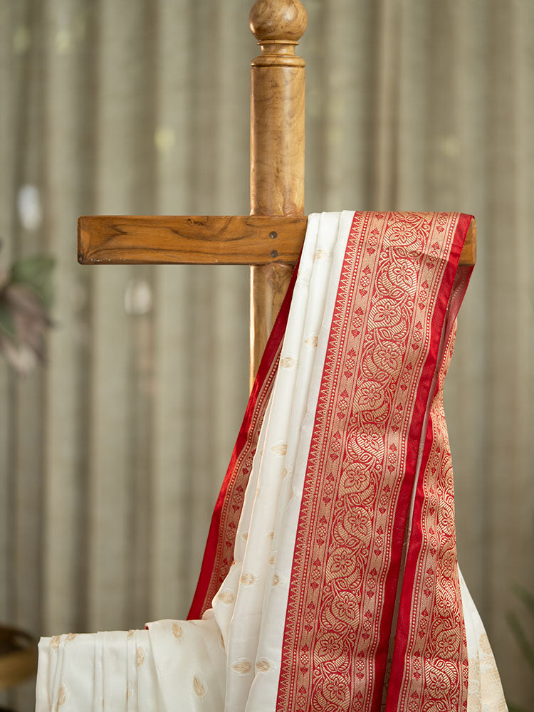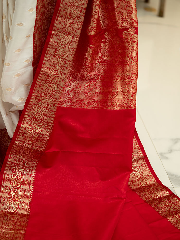 Satin Silk Saree in White and Red Combo with Golden Buttis in Body and Mix of Red and Gold Border