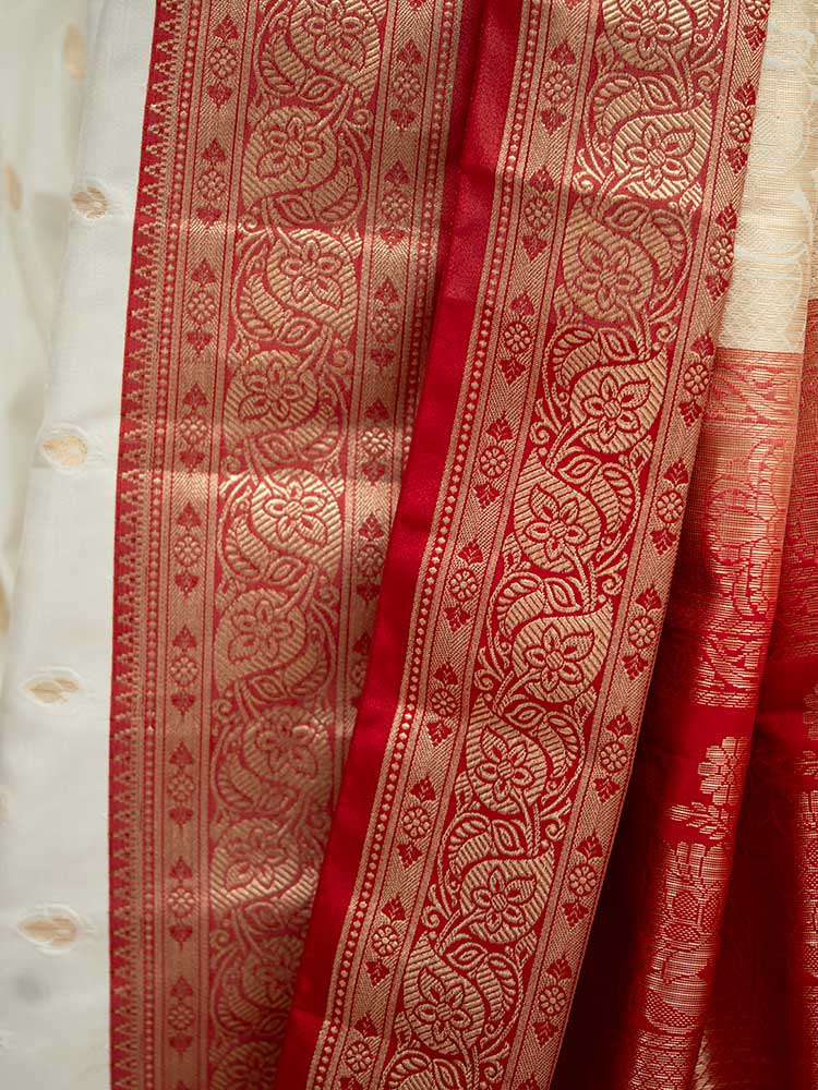 Elevate your elegance with this satin silk saree, featuring a classic white and red color combination adorned with exquisite golden buttis. Designed for timeless appeal and luxurious comfort, this saree is perfect for festive occasions, weddings, and special celebrations.