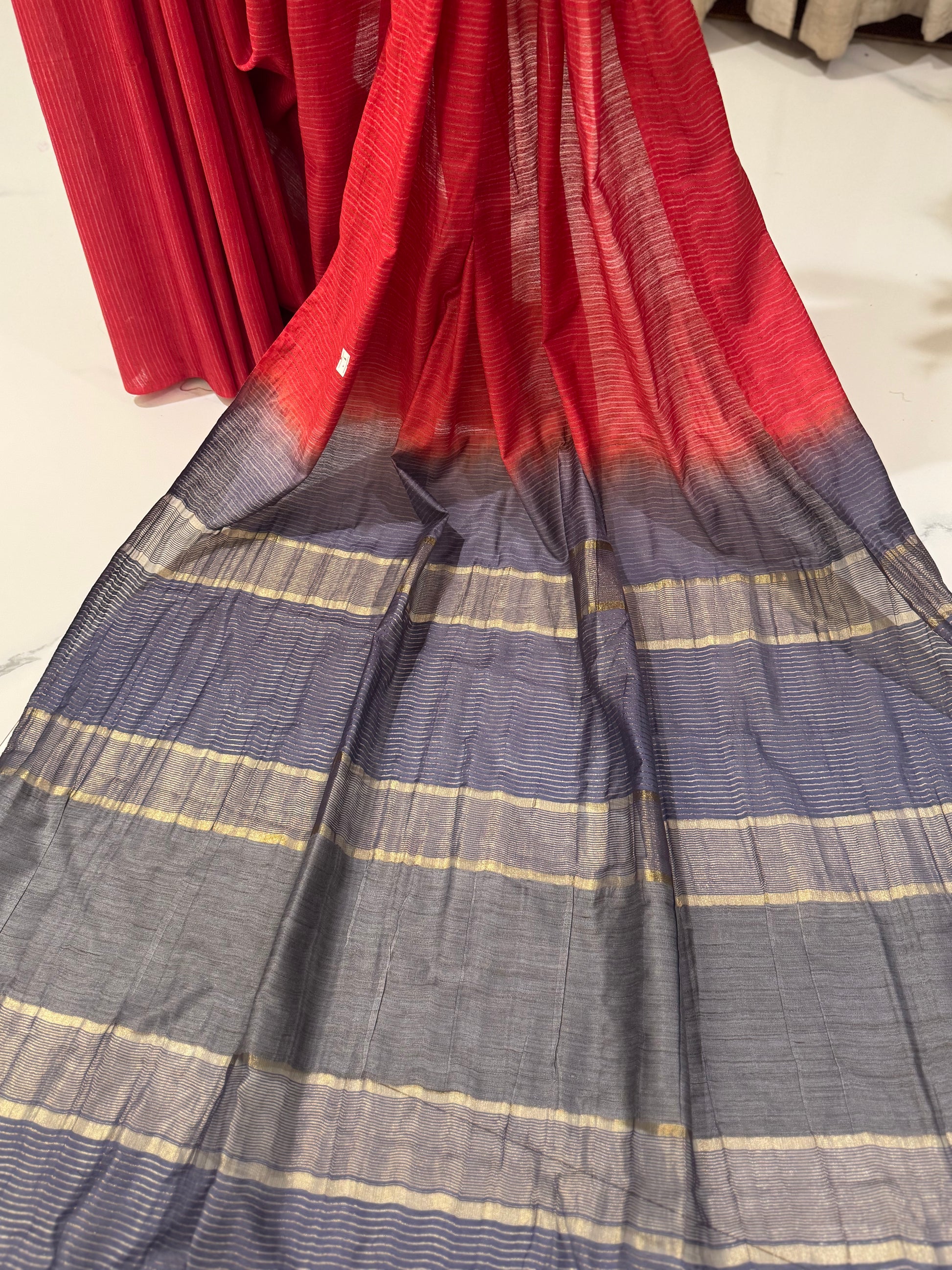 The striking contrast grey pallu adds a contemporary twist, beautifully balancing the boldness of red with the sophistication of grey. The saree is paired with a plain grey blouse, allowing the saree’s design and color combination to stand out effortlessly.