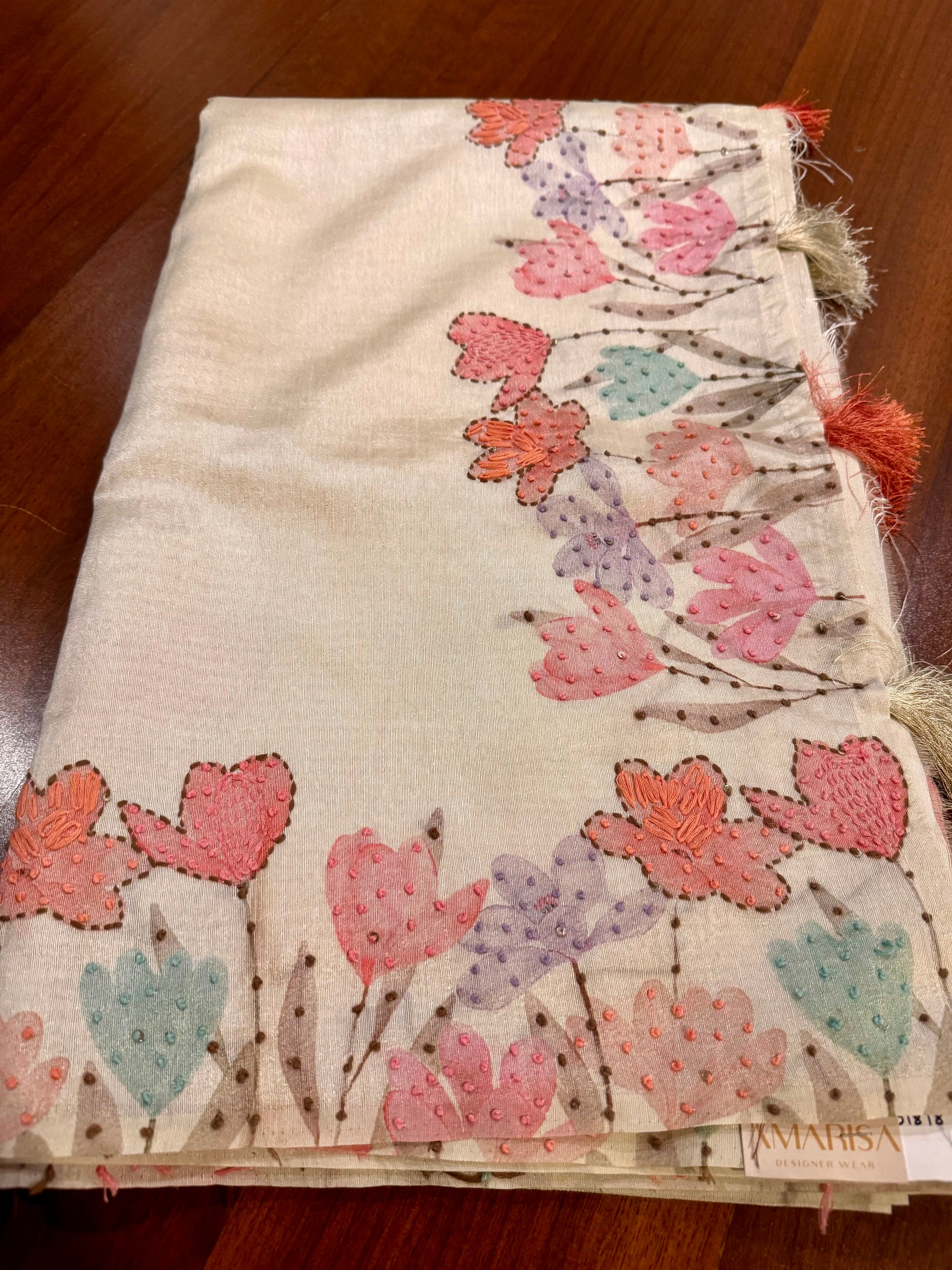 A beautifully crafted semi-tussar saree in an elegant ivory-beige shade, adorned with charming multicolour floral motifs. The flowers feature Kantha-style hand-inspired thread detailing with raised textured knots, giving the saree a soft handcrafted aesthetic.