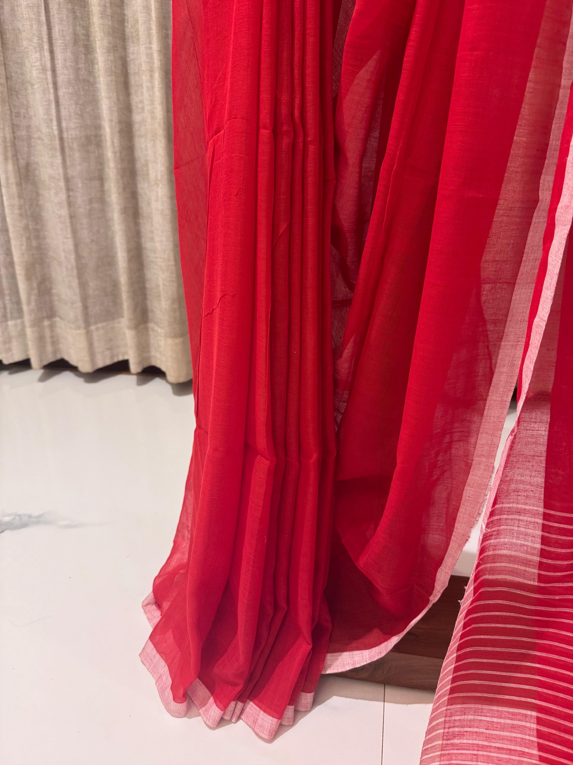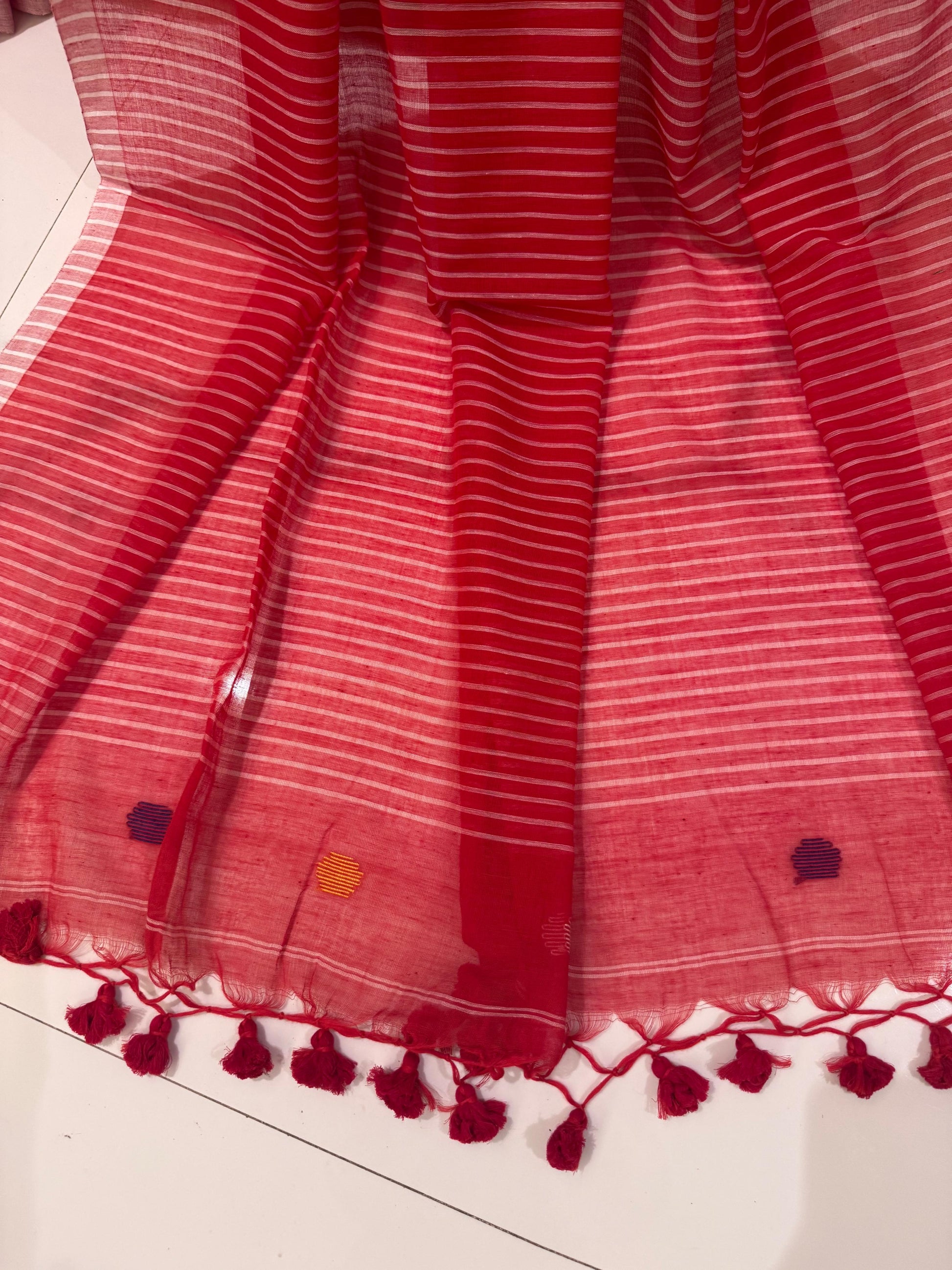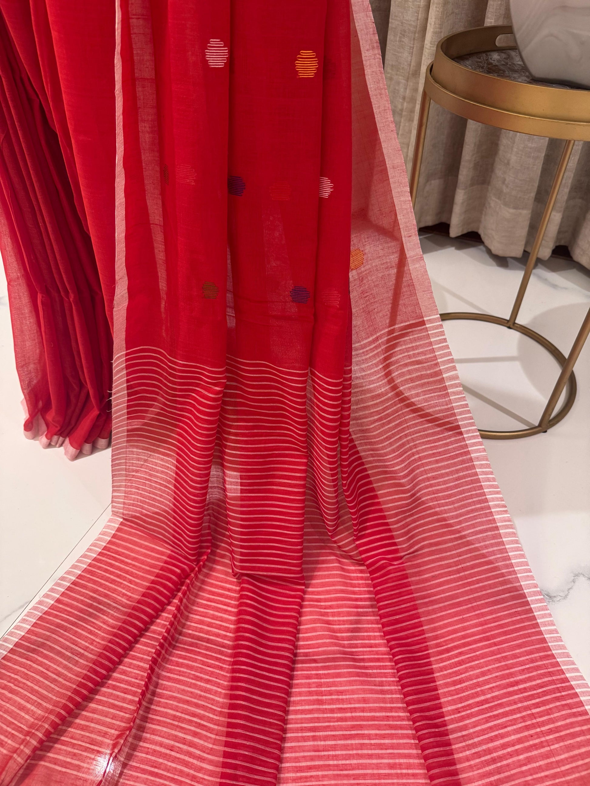 Drape yourself in timeless elegance with this soft cotton saree in a striking red hue. The saree features a subtle yet captivating design, adorned with delicate black buttis scattered across the body, adding a touch of charm and tradition. The highlight of the piece is its beautifully woven pallu, enhanced with bold black stripes that lend a modern contrast to the classic red base.