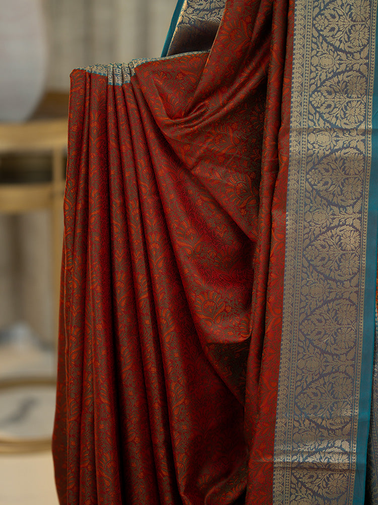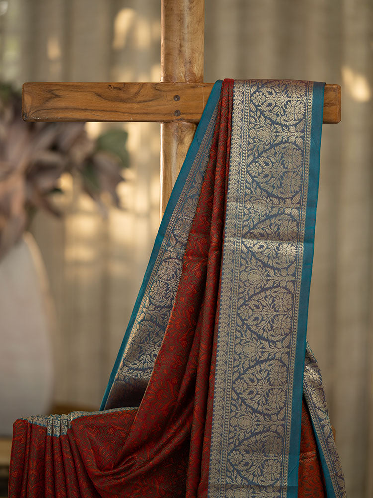 Color: Rich maroon with exquisite jacquard work over the body and a contrasting green border.