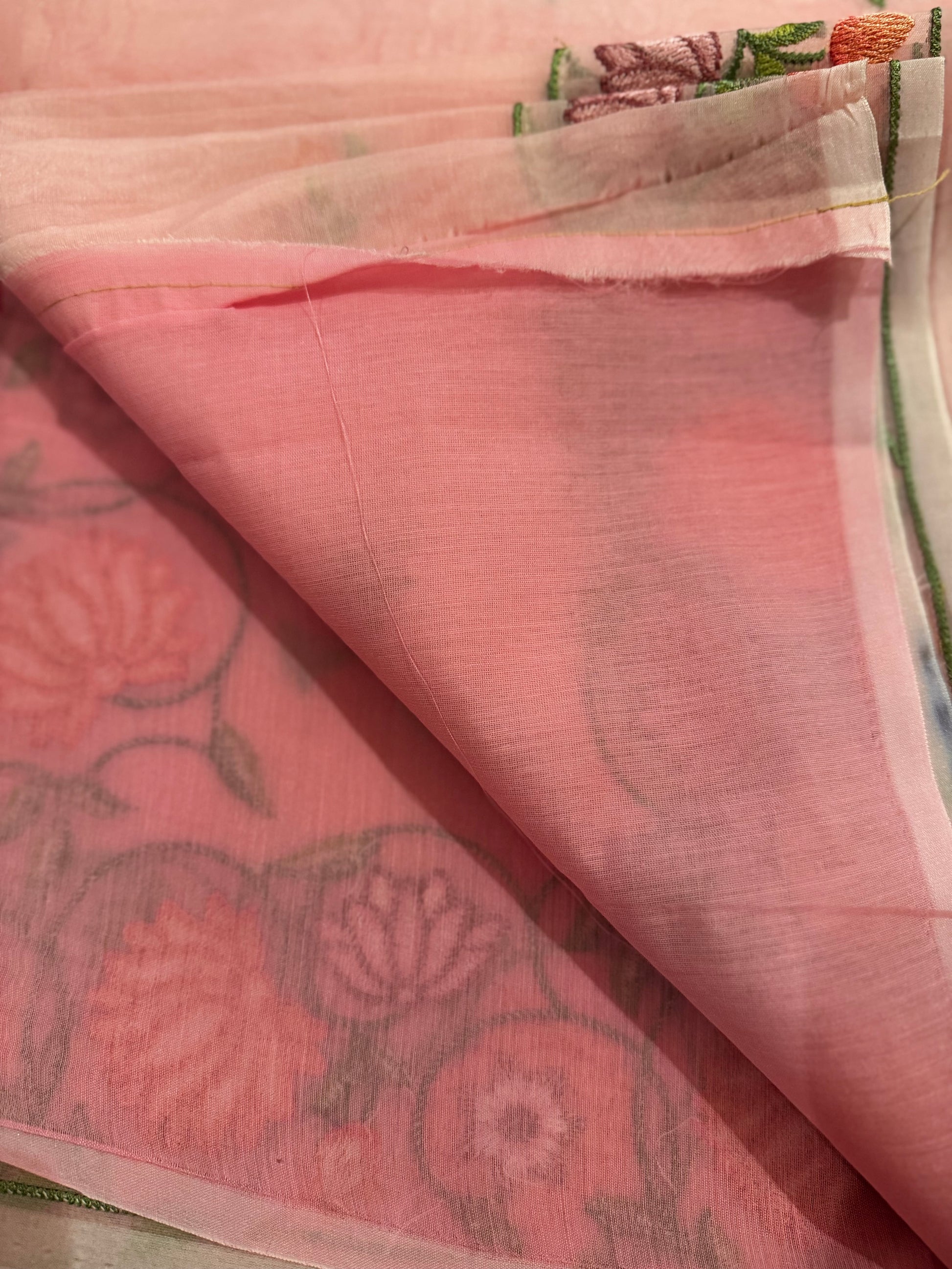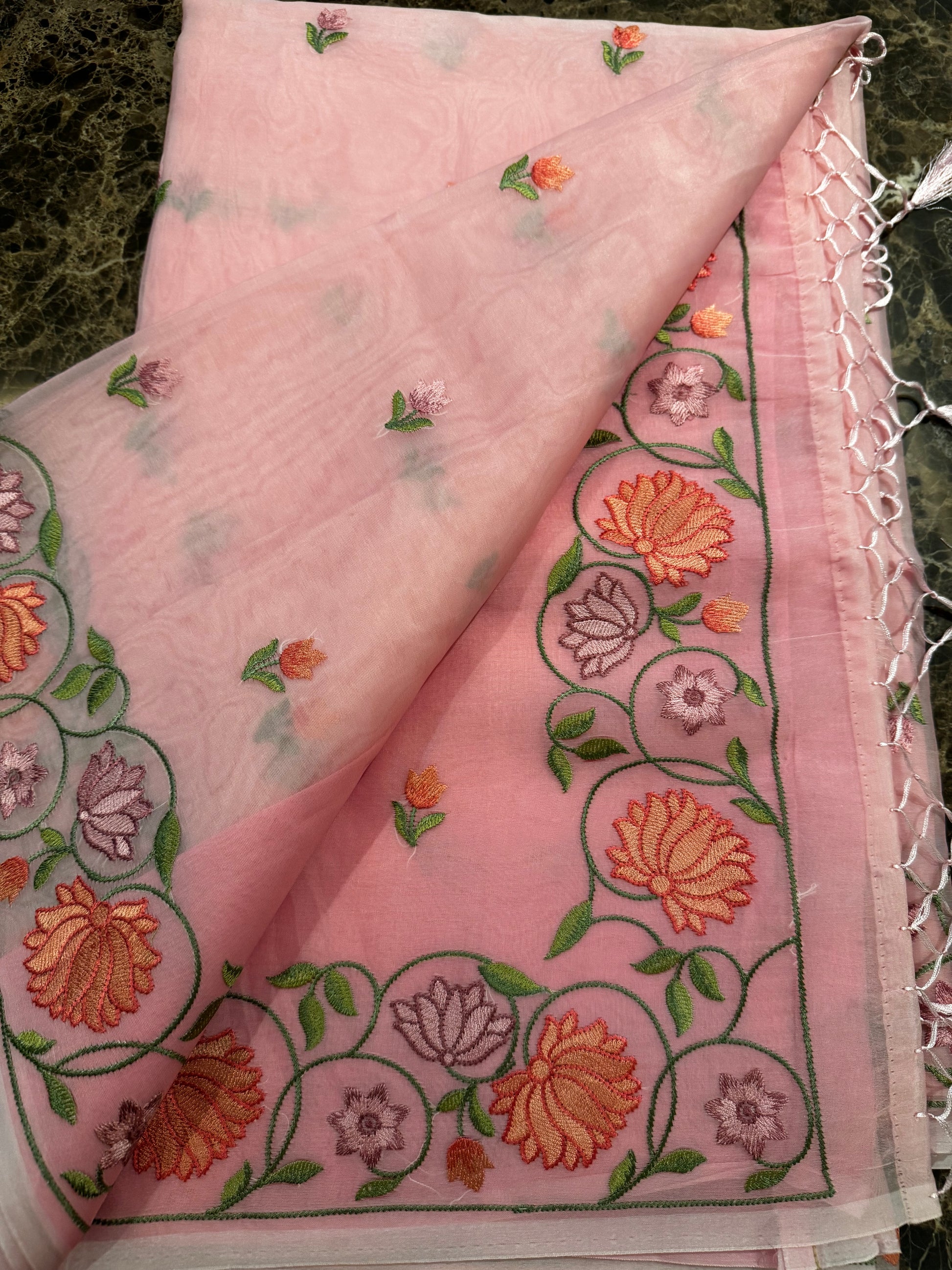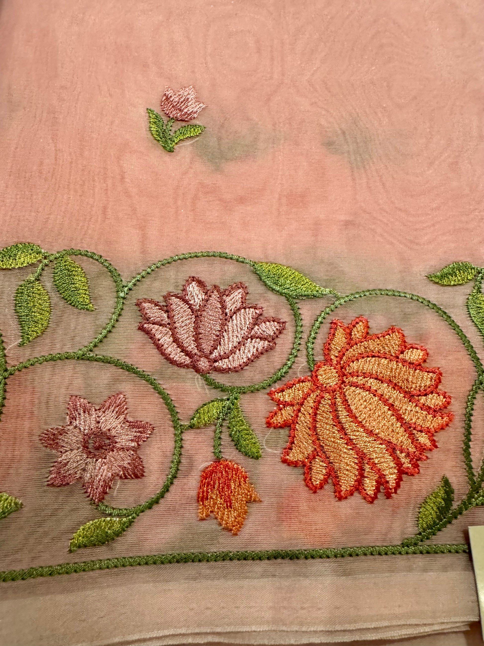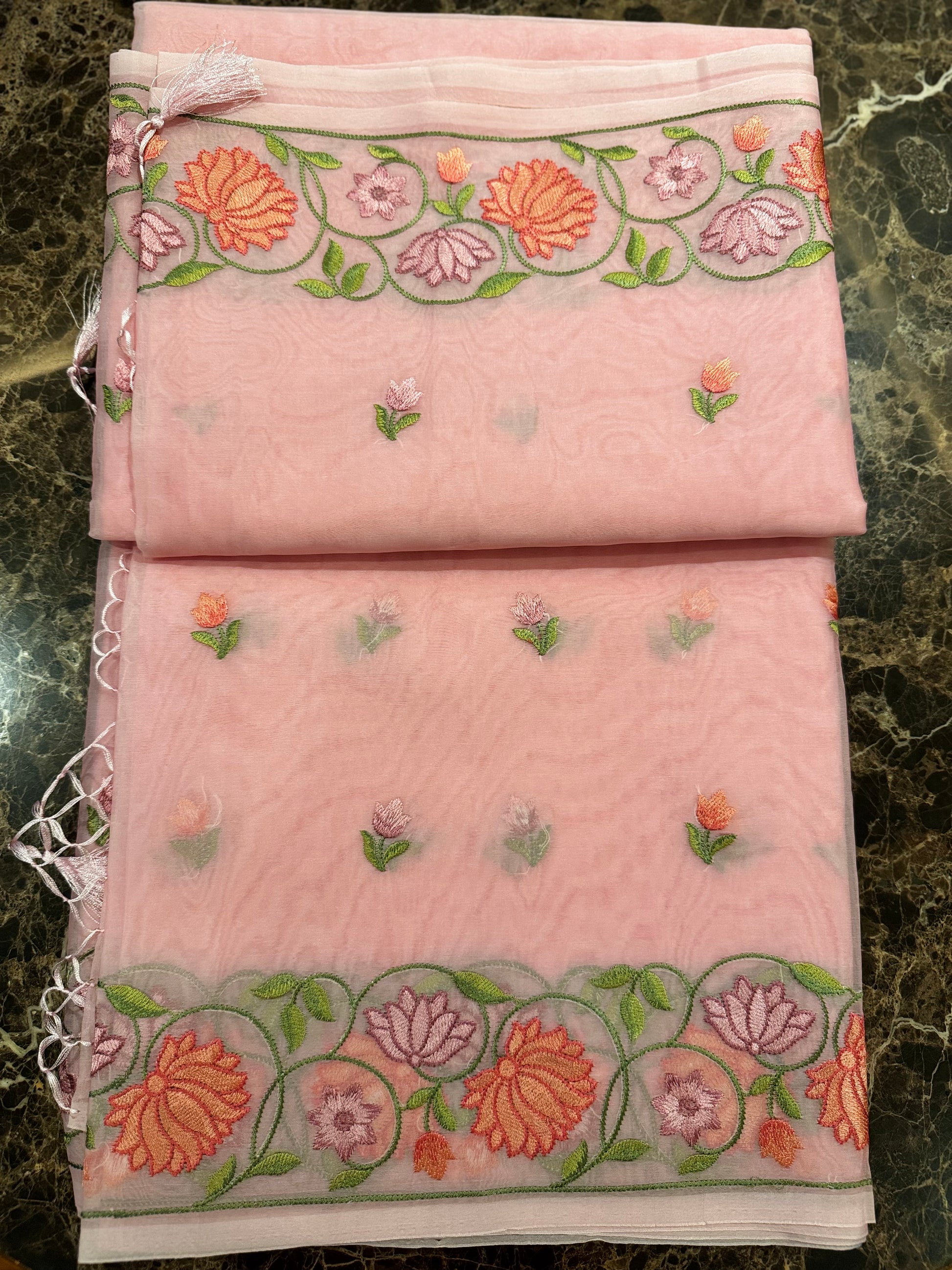 Elevate your festive and occasion wear with this stunning Semi Organza saree featuring exquisite multi-thread floral embroidery across the borders and pallu. The saree comes in a soft, graceful pink tone that beautifully balances the vibrant shades of pink, peach and red florals, giving it a rich and elegant appeal.