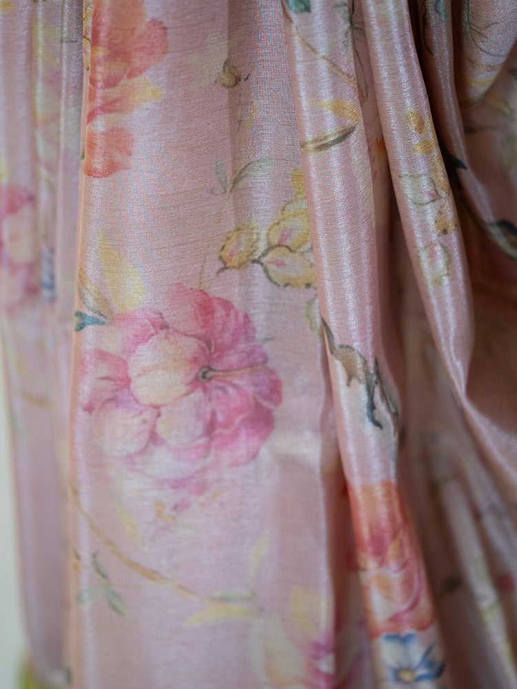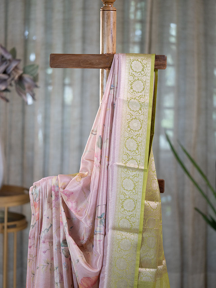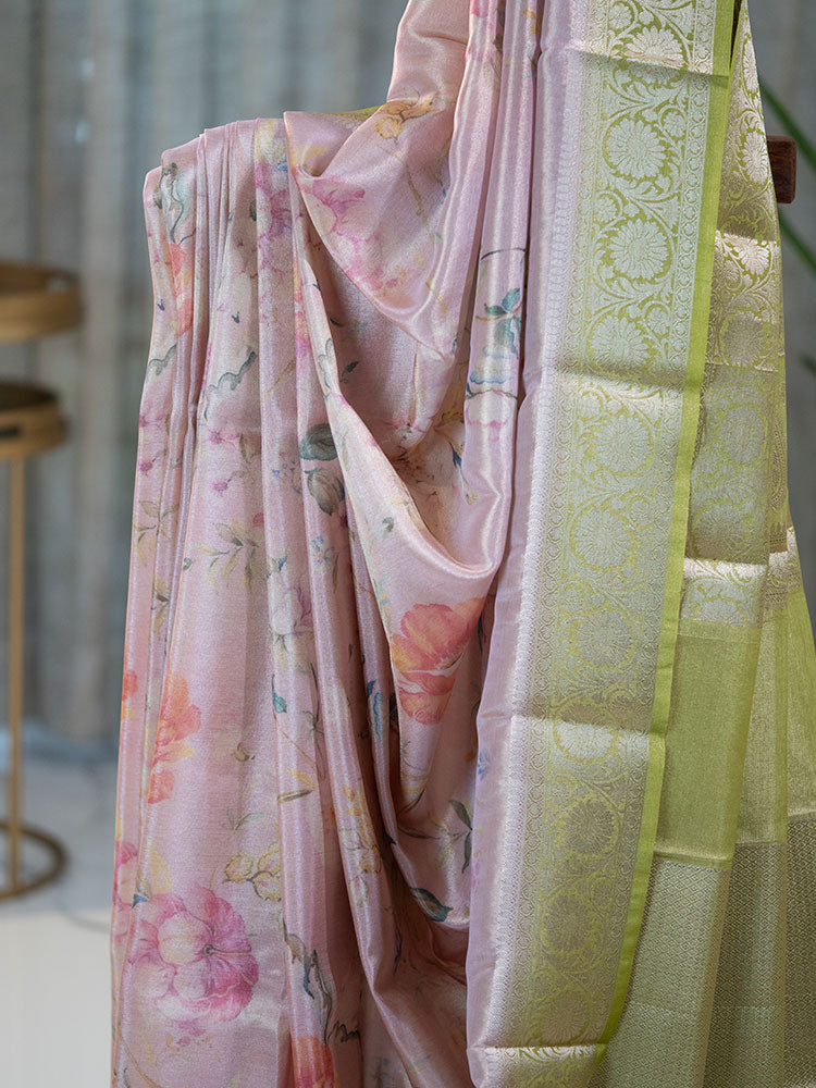 Tissue Silk Saree in Pink with Digital Floral Print and Green Border