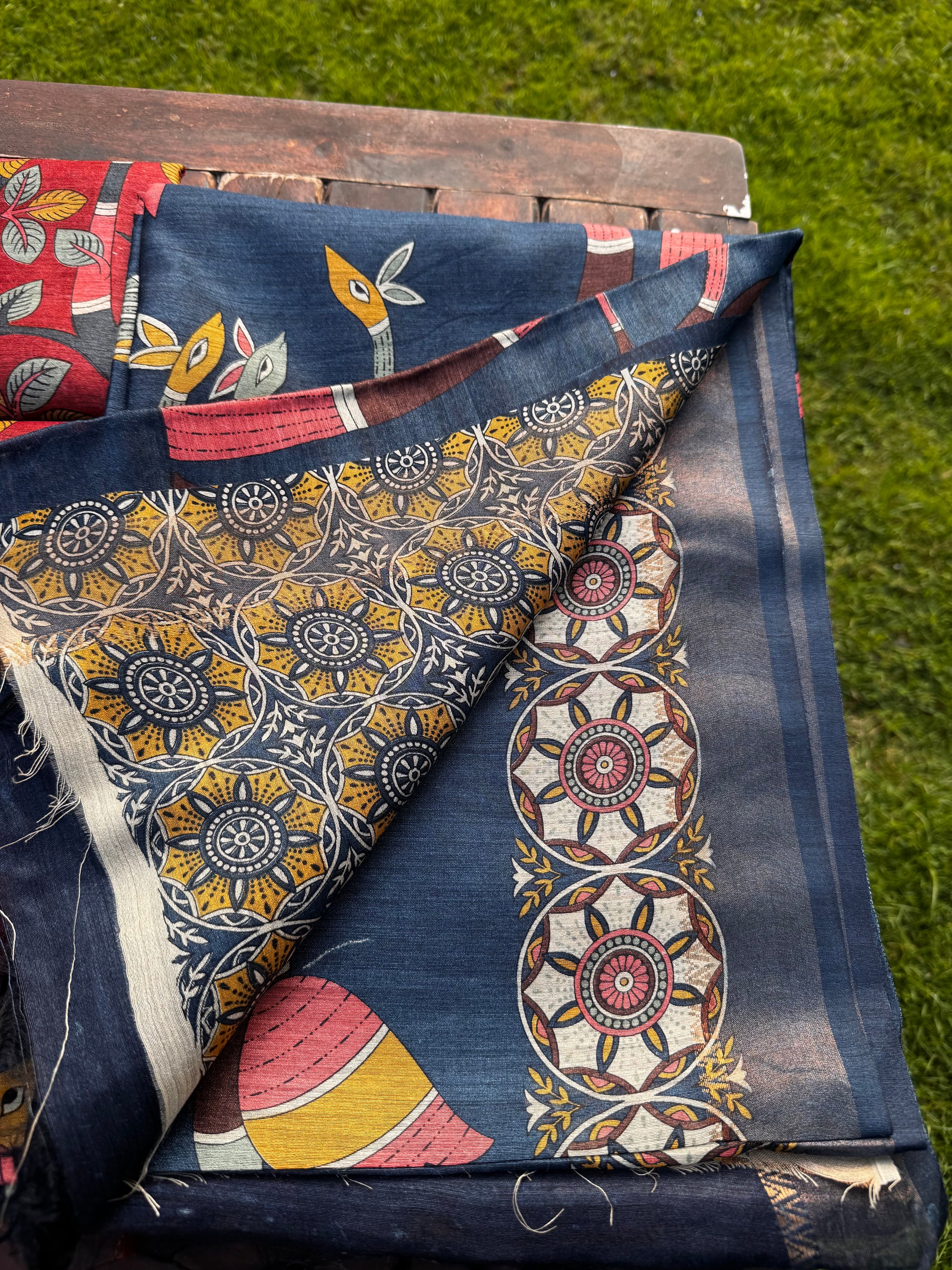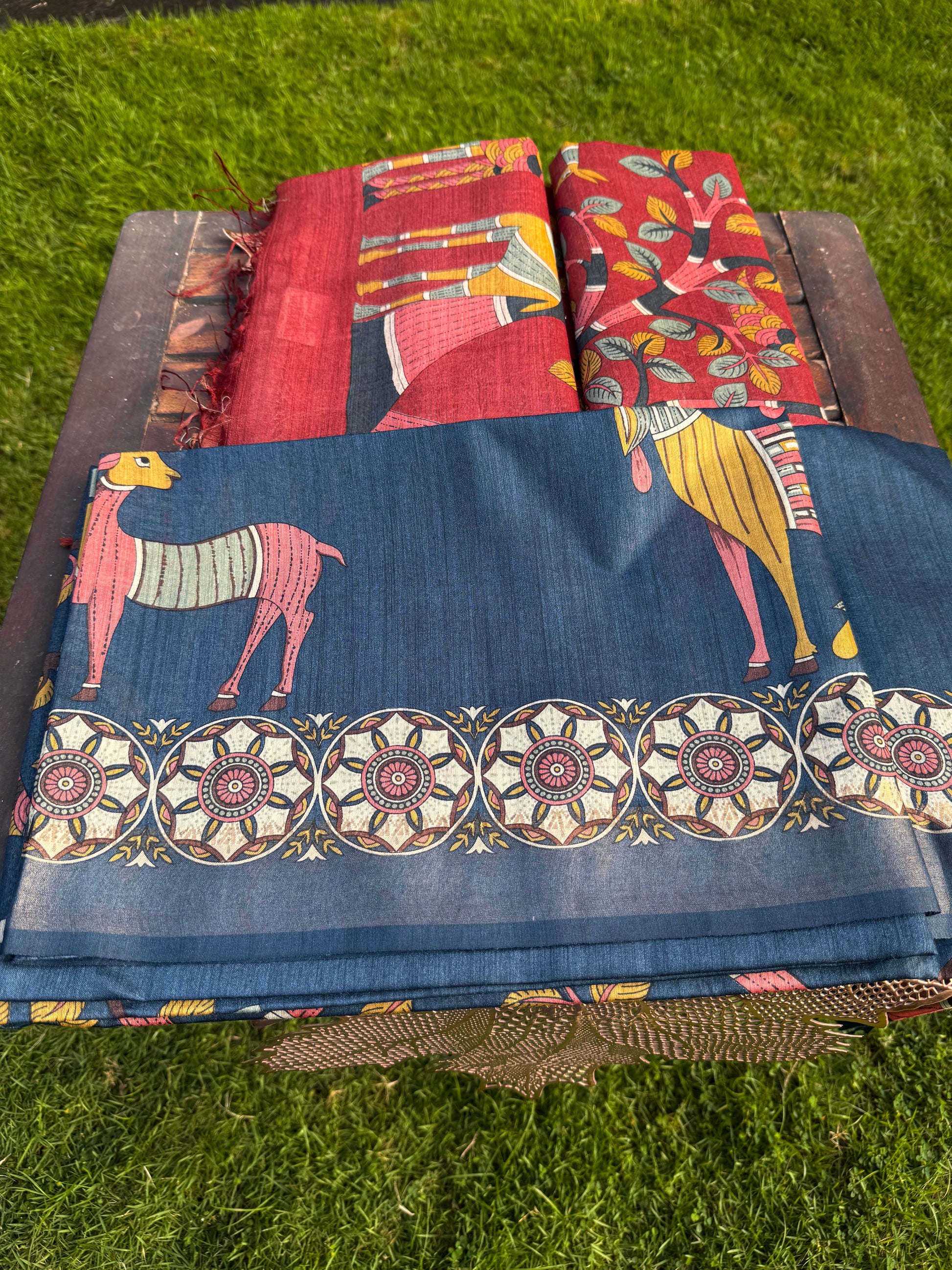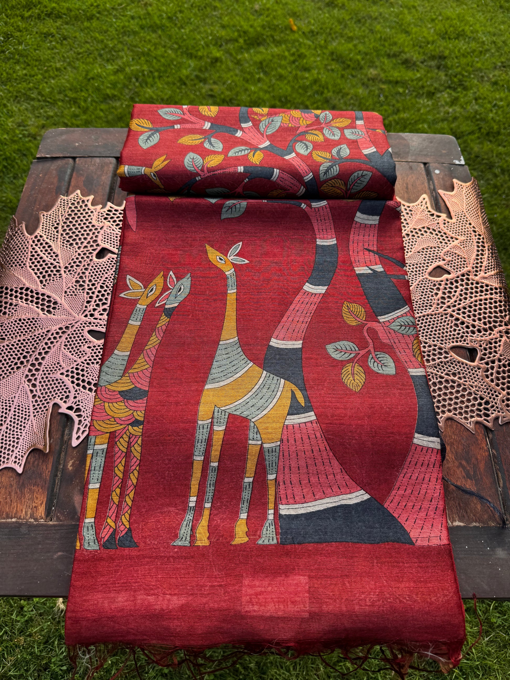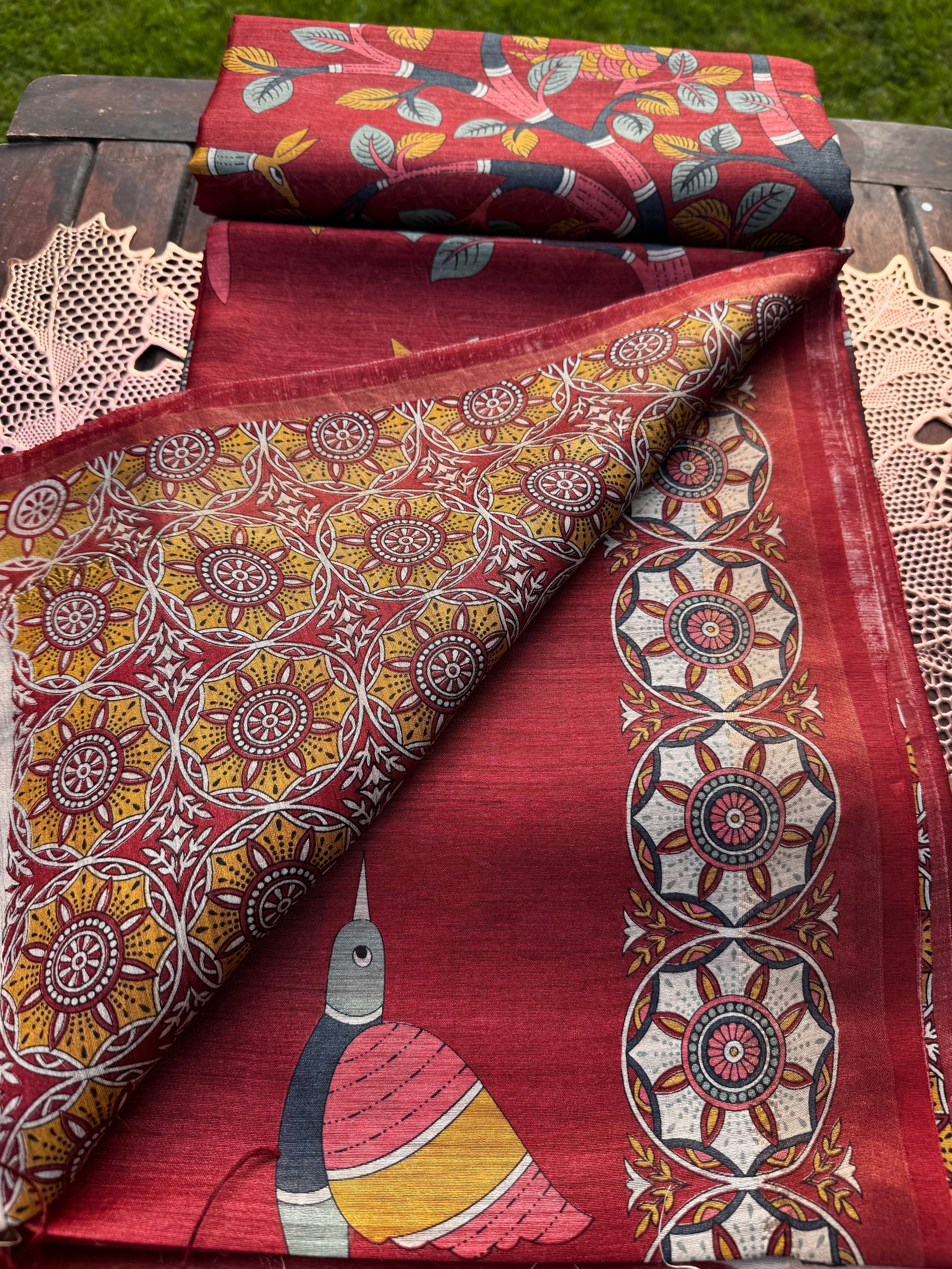 - Texture: Lightweight, soft, and breathable with a natural tussar sheen