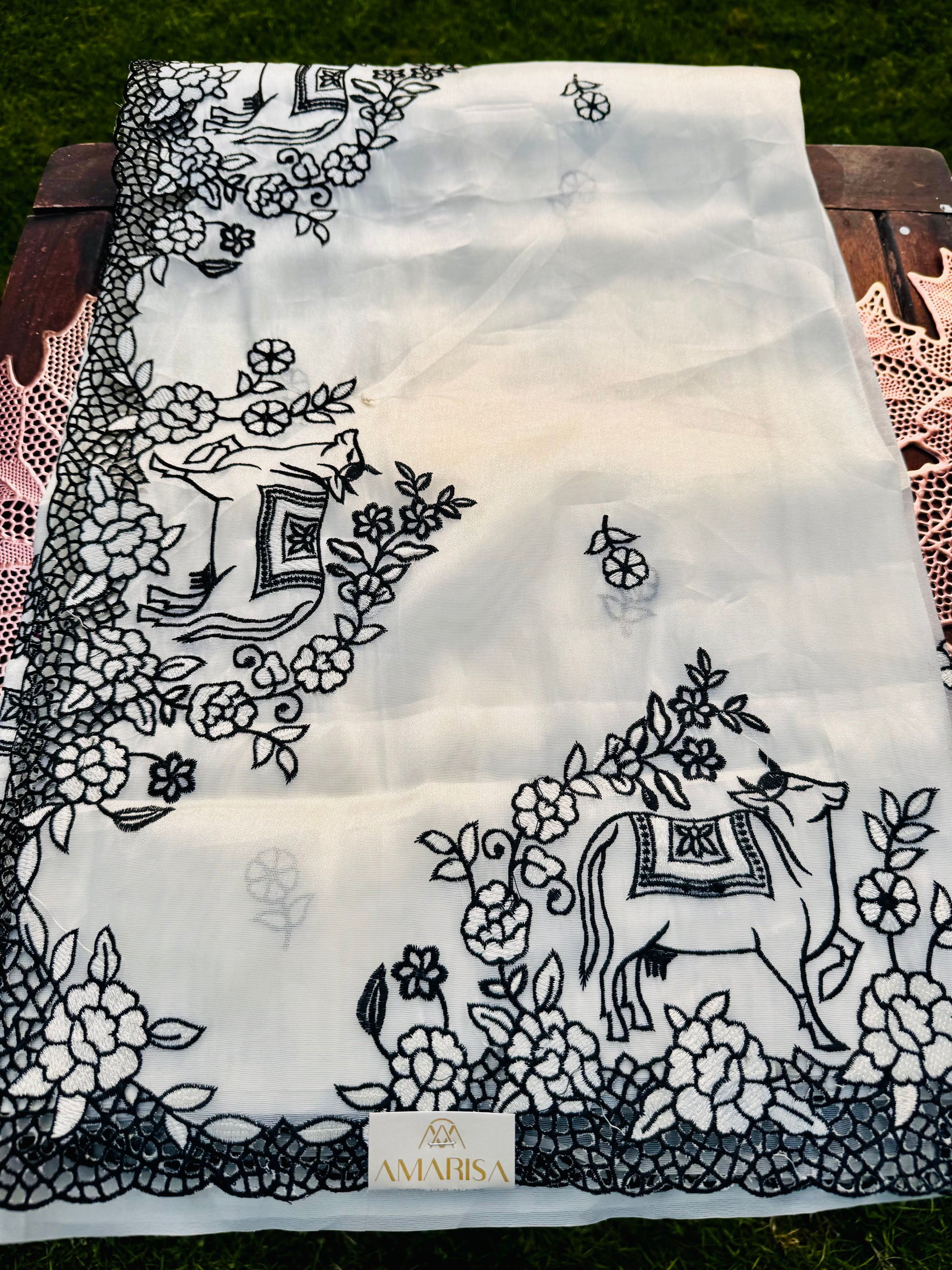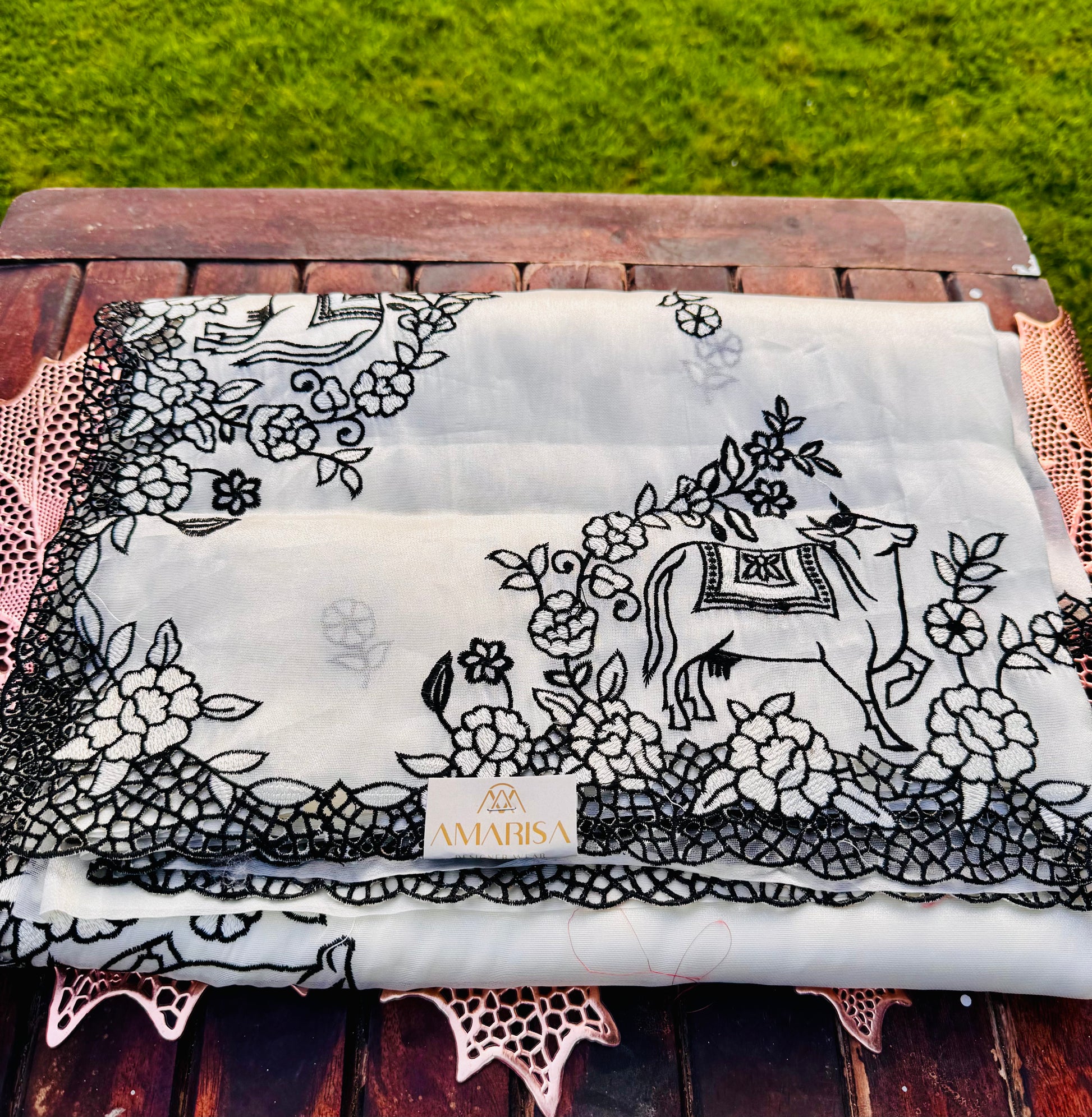 Bring home a blend of artistry and grace with this exquisite Organza Tissue Saree featuring intricate black floral embroidery and a striking traditional cow motif and cut workLightweight, sheer and effortlessly elegant â this saree is designed to make every occasion feel special.