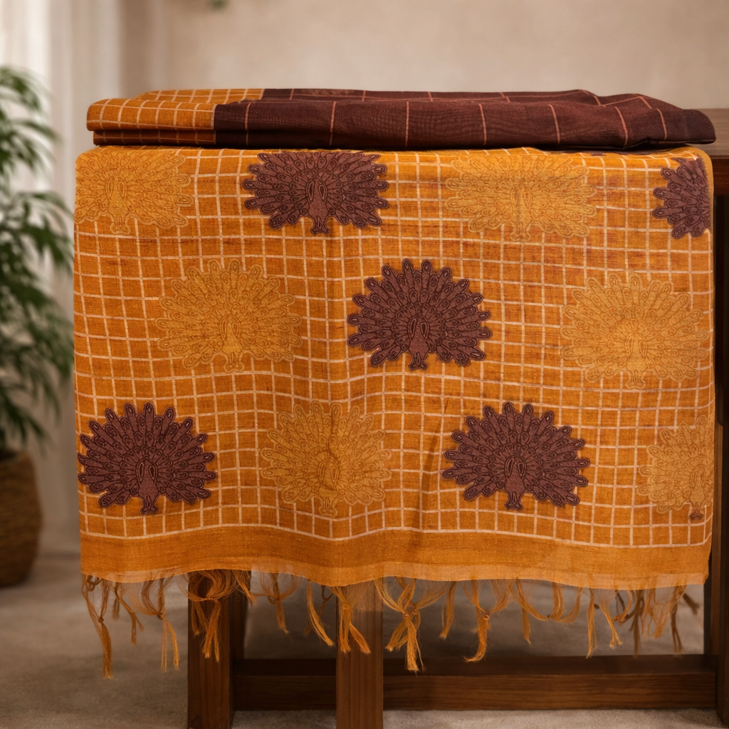 The saree features a rich earthy brown body adorned with subtle checkered patterns and delicate peacock motifs, lending it a handcrafted, artisanal charm. Complementing the body is a warm mustard pallu and border, detailed with fine grid checks and coordinated motifs that add depth and contrast without overpowering the design.