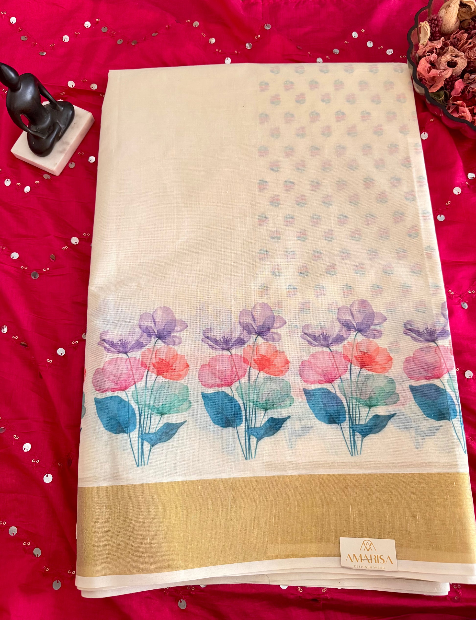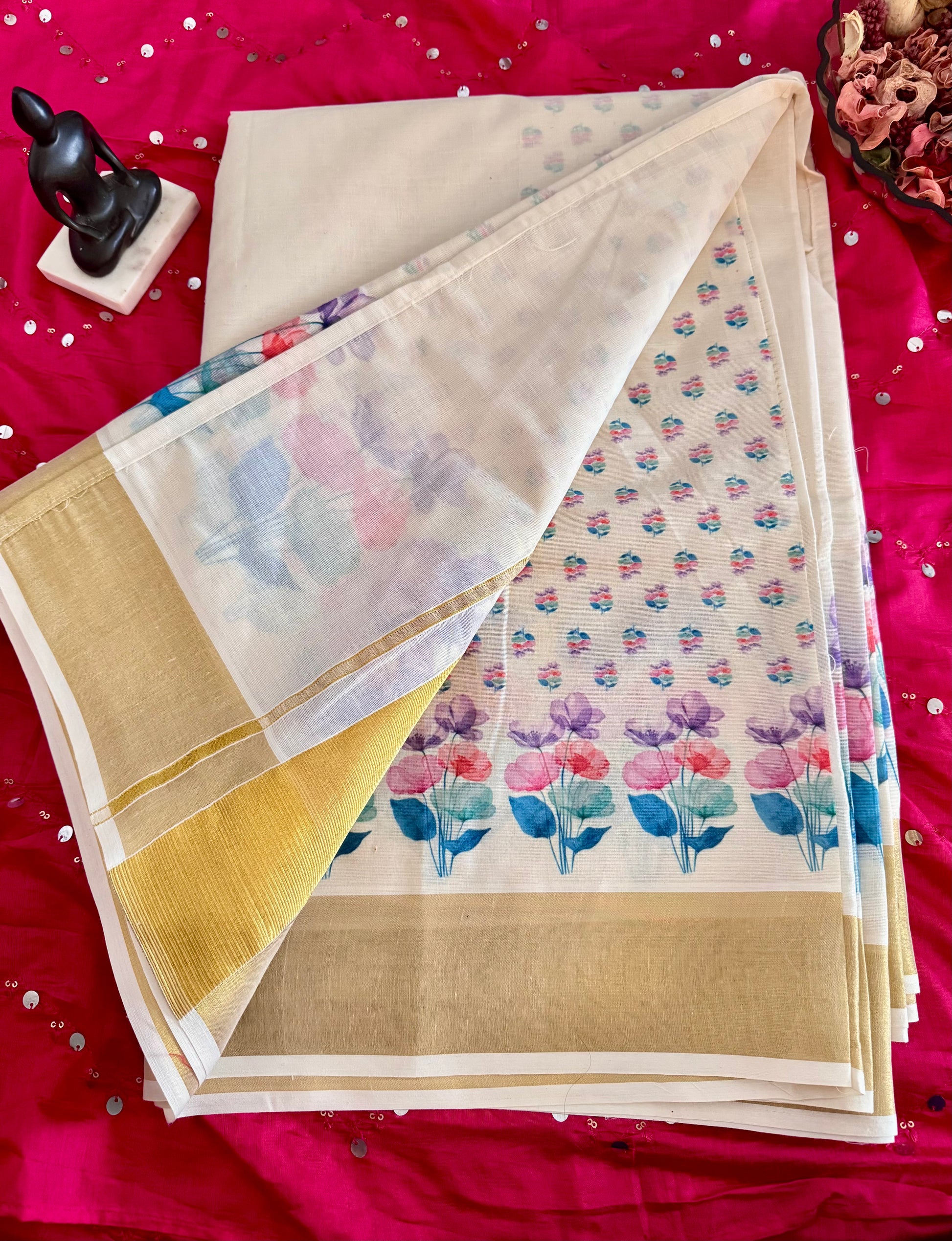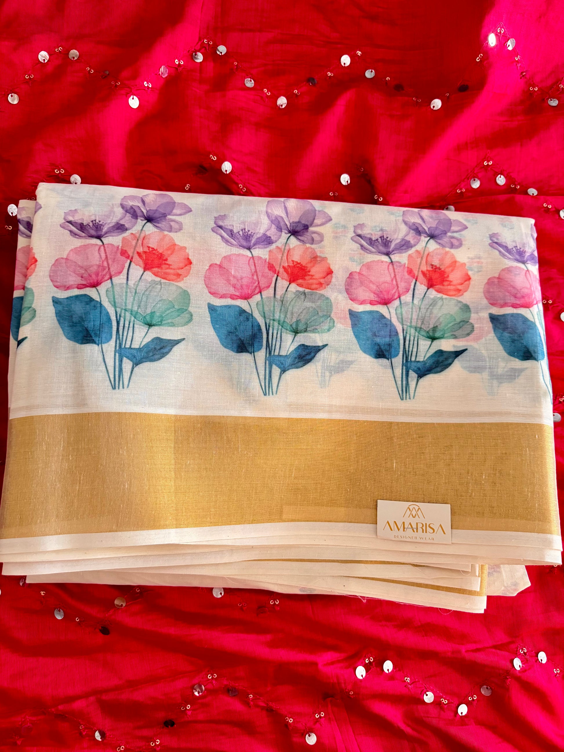 Kerala Saree with Vibrant Multicolored Floral Prints & Blouse