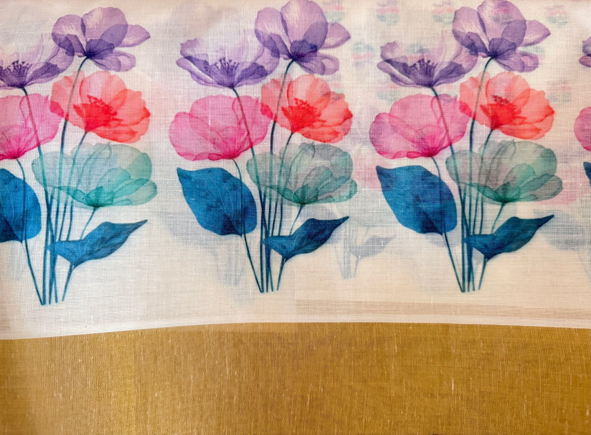 - Vibrant multicolored floral prints throughout the saree