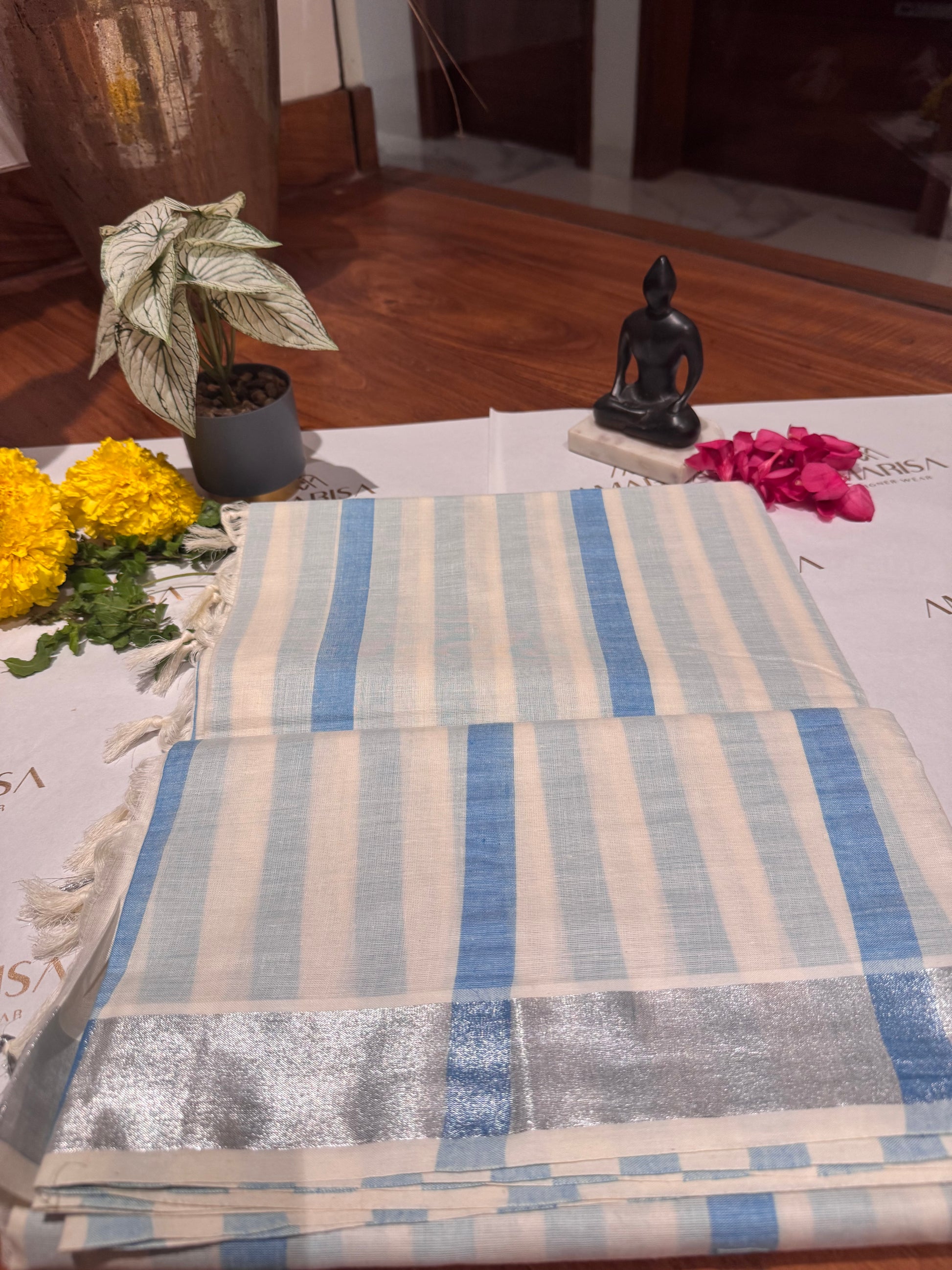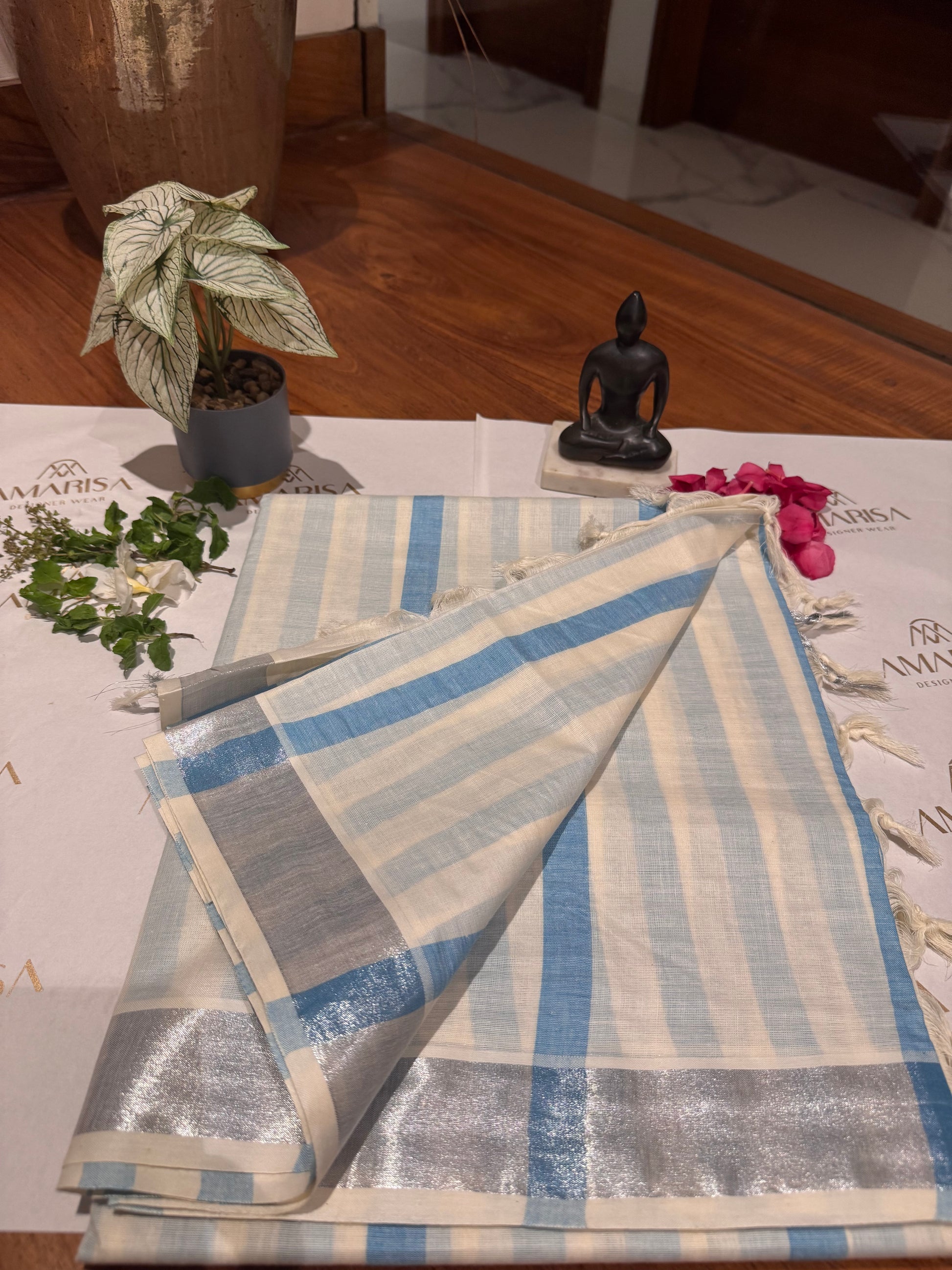Grace your festive moments with this elegant Kerala cotton saree, crafted in soft off-white with serene blue vertical stripes. The highlight of the saree is its striking silver zari border that adds a modern touch to the traditional weave. Lightweight and breathable, this saree perfectly blends simplicity with sophistication, making it ideal for casual festivities, pujas, or elegant day wear.