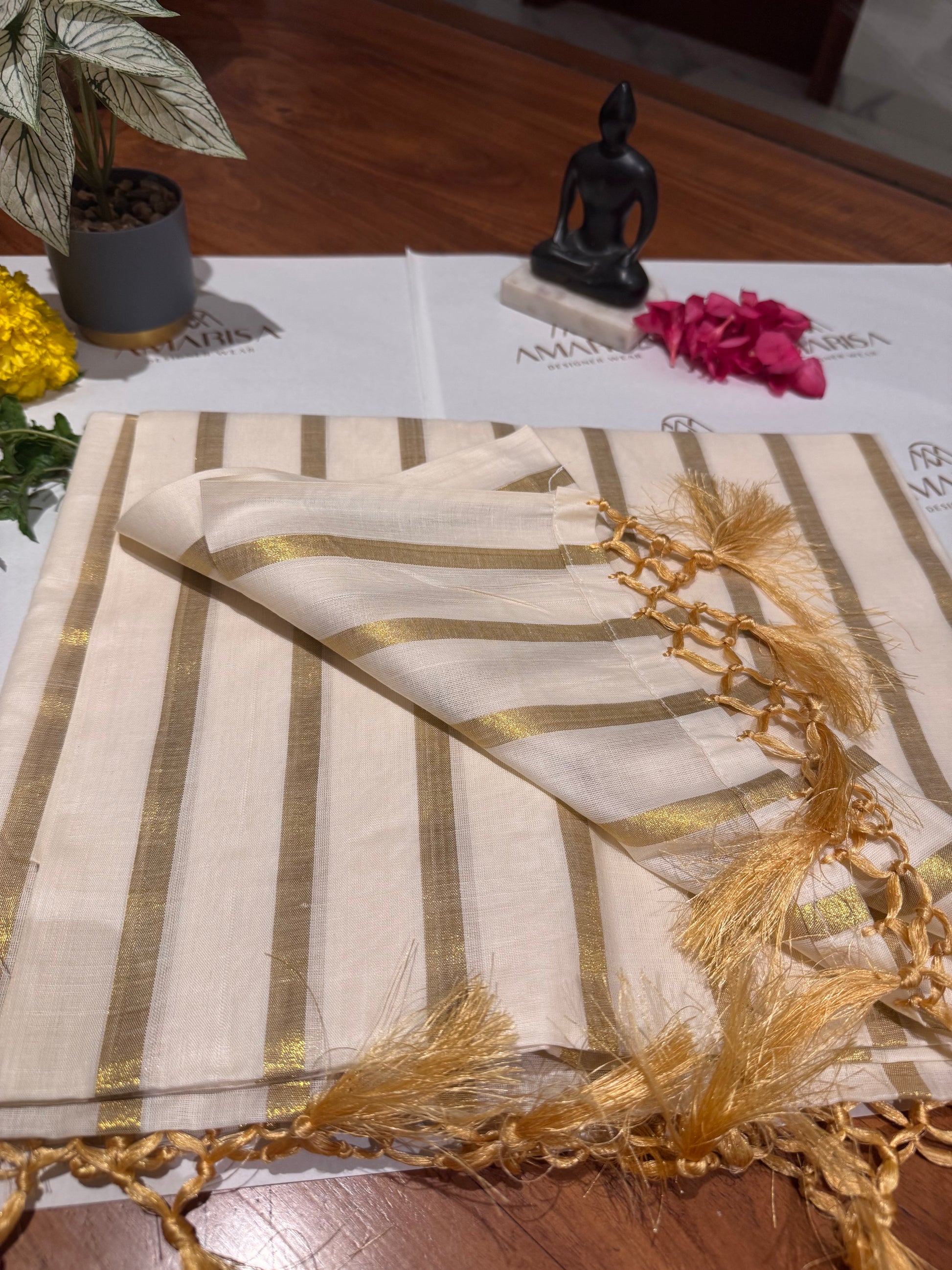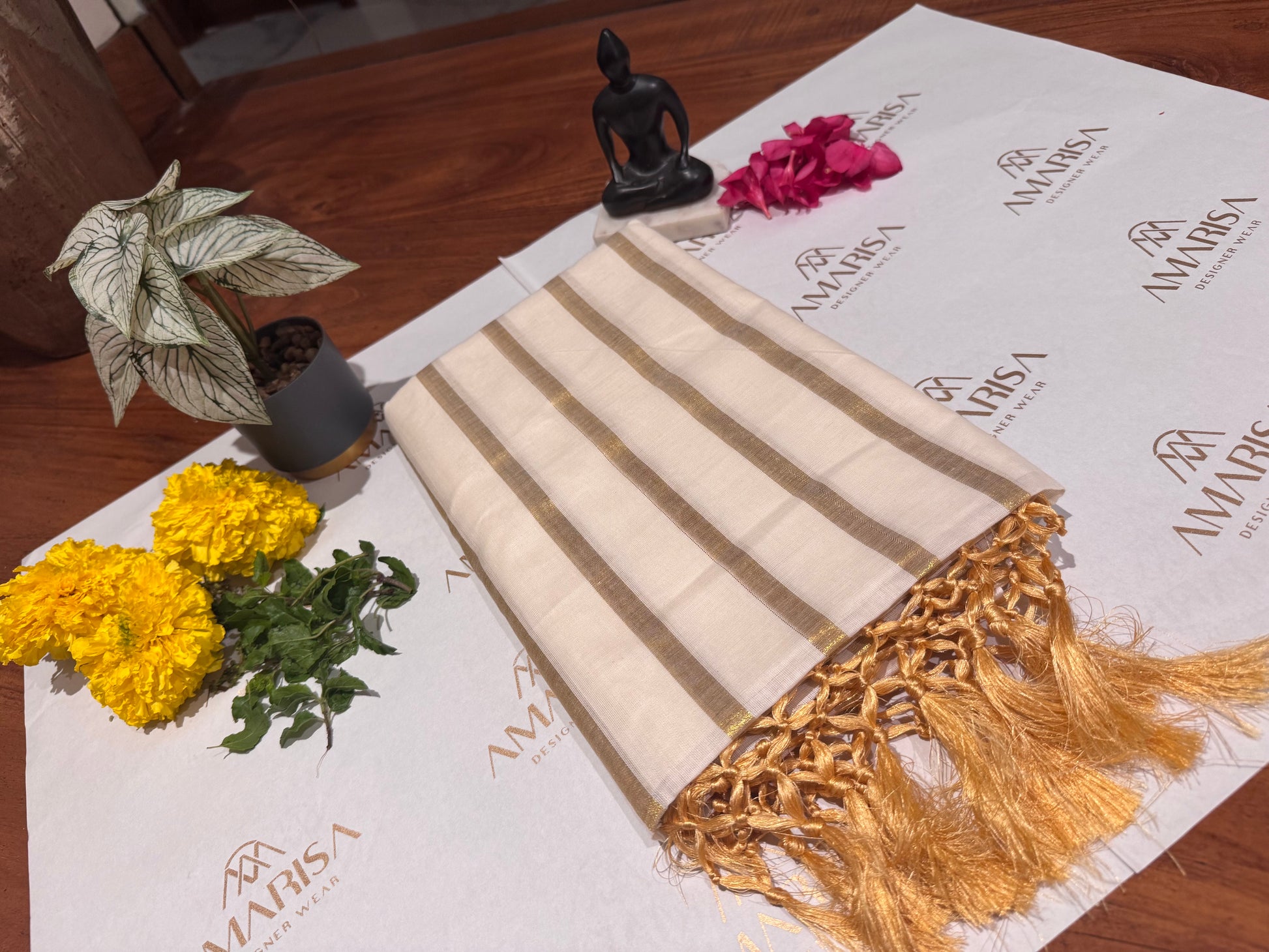 Grace your festive moments with this elegant Kerala cotton saree, crafted in soft off-white with golden stripes and golden tassel finish on pallu.Lightweight and breathable, this saree perfectly blends simplicity with sophistication, making it ideal for casual festivities, pujas, or elegant day wear.