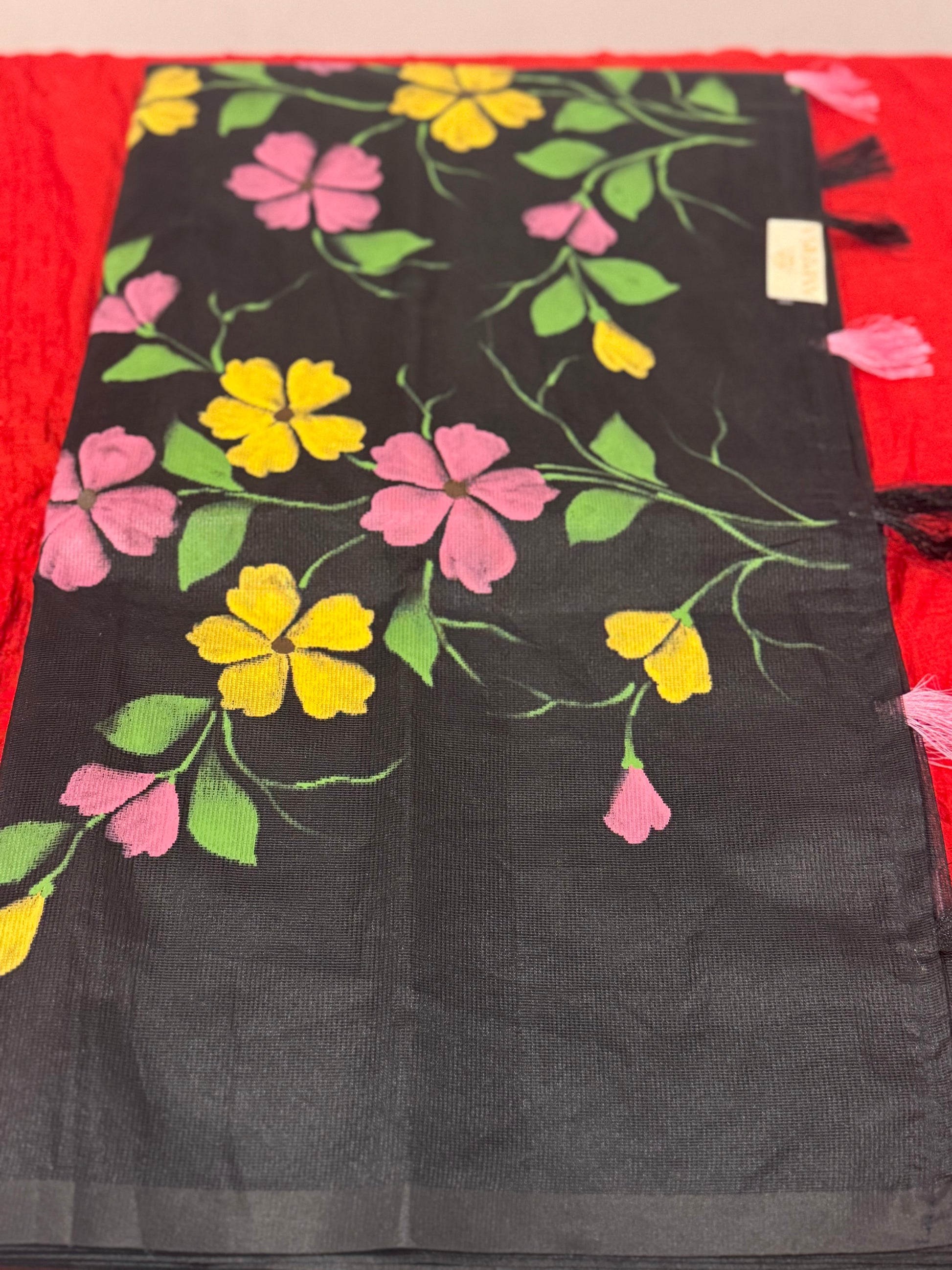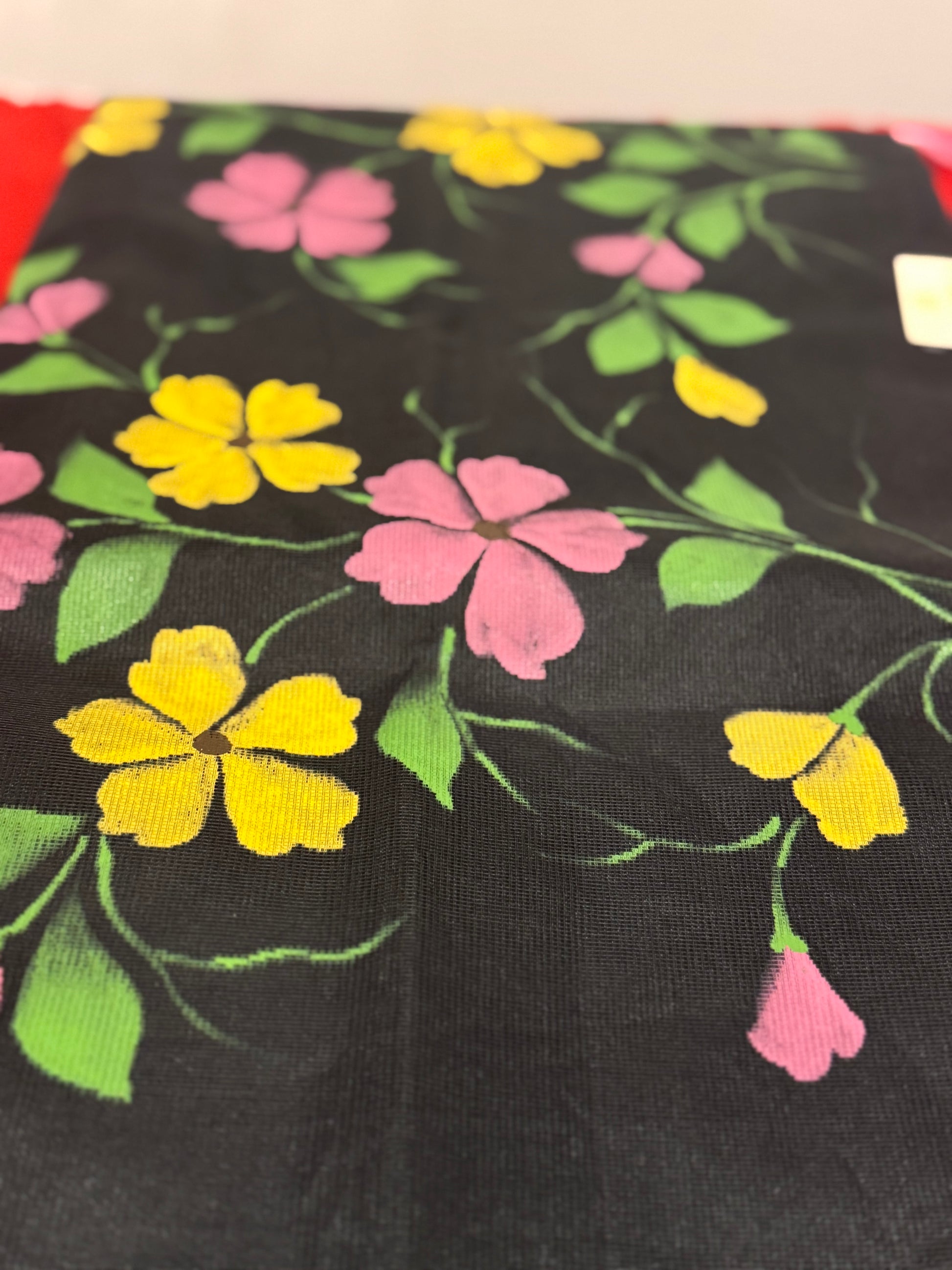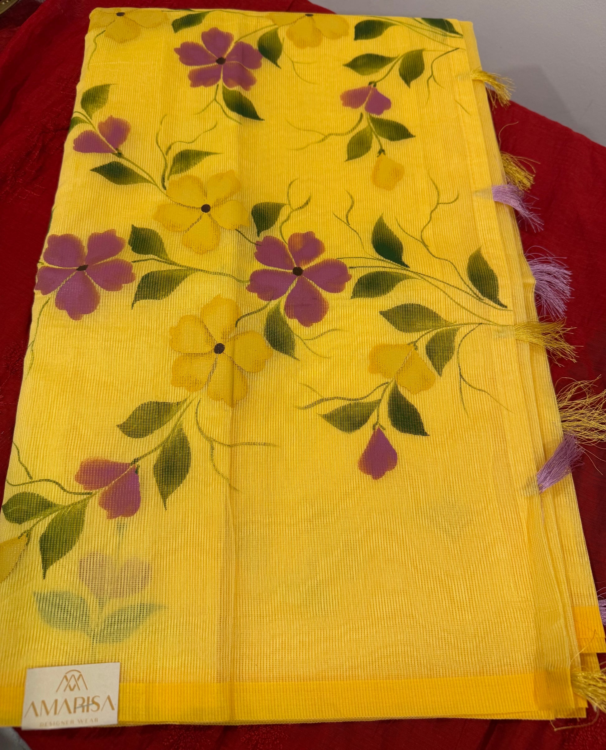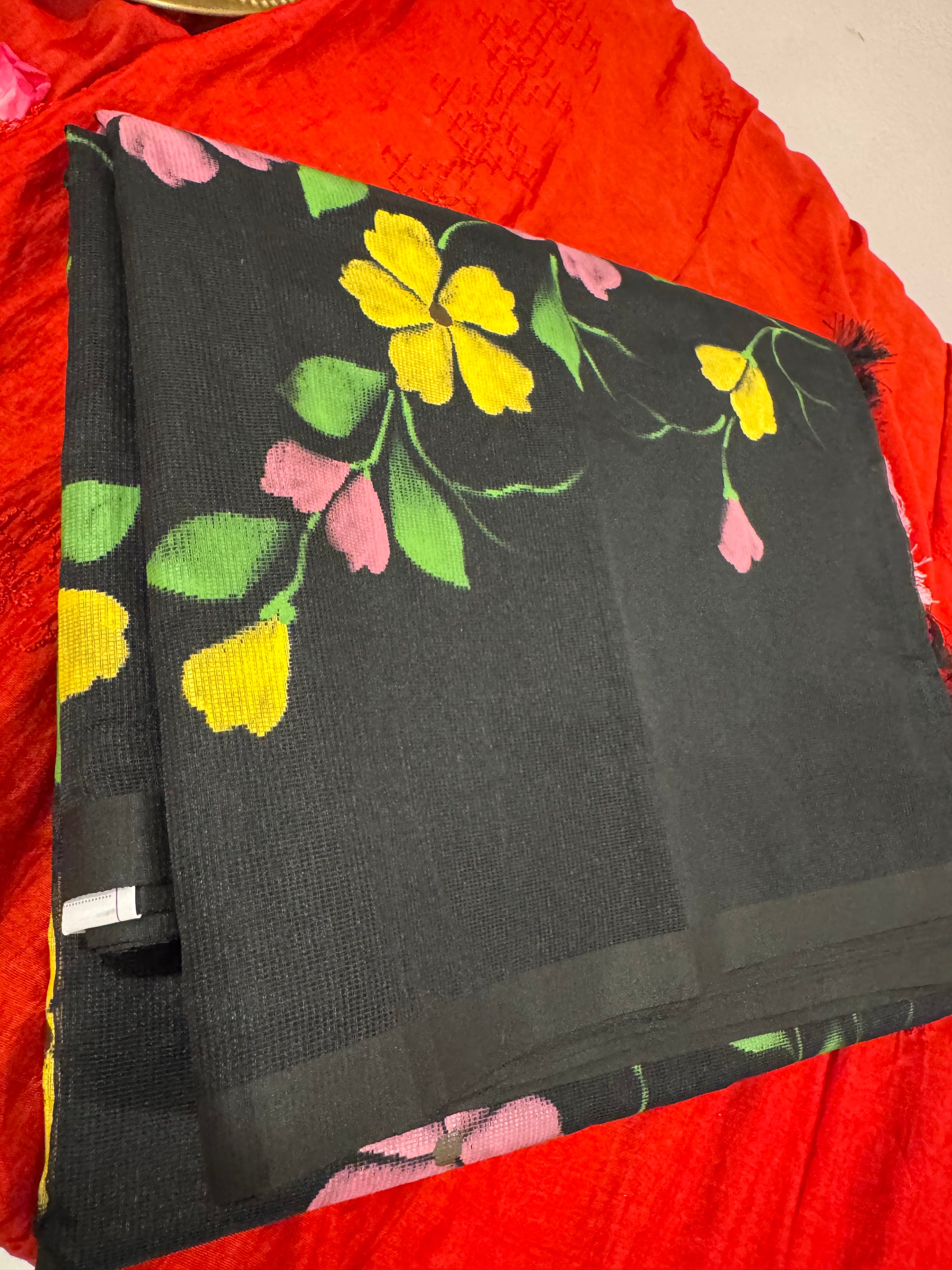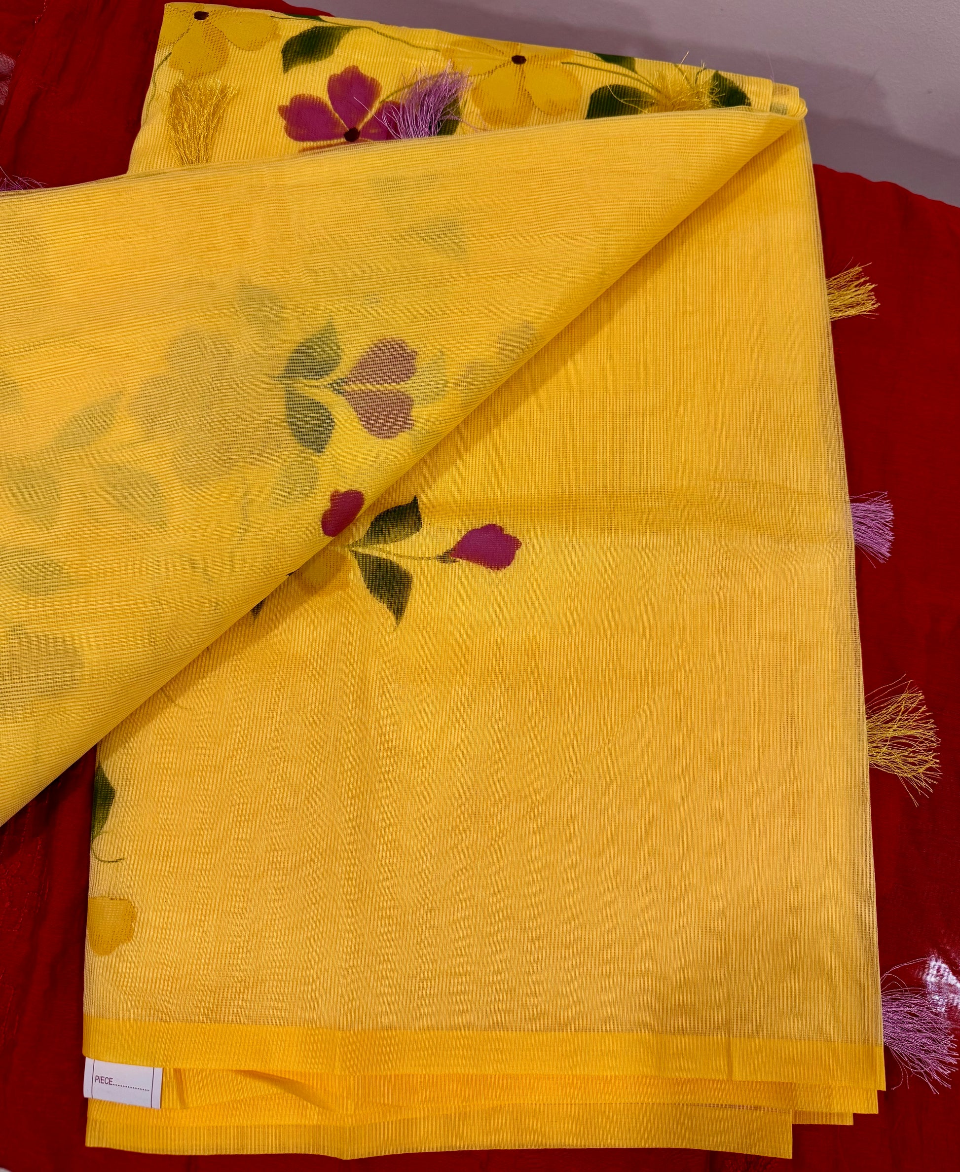 Radiate vibrant charm in this bright yellow supernet saree adorned with beautiful floral prints. The lightweight, sheer texture of the supernet fabric makes it perfect for summer wear, offering comfort without compromising on style. The saree features an elegant spread of purple and yellow flowers with lush green leaves, adding a fresh and lively touch to your ensemble. Finished with subtle borders and soft fringes, it is ideal for casual outings, festive occasions, or day functions. Pair it with a matching or contrast blouse for a graceful, breezy look.