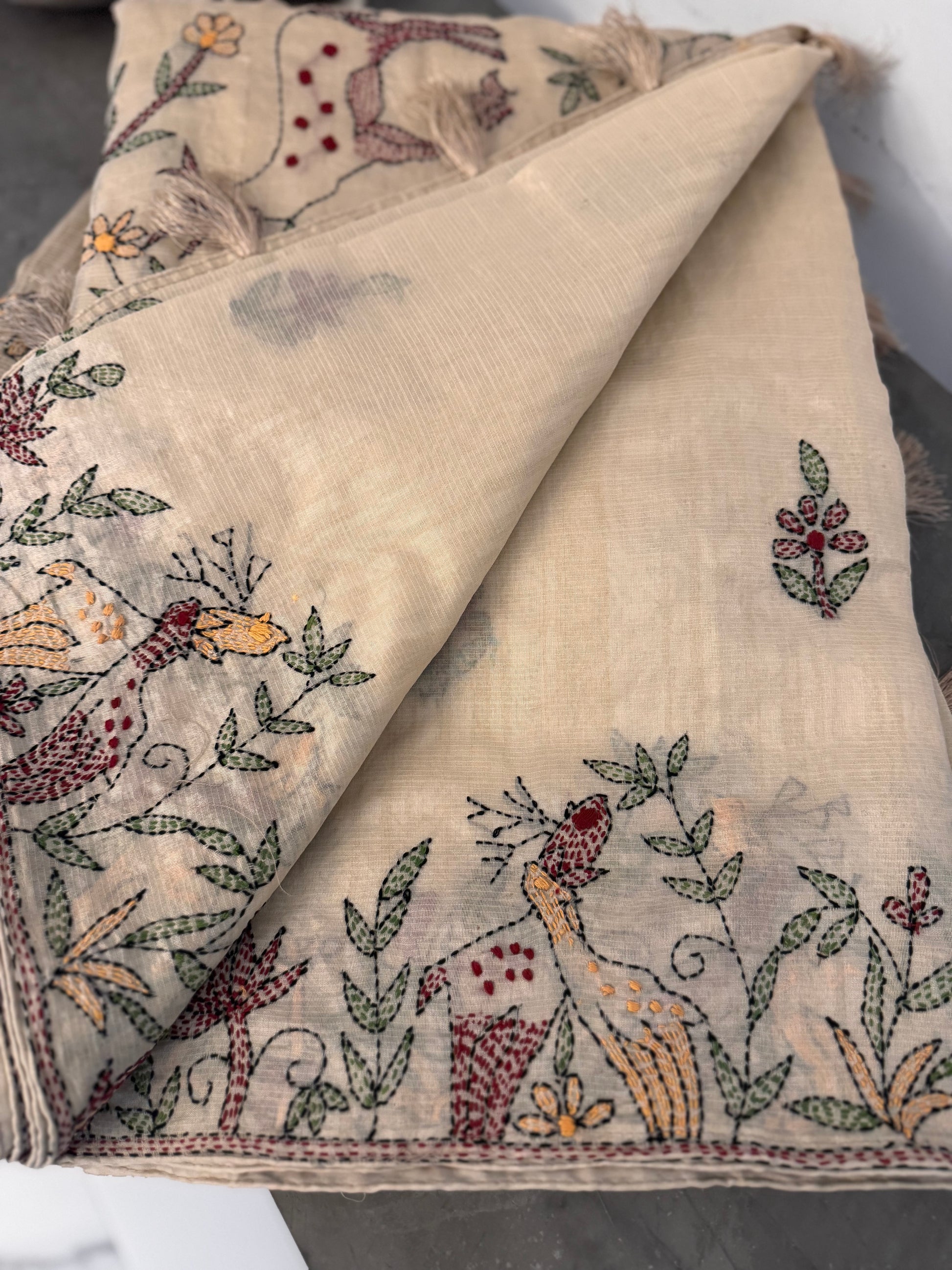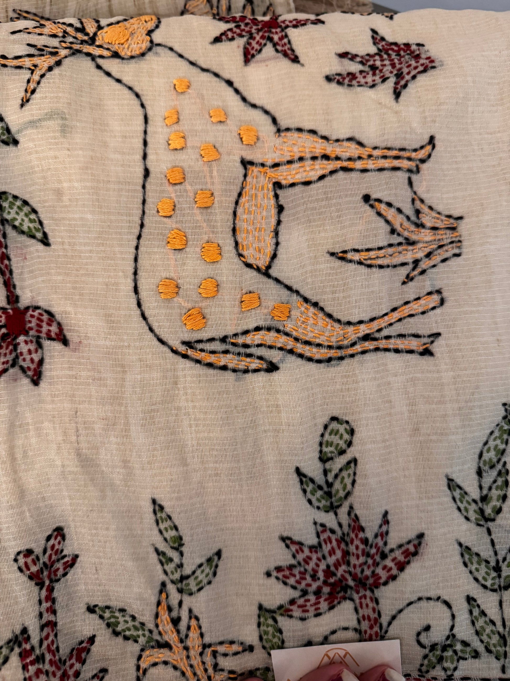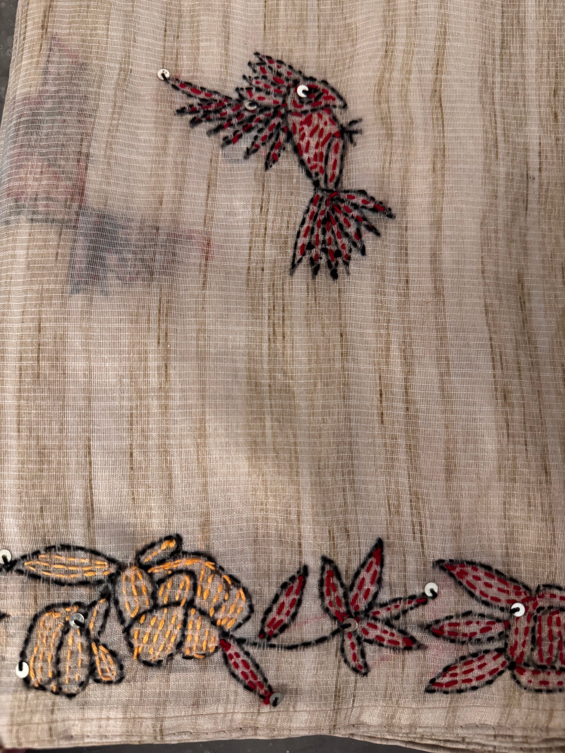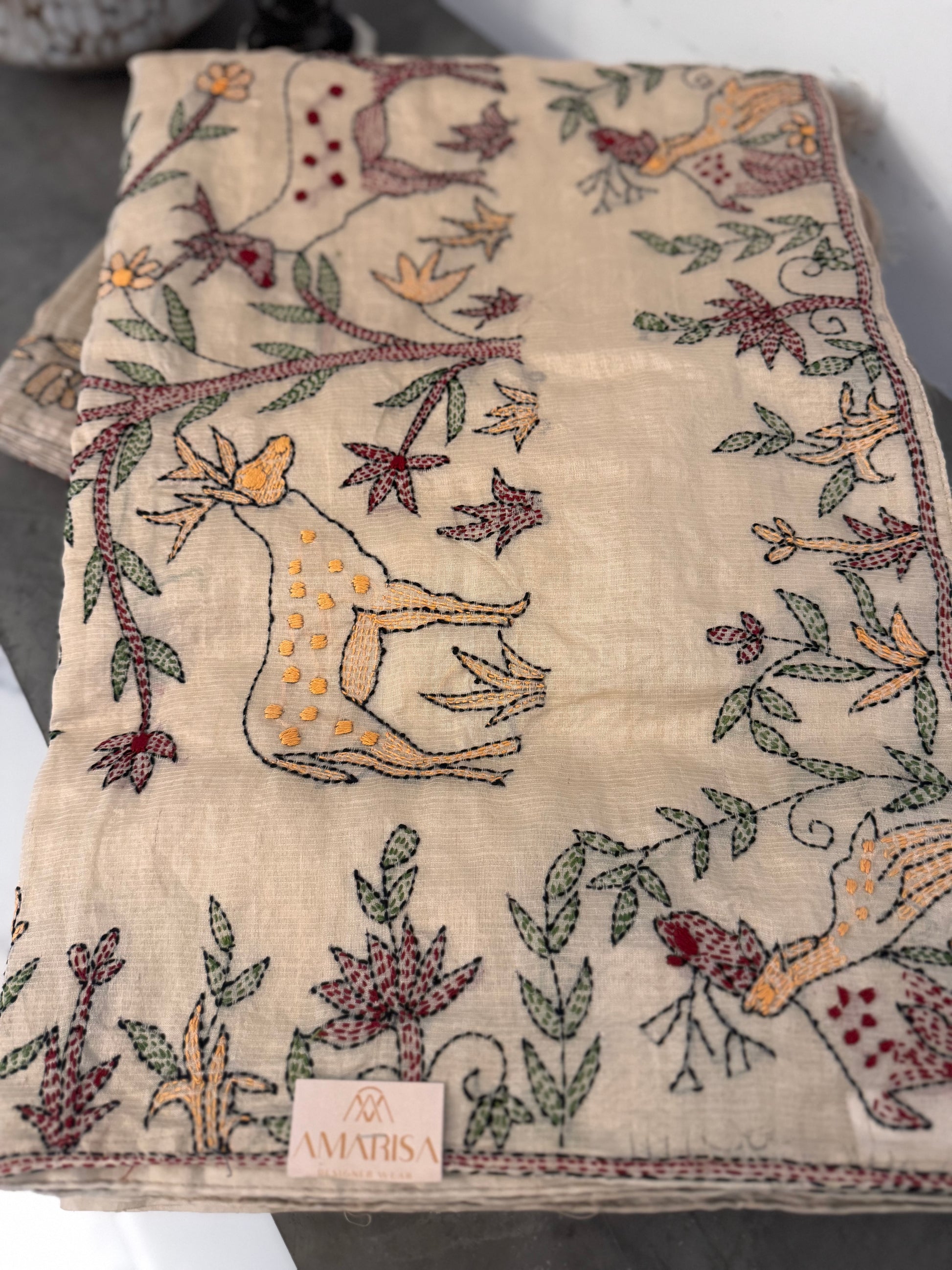 - Work: Kantha-style thread work with deer, birds & floral motifs; scattered sequin highlights